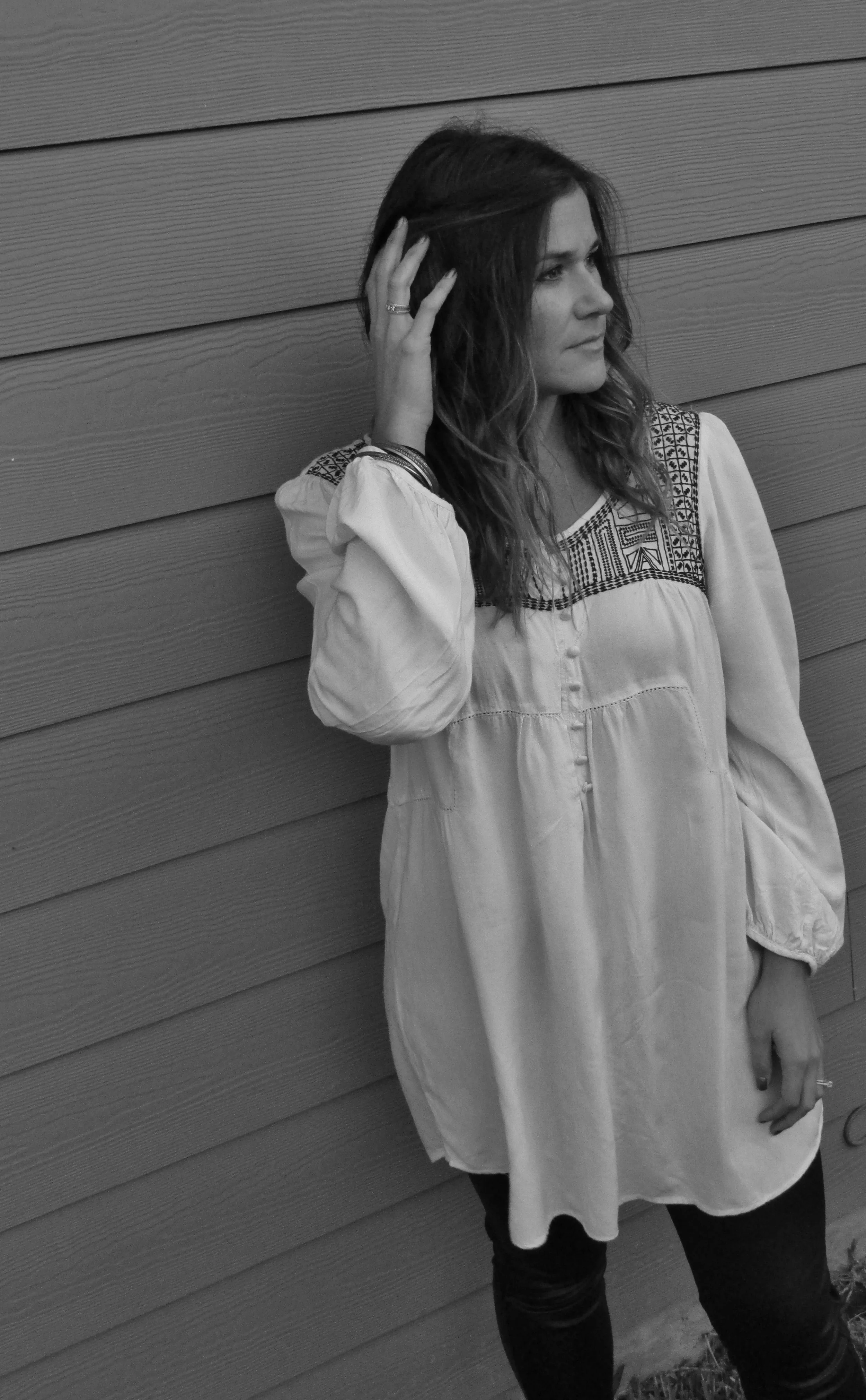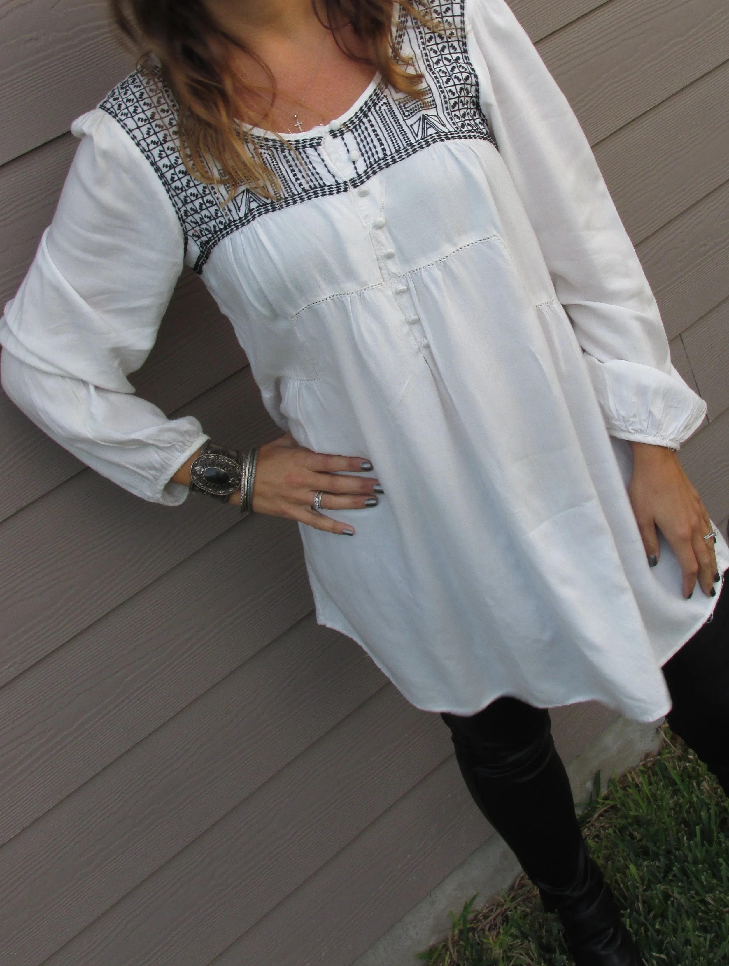 The first look I really loved was pairing the leggings with a great tunic. For me, I of course chose a blouse with some ethnic embroidery, added some great cuffs and bangles, big earrings, some booties and called it a day. You could achieve this same look with another blouse, or a oversized sweater and it would be great also.