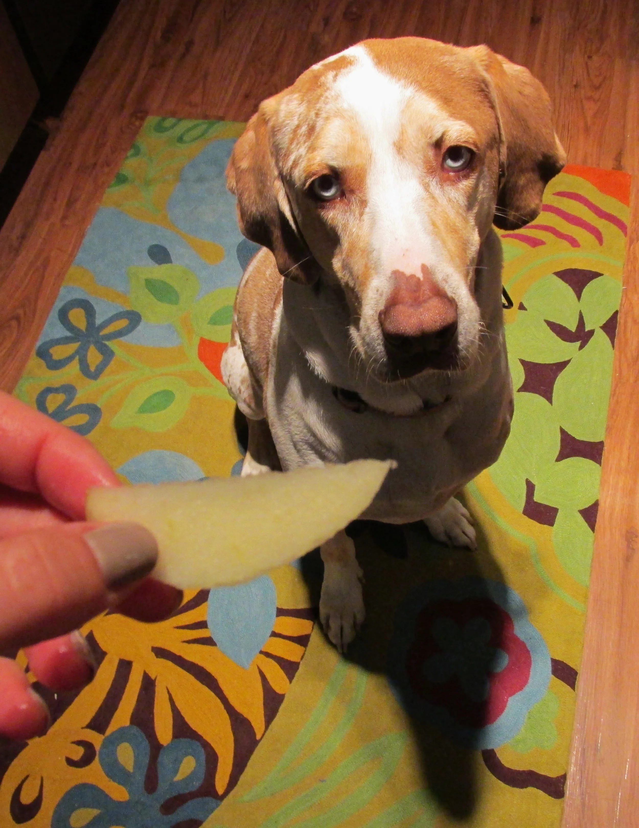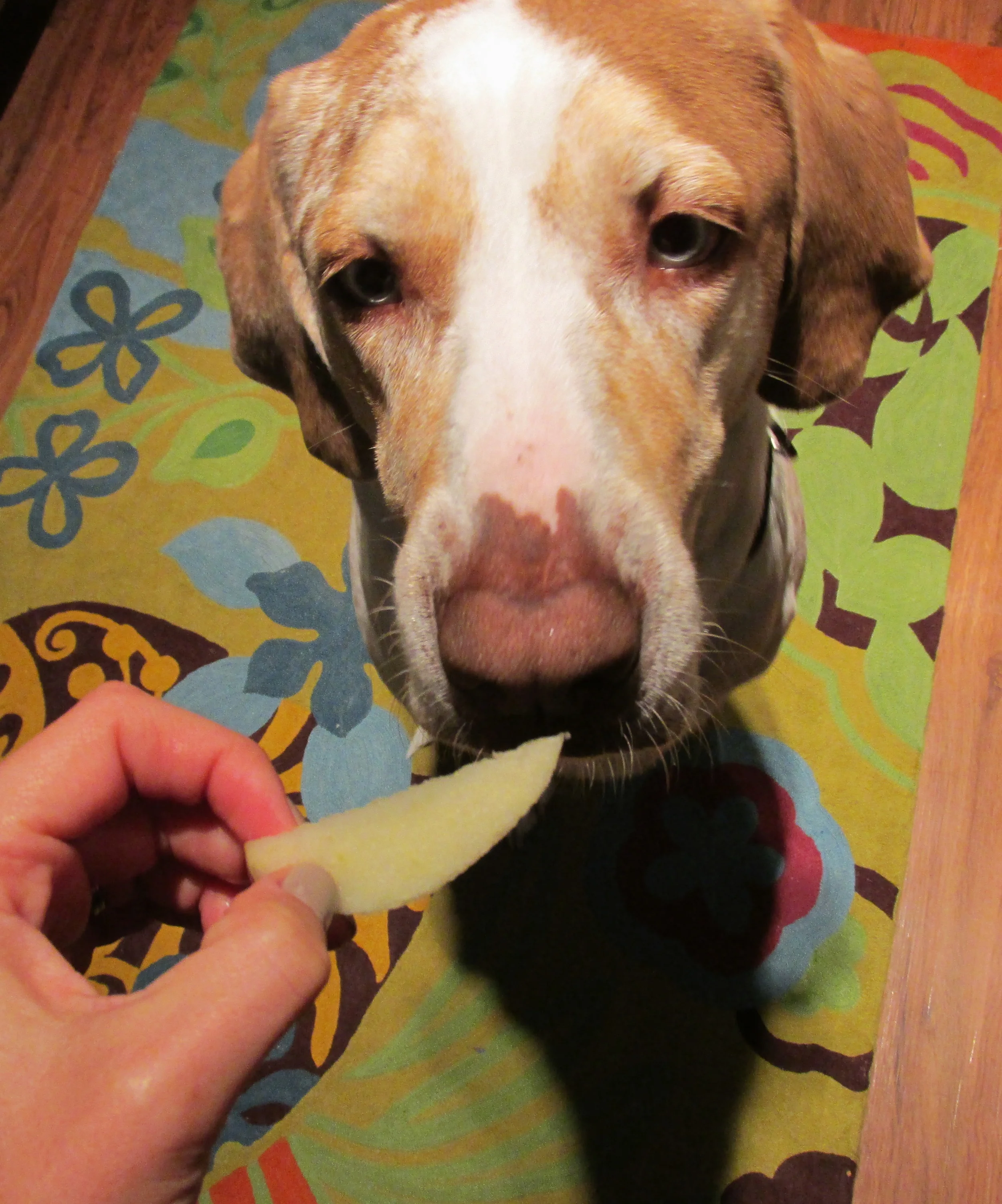 Oh hey Amos...of course you want some apple, don't all dogs? This one happens to love fruit, way more than any dog treat (his brother does not share his opinion.) As soon as he hears me chopping, like clockwork, he comes over and gives me that look...with those eyes. Seriously... He wins every time, I never stand a chance.