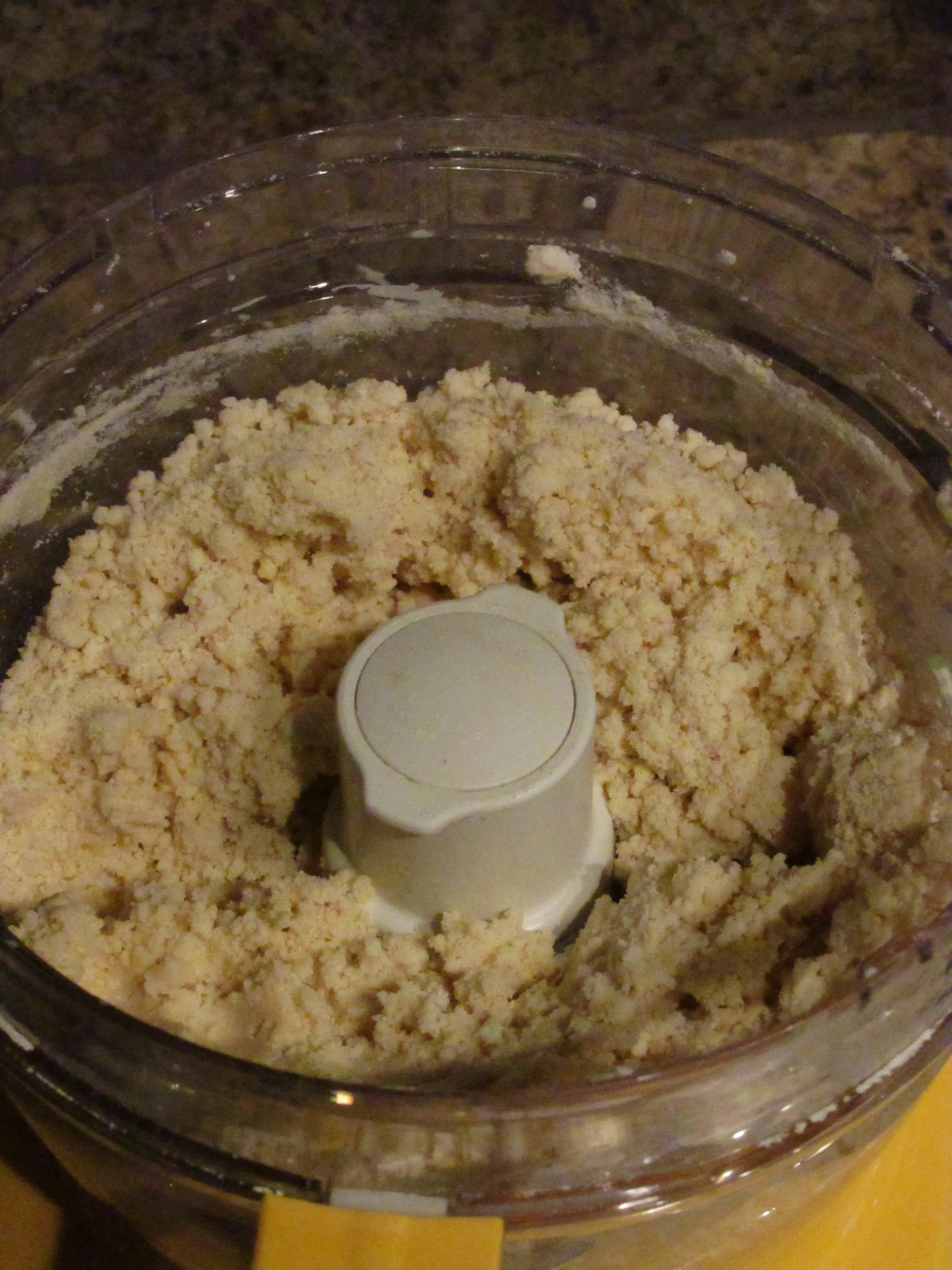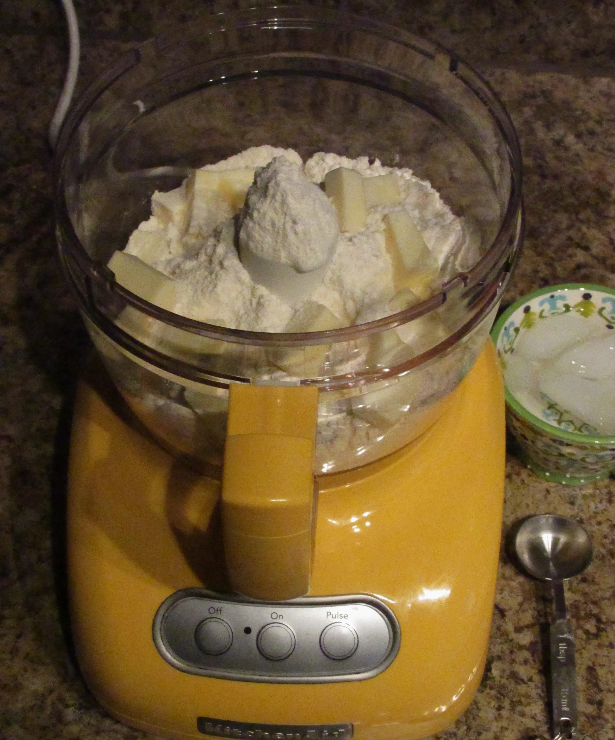 In your food processor add two cups of all purpose flour, your stick of butter cut into small cubes for easier mixing, and your salt. Pulse the mixture until it is the texture of bread crumbs. At this point, you will want to add a tablespoon of ice cold water about 3 tbsp. at a time. Add a little, pulse, add a little more, until the dough sticks together when you pinch it. (No food processor? You can definitely do this by cutting the butter into the flour with a fork or pastry cutter until you get the same texture.)