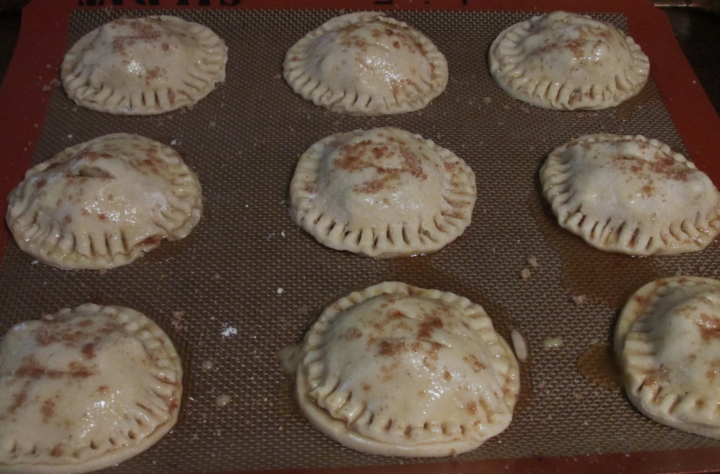 The next step is to place your second dough circle on top of the apple mixture. To close the sides, press the end of a fork (this does not have to be perfect, think rustic and handmade) and work all the way around until ends are sealed. Take a small knife and cut two slits in the top to allow steam to escape when the pies go into the oven so that your crust gets crispy. You will want to make an egg wash (one beaten egg) and brush on top of the pies before they go into the oven so that they will become shiny and have a nice golden color to them. Into the oven they go for 25-35 minutes depending on your oven.