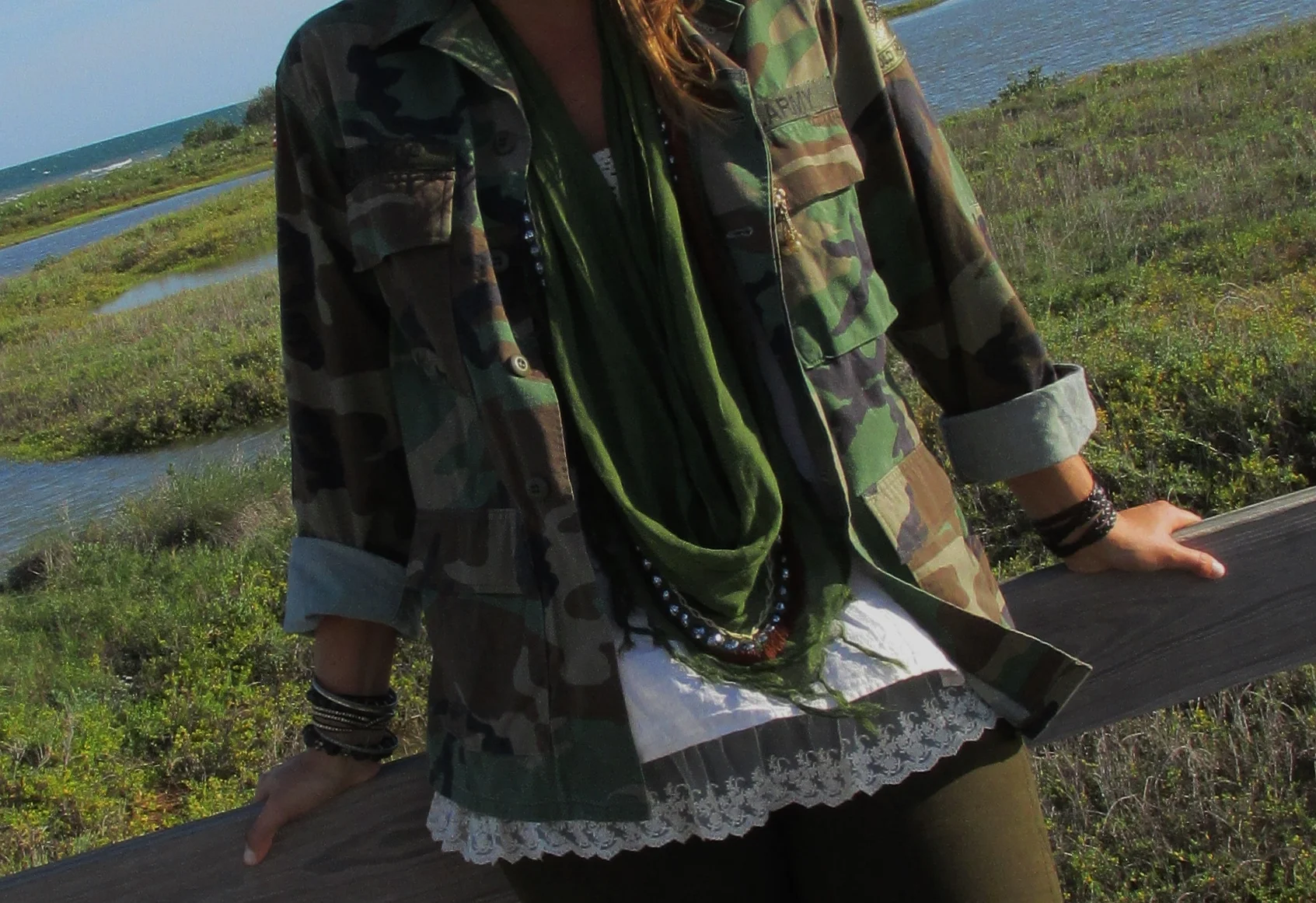 I was in Warrenton, Texas at an antique show when I walked right into a booth that had a ton of these really amazing vintage women's Camo jackets from the 60's-90's, all which had been worn by actual soldiers. I loved the fact that I would be rocking a jacket that represented someone's dedication and sacrifice for our country! So after about 45 minutes in 125 degree heat and by now, dripping with sweat, I decided on the one for me. Not to mention it was only 25 bucks! Talk about a steal, I had to send a pic to my husband and show him what a bargain I had found, I am not sure he was as excited as me, but oh well! Needless to say, this ended up being my favorite purchase of the weekend and I was pretty pumped to bring the jacket home and give it a new life! The heat in Texas has just now cooled down enough to where I can even think about wearing it, so I thought I would share two of my favorite ways to wear Camo this fall.