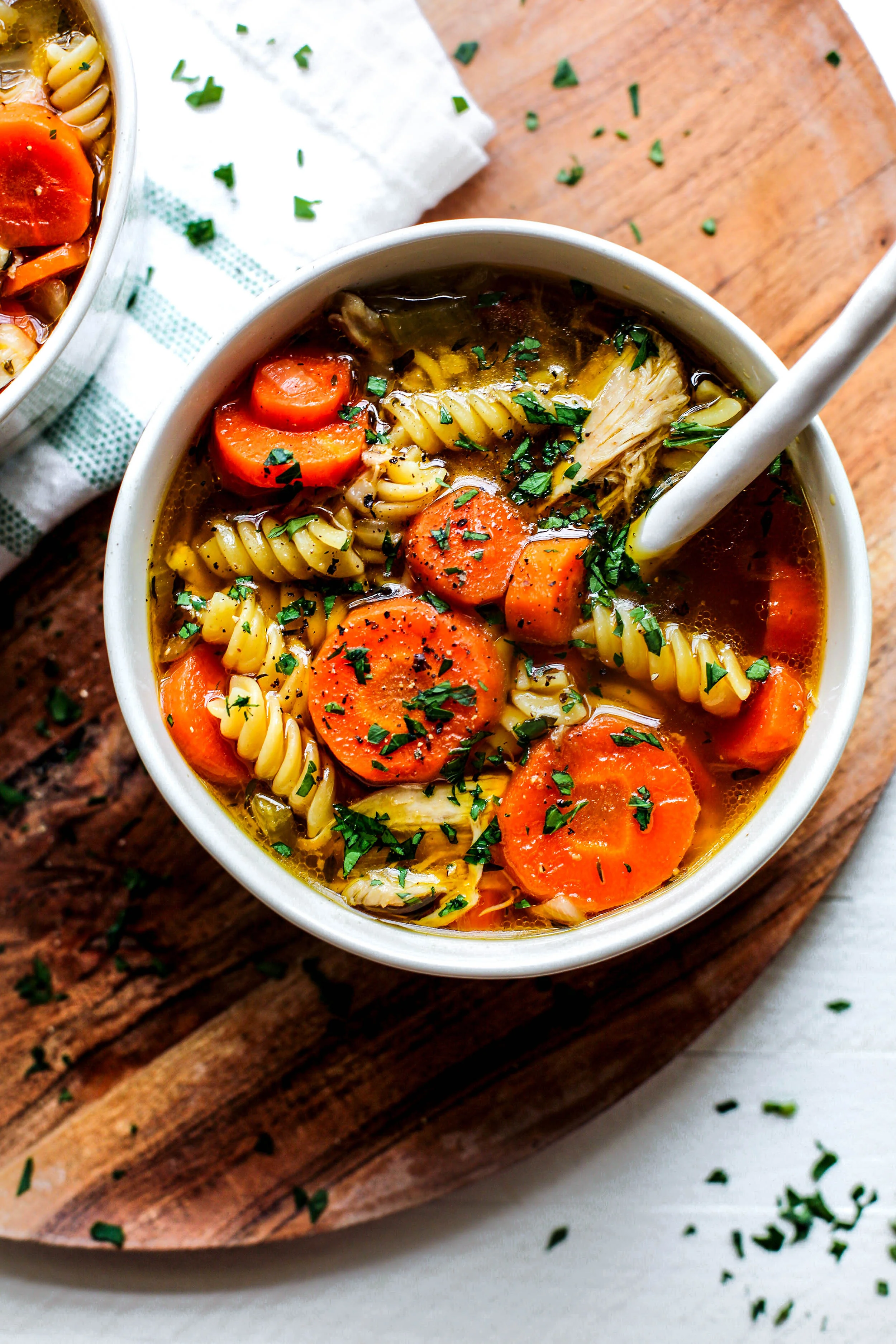 I have memories of being sick growing up and eating a bowl of canned chicken noodle soup and not loving it. Matter of fact, I would have been fine never having another can ever in my life. It wasn’t until I became an adult and had homemade chicken noodle soup that I actually realized what all the fuss was about. There is a complexity in flavors from a homemade soup that a can cannot compare to. I like to make my own broth too which makes the soup that much better in my opinion and worth the extra effort. However, if you don’t have time a store bought broth will work just fine here. My homemade chicken noodle soup is so comforting and delicious and you are definitely going to be making it over and over again.