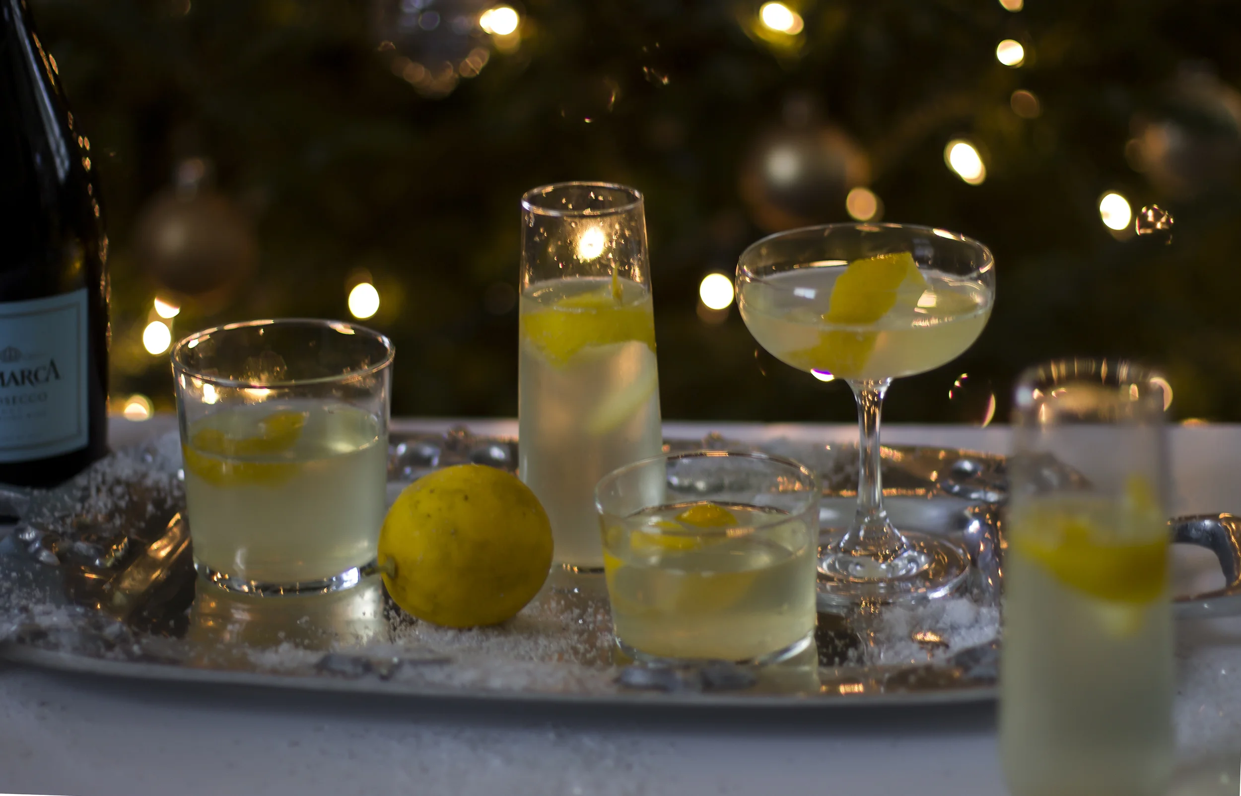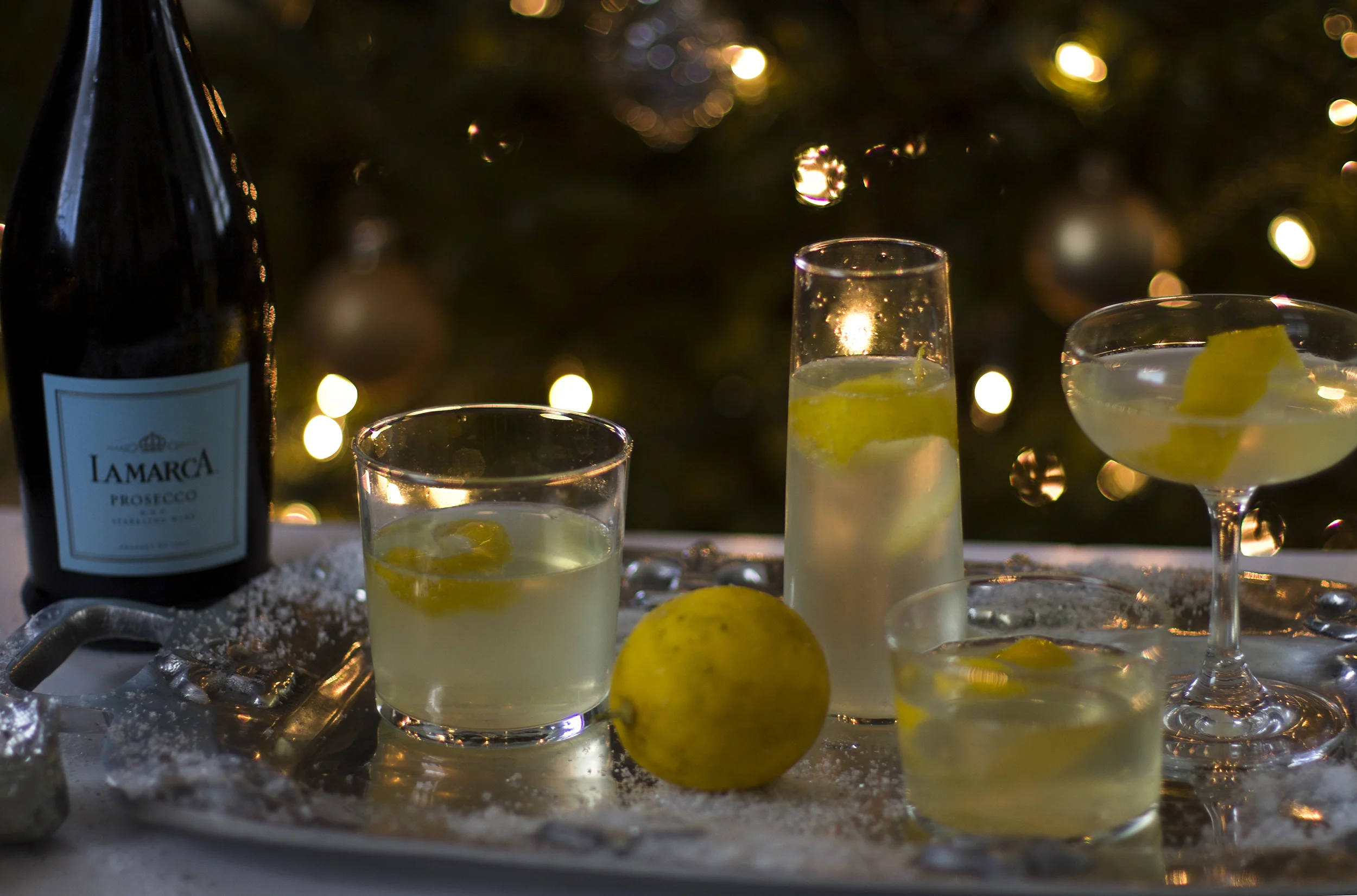 - Put one tbsp. of ginger simple syrup and one tbsp. of lemon juice in the bottom of your cocktail glass and top off with prosecco. Garnish with a peel of lemon skin. Repeat with the rest of the glasses.
