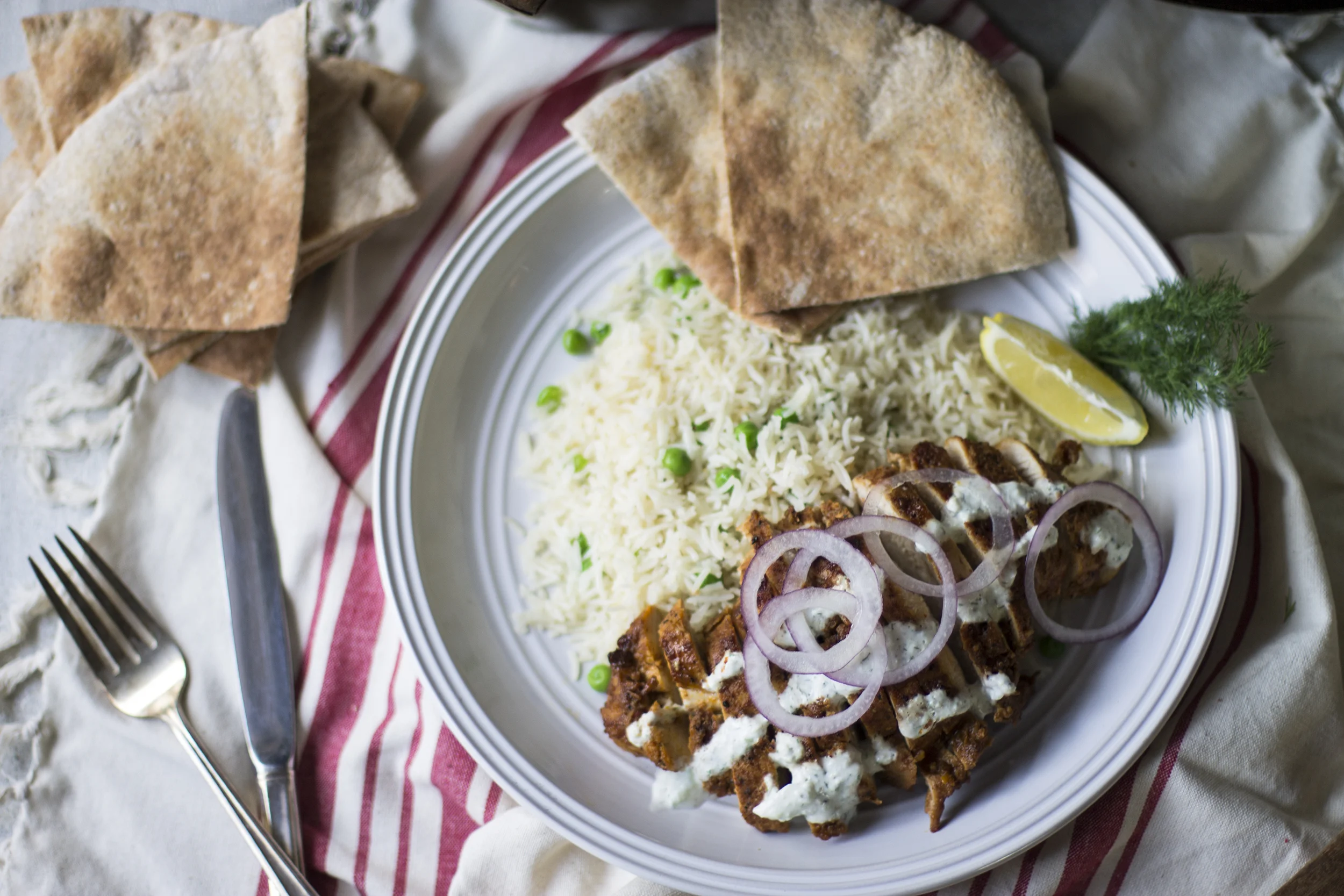 Serve chicken over the rice with a drizzle of tzatziki and sliced fresh red onion.