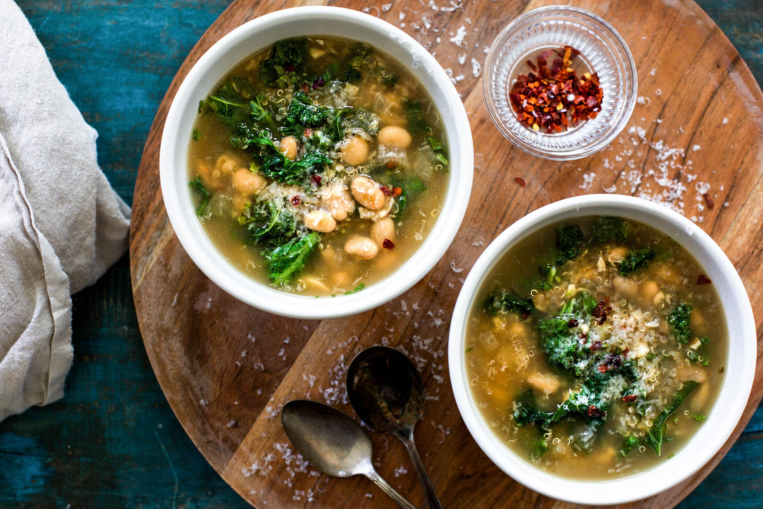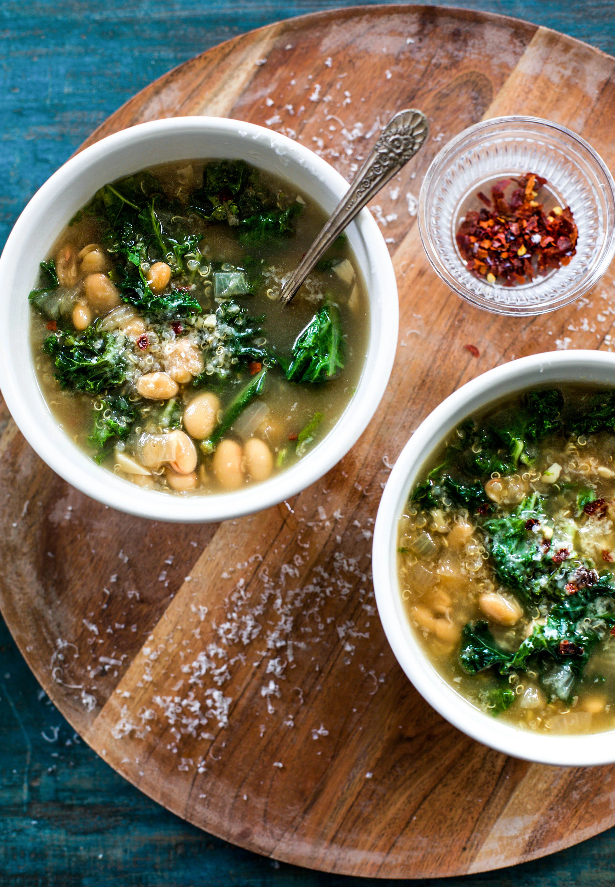 I don't know if you are like me, but with all of this cold weather I cannot get enough soup in my belly. Some days it's the only thing other than a hot bath that will warm me up at all! Well this week has been no different in the weather department and as I stood in the fridge trying to decide what to make for lunch one afternoon, all I had was salad stuff...cold salad stuff. Brr...that was clearly not going to work...I needed something warm, but still good for me. Enter easy peasy kale, white bean, and quinoa soup…hearty, healthy, and so delicious!
