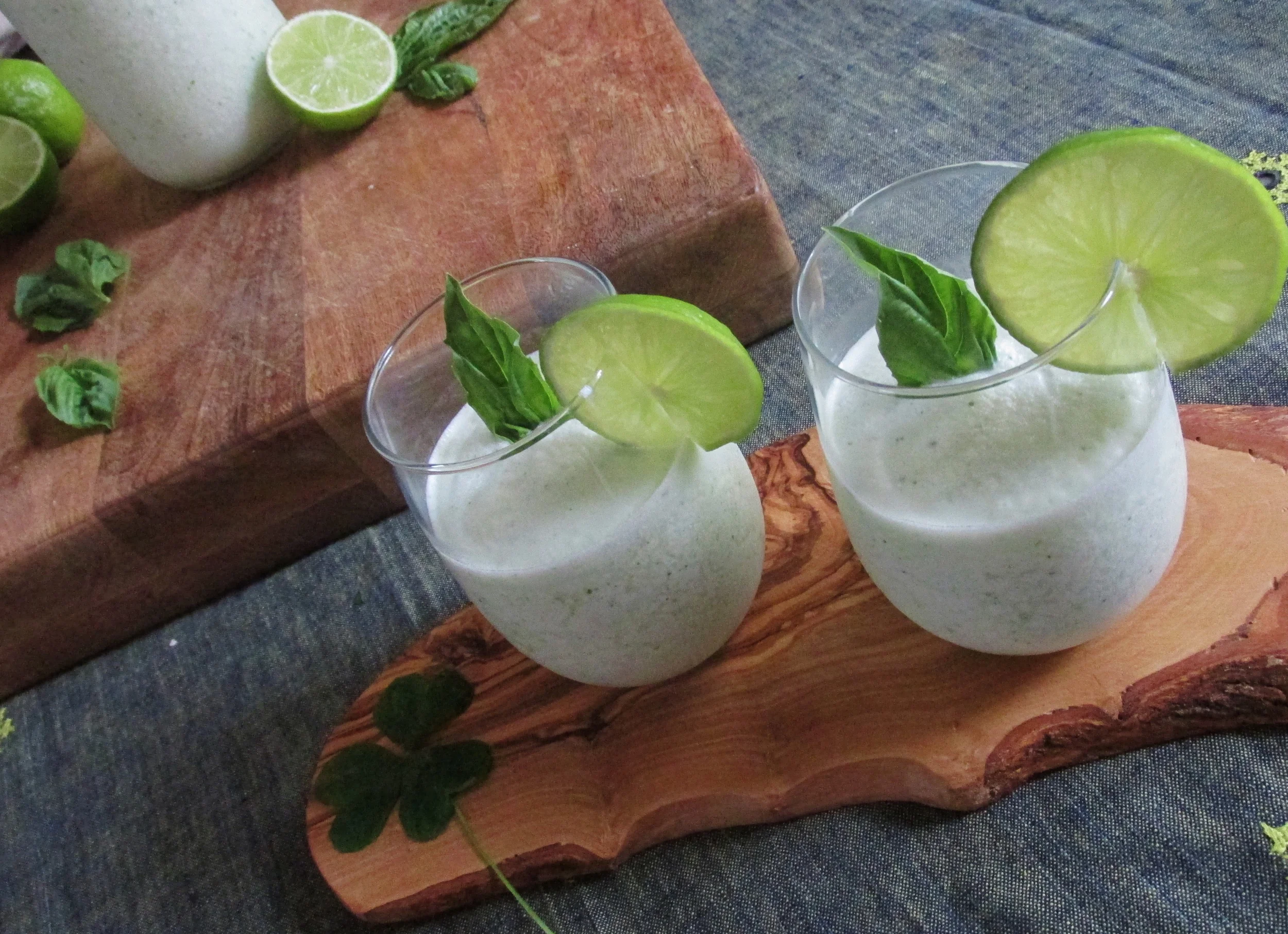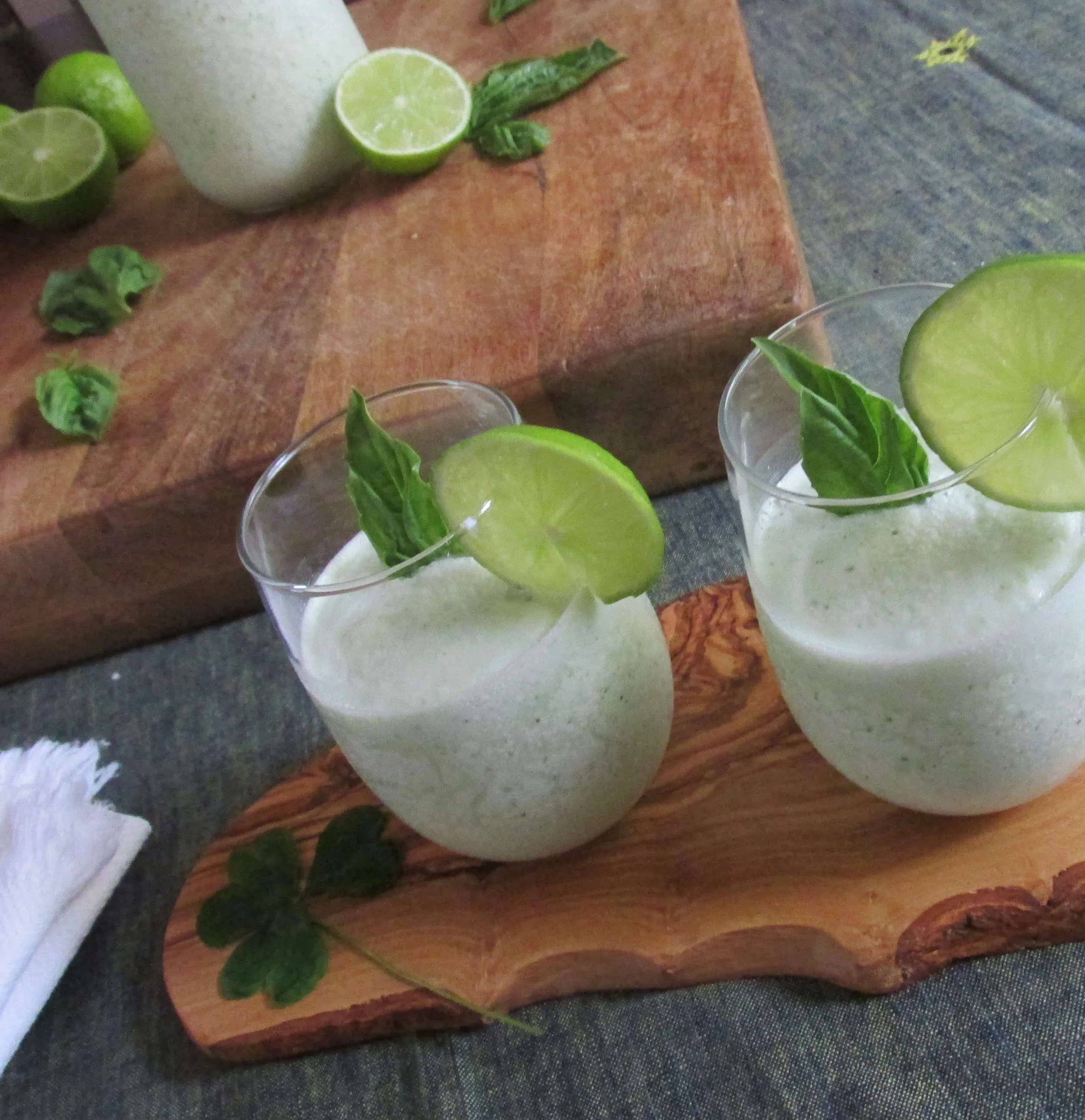 -Blend until the drink is smooth and creamy. Garnish with slice of lime and a basil leaf.