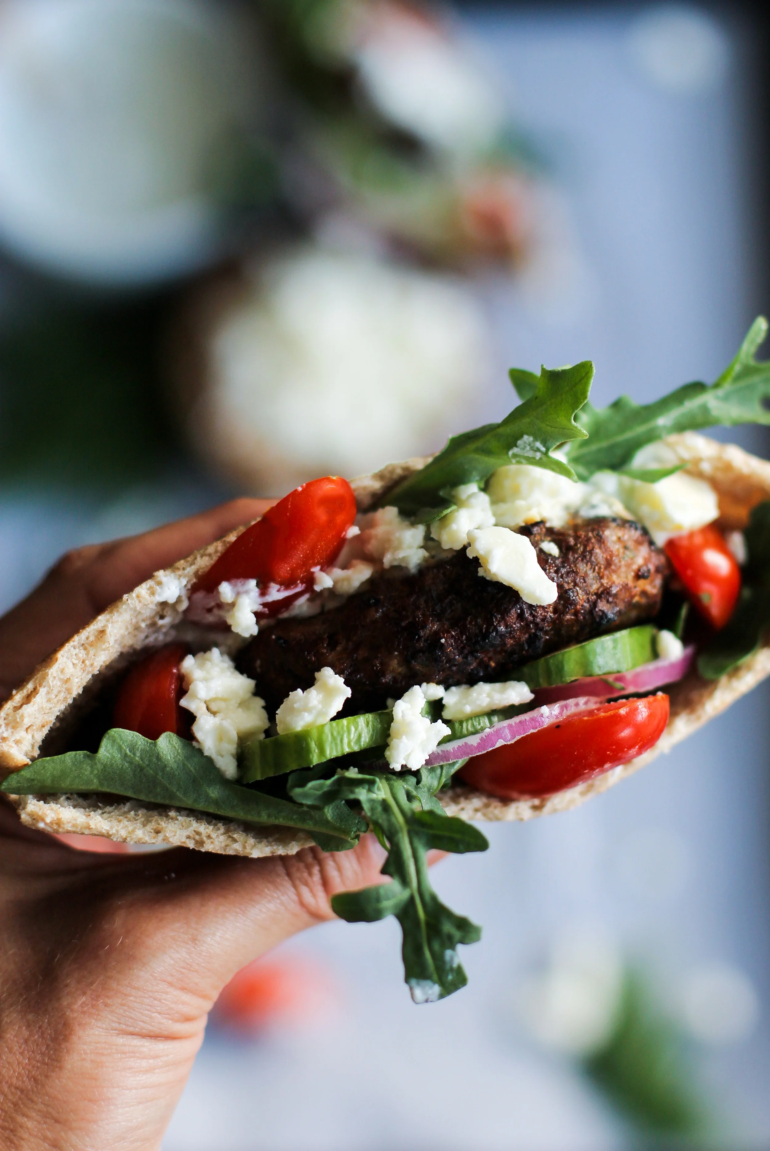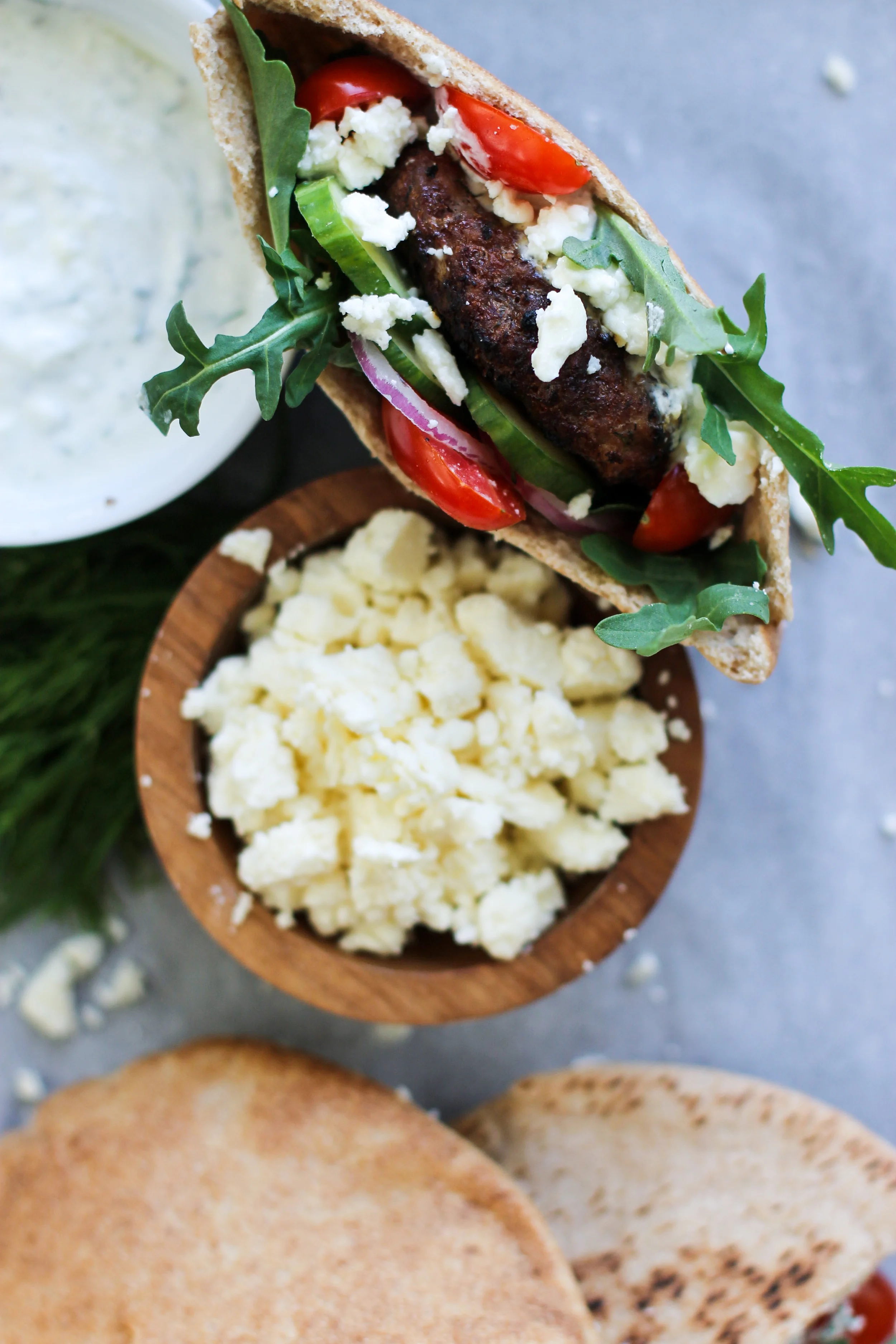 - Slather the inside of the pita with tzatziki sauce, layer your veggies, feta cheese and then add burger.