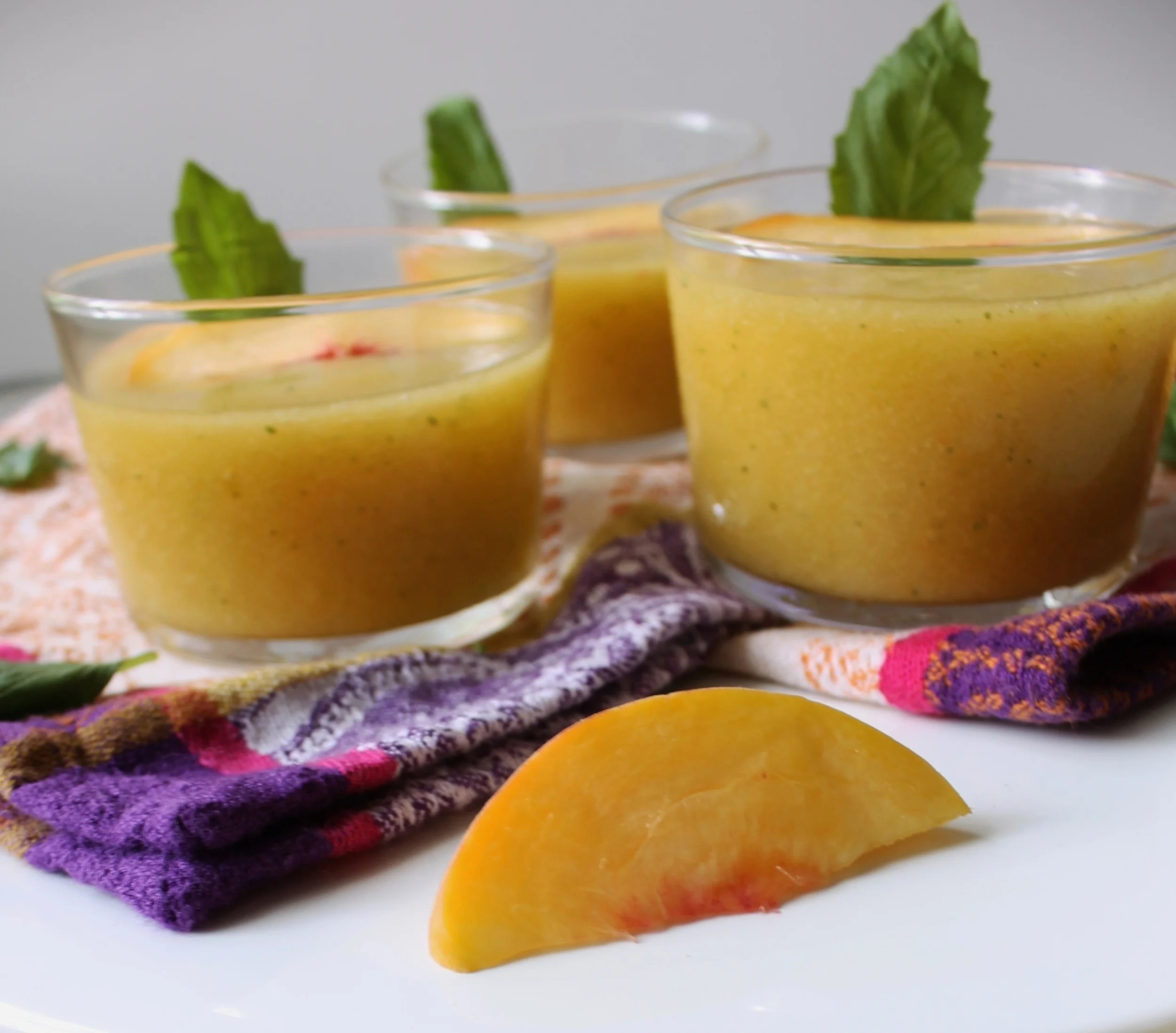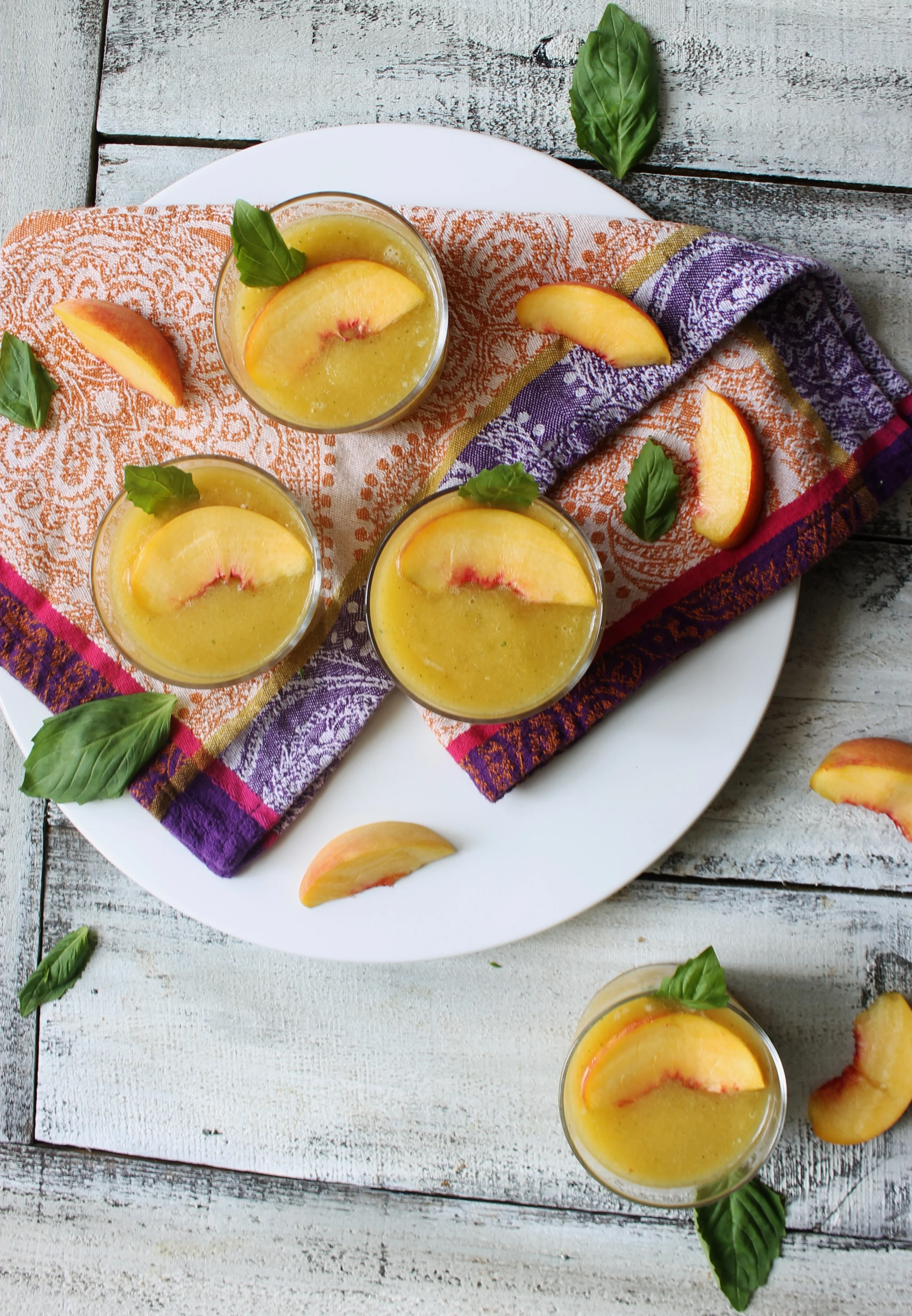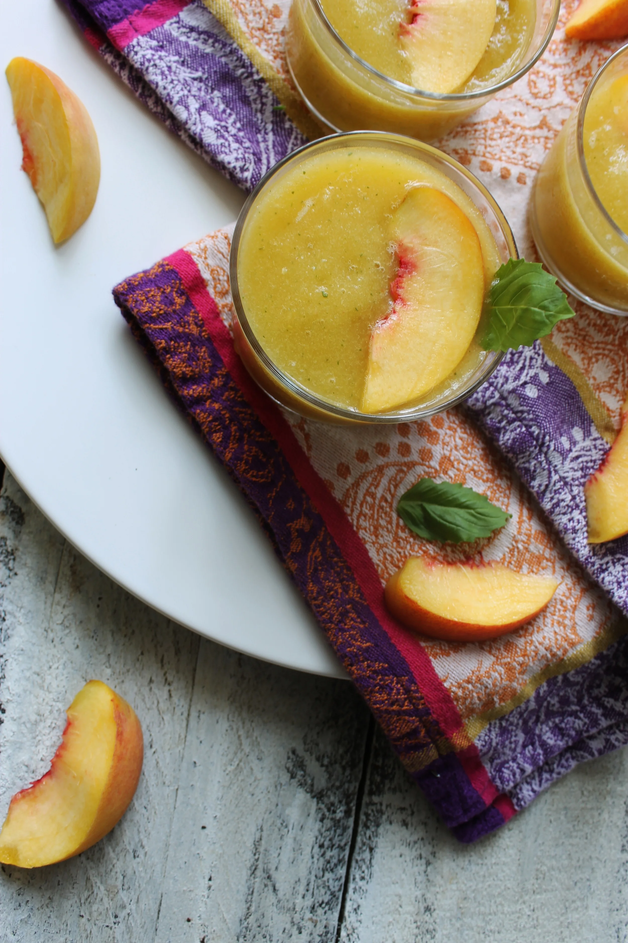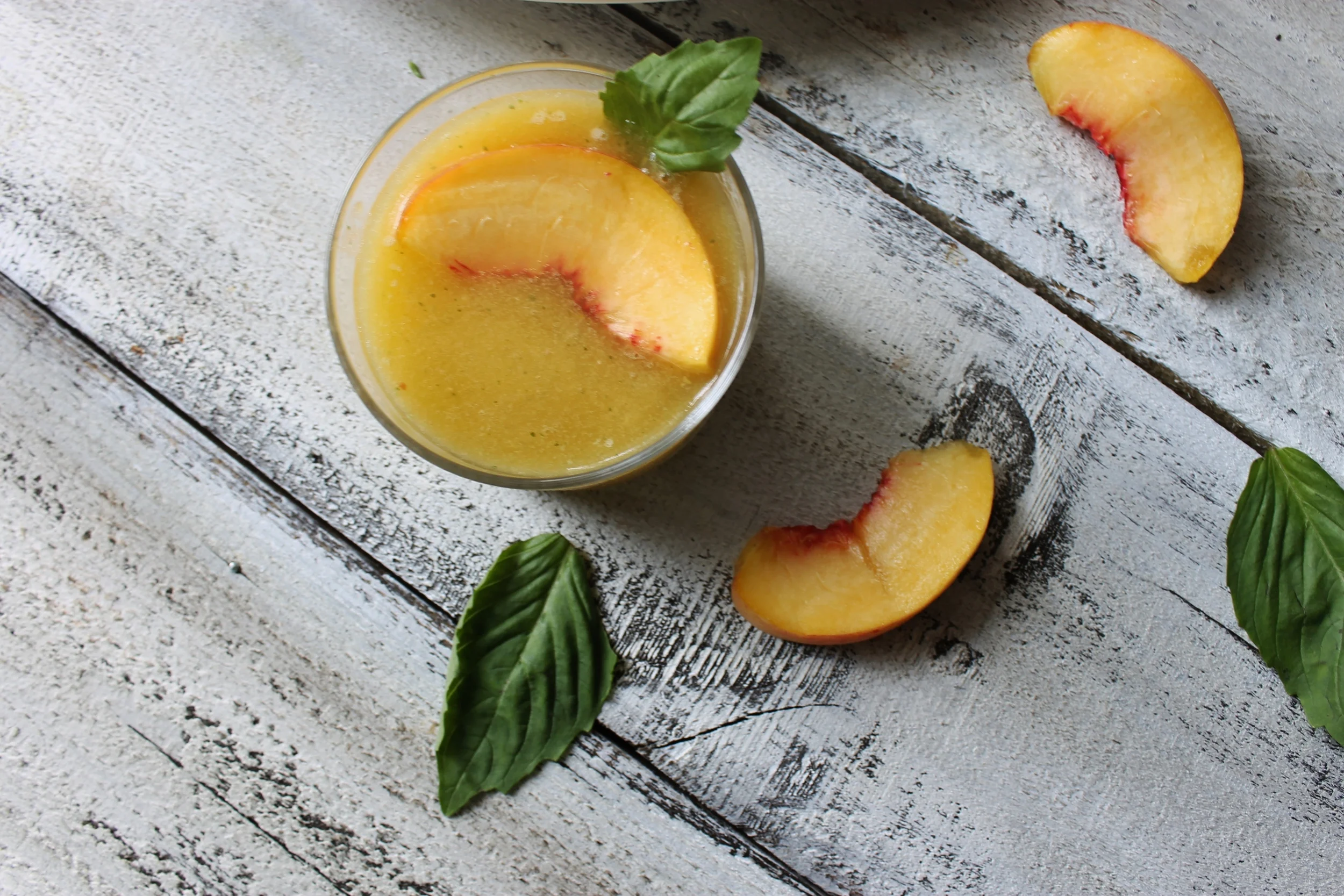 - Garnish with a fresh peach slice and a basil leaf and serve!