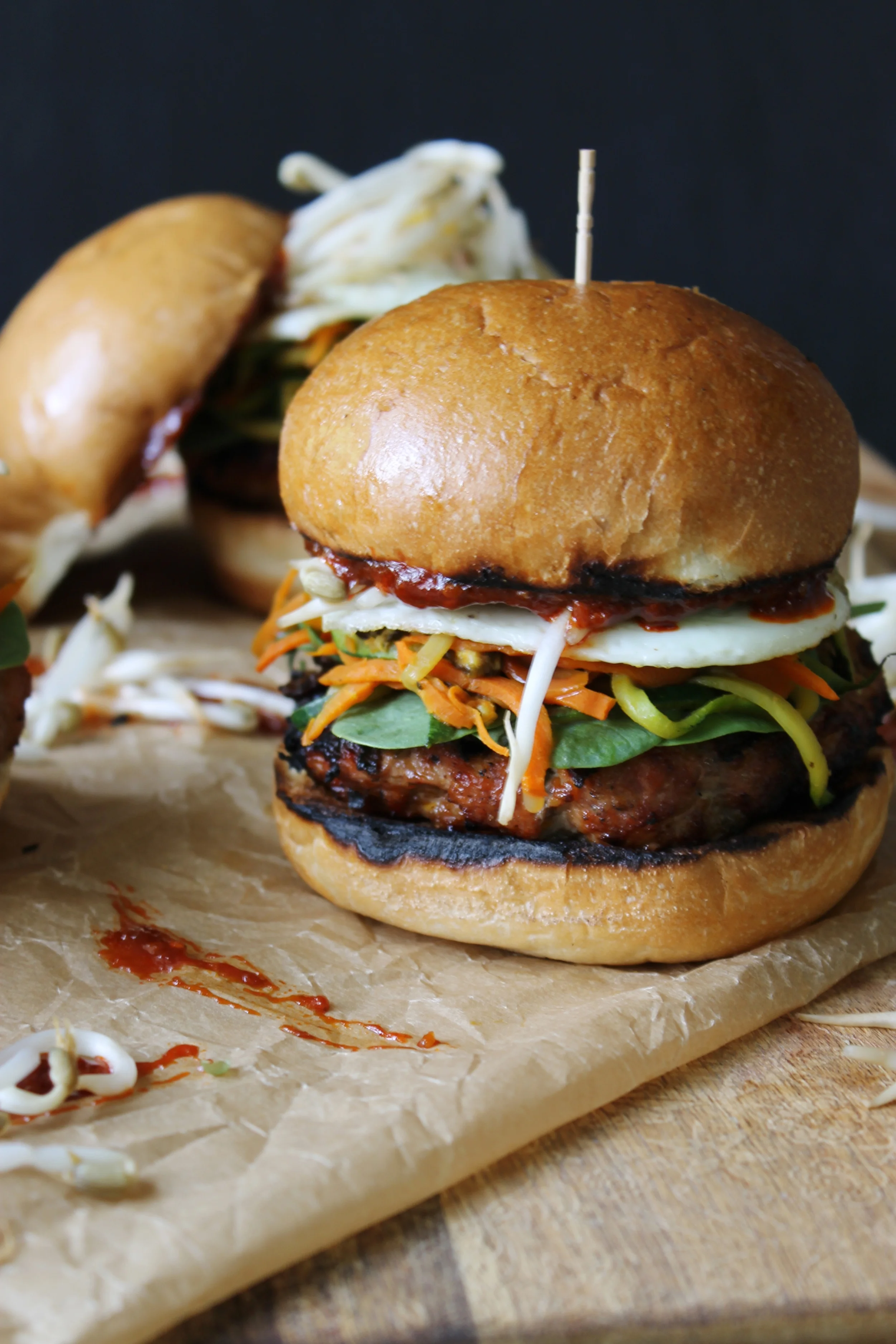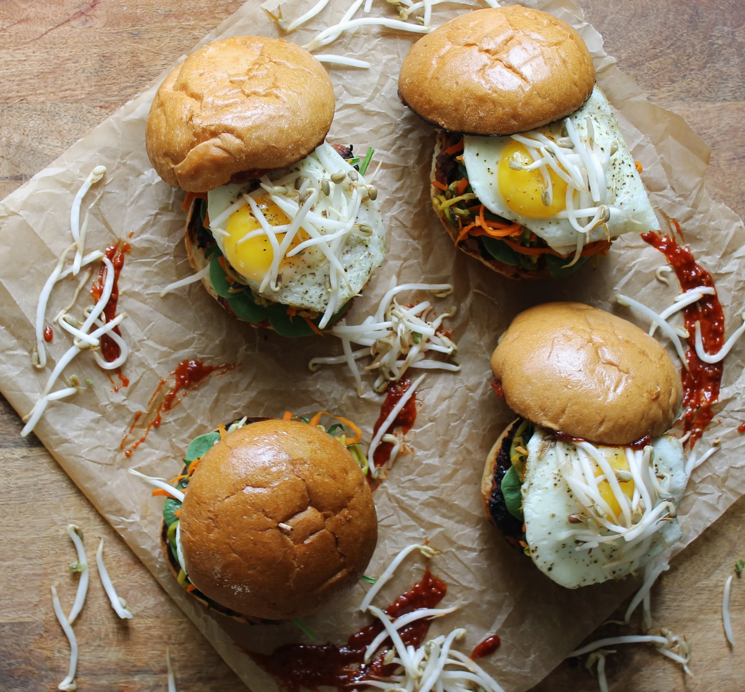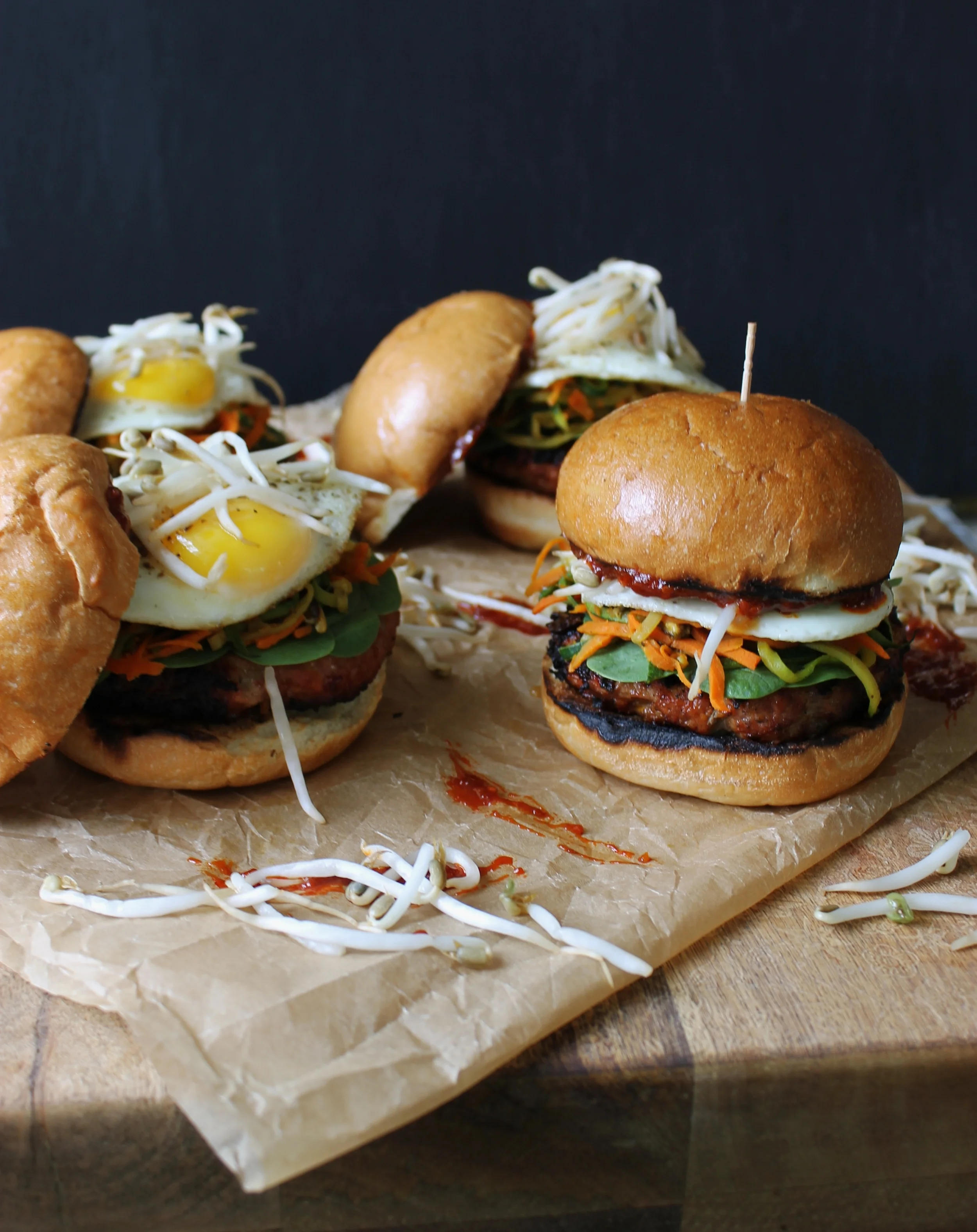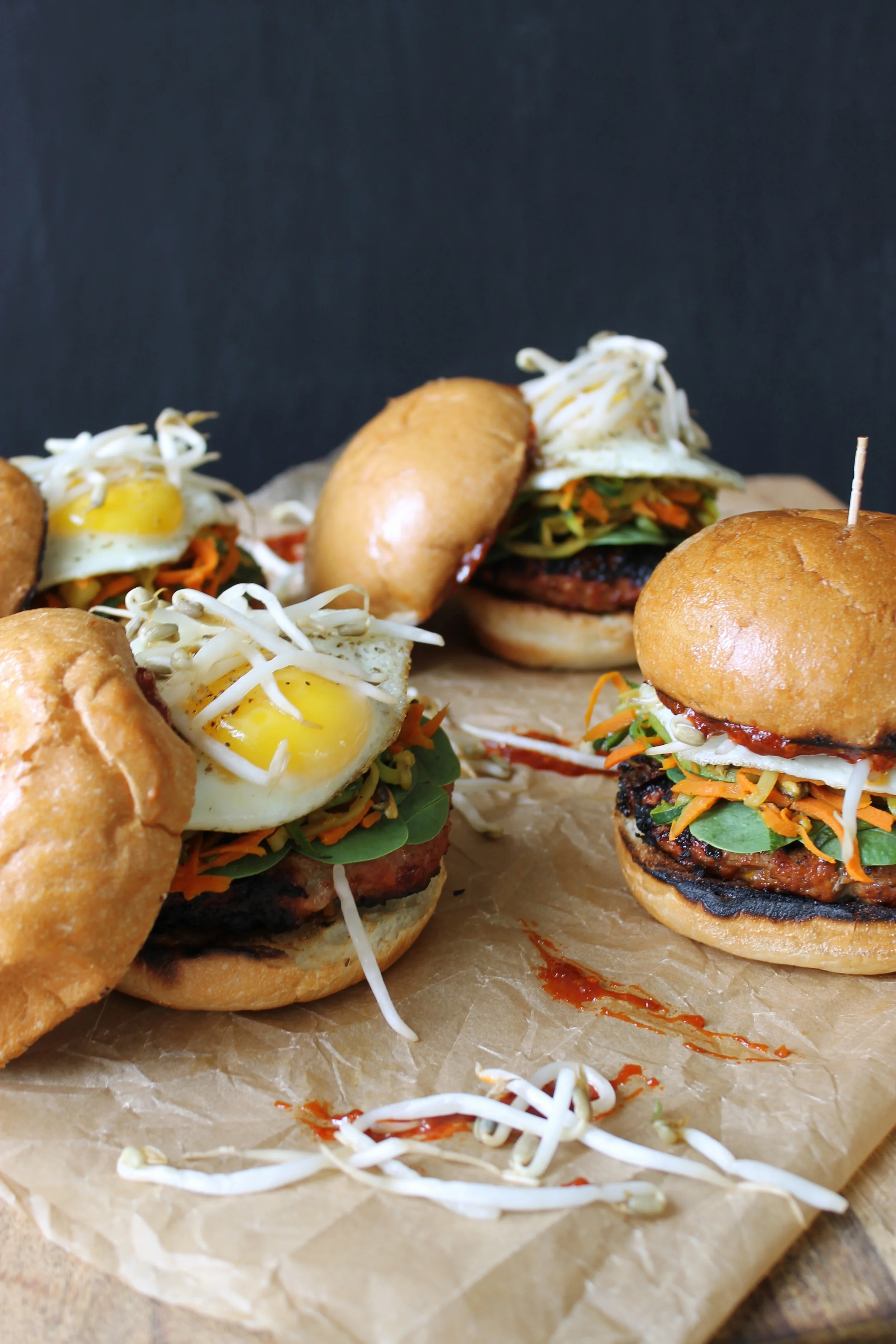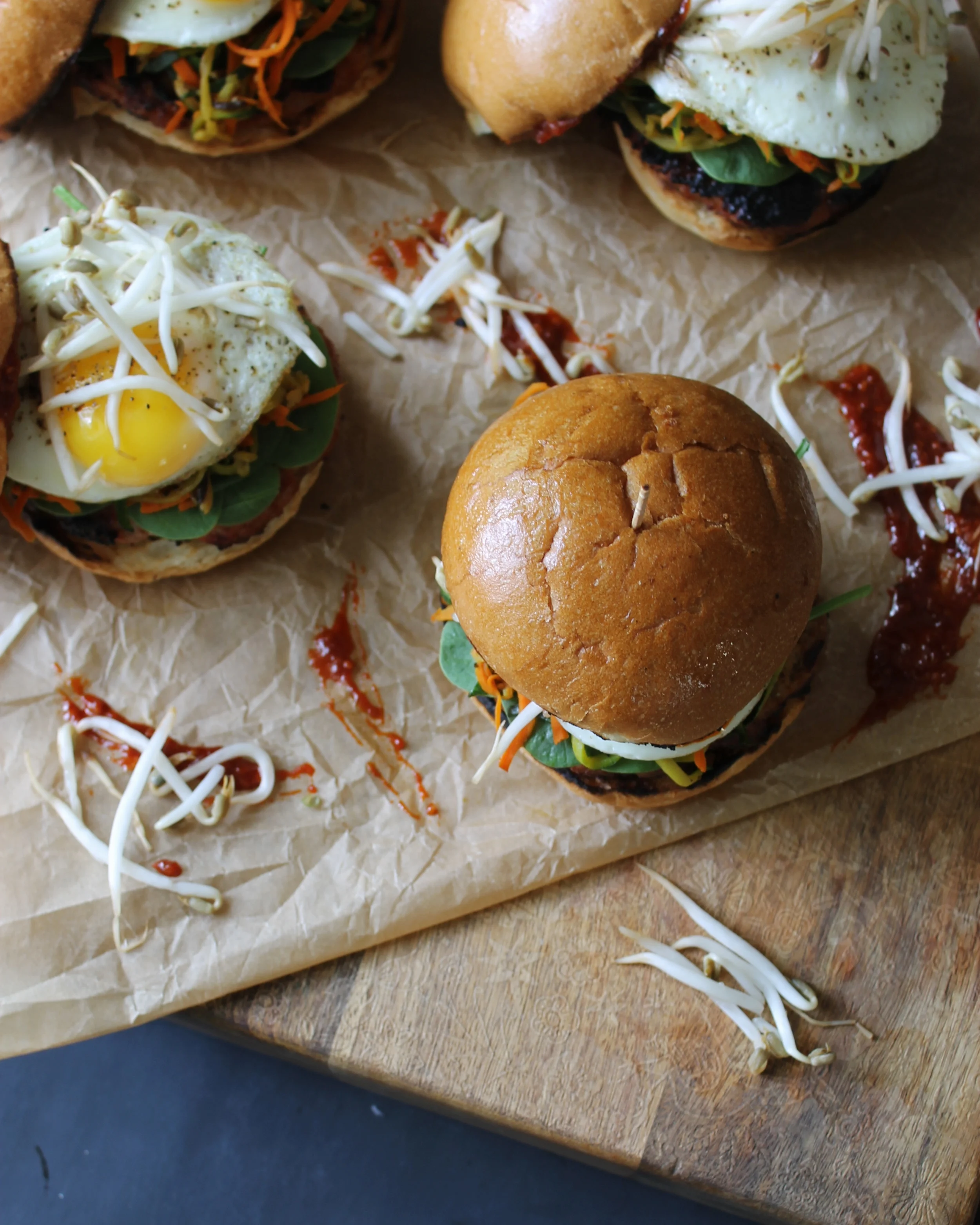 - To assemble, place your burger on the bottom of the bun, layer some fresh spinach, some of the sautéed veggies, your fried egg, and then your bean sprouts. Spread some a good bit of the Gochujang on the other half of the bun and place on top.