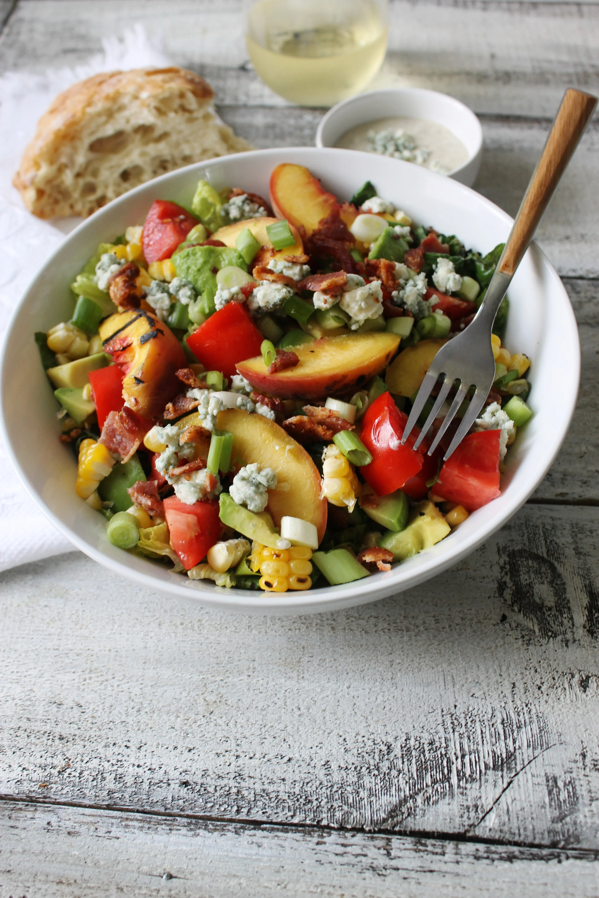 I love updating a favorite salad with whatever ingredients are in season and that happen to be at the market.  One of my favorite salads is a cobb salad, and really you add any ingredients that tickle your fancy.  This week, I decided to grill some of the components to get a smoky flavor mixed with the other veggies.  The grilled peaches add a nice sweetness, and then it's brought all together with a creamy homemade low-fat blue cheese dressing!