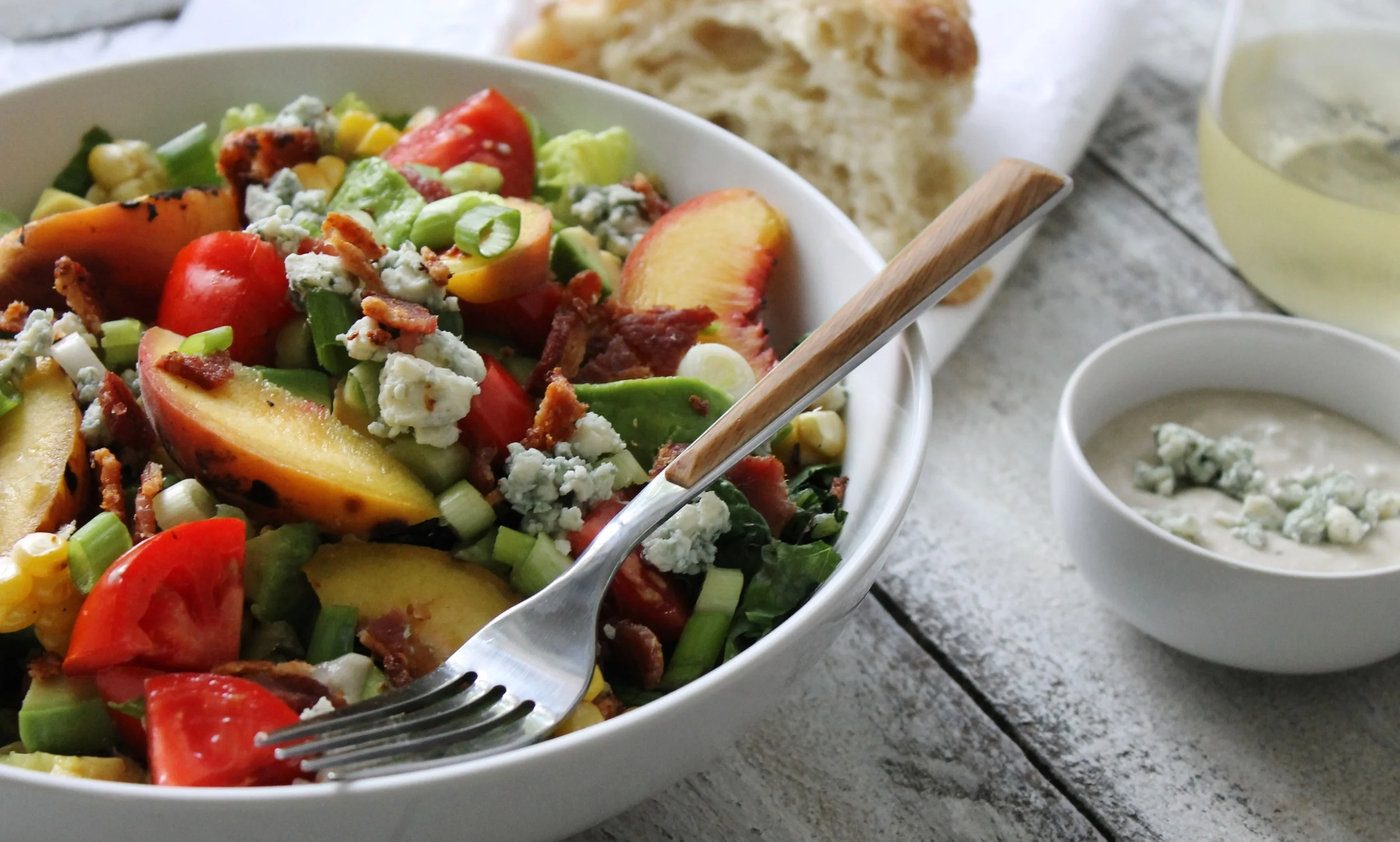 I love updating a favorite salad with whatever ingredients are in season and that happen to be at the market. One of my favorite salads is a cobb salad, and really you add any ingredients that tickle your fancy. This week, I decided to grill some of the components to get a smoky flavor mixed with the other veggies. The grilled peaches add a nice sweetness, and then it's brought all together with a creamy homemade low-fat blue cheese dressing!