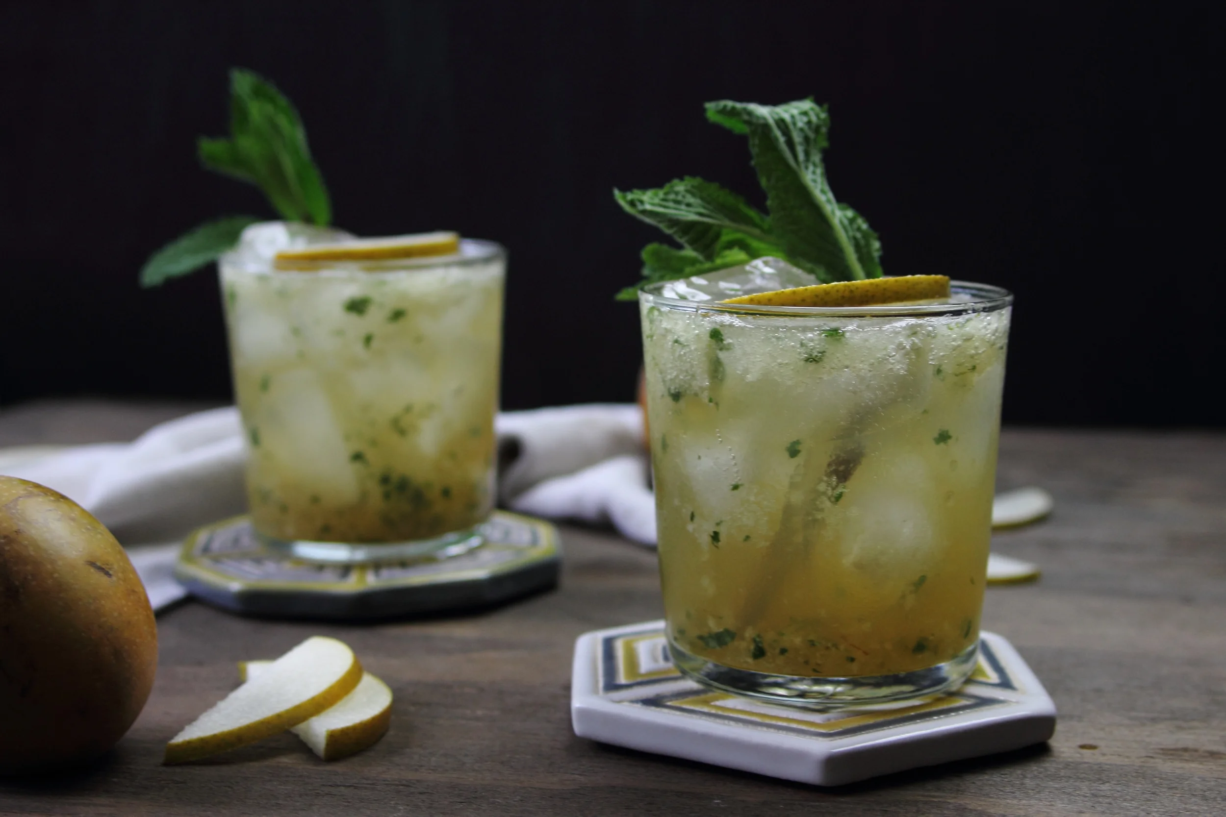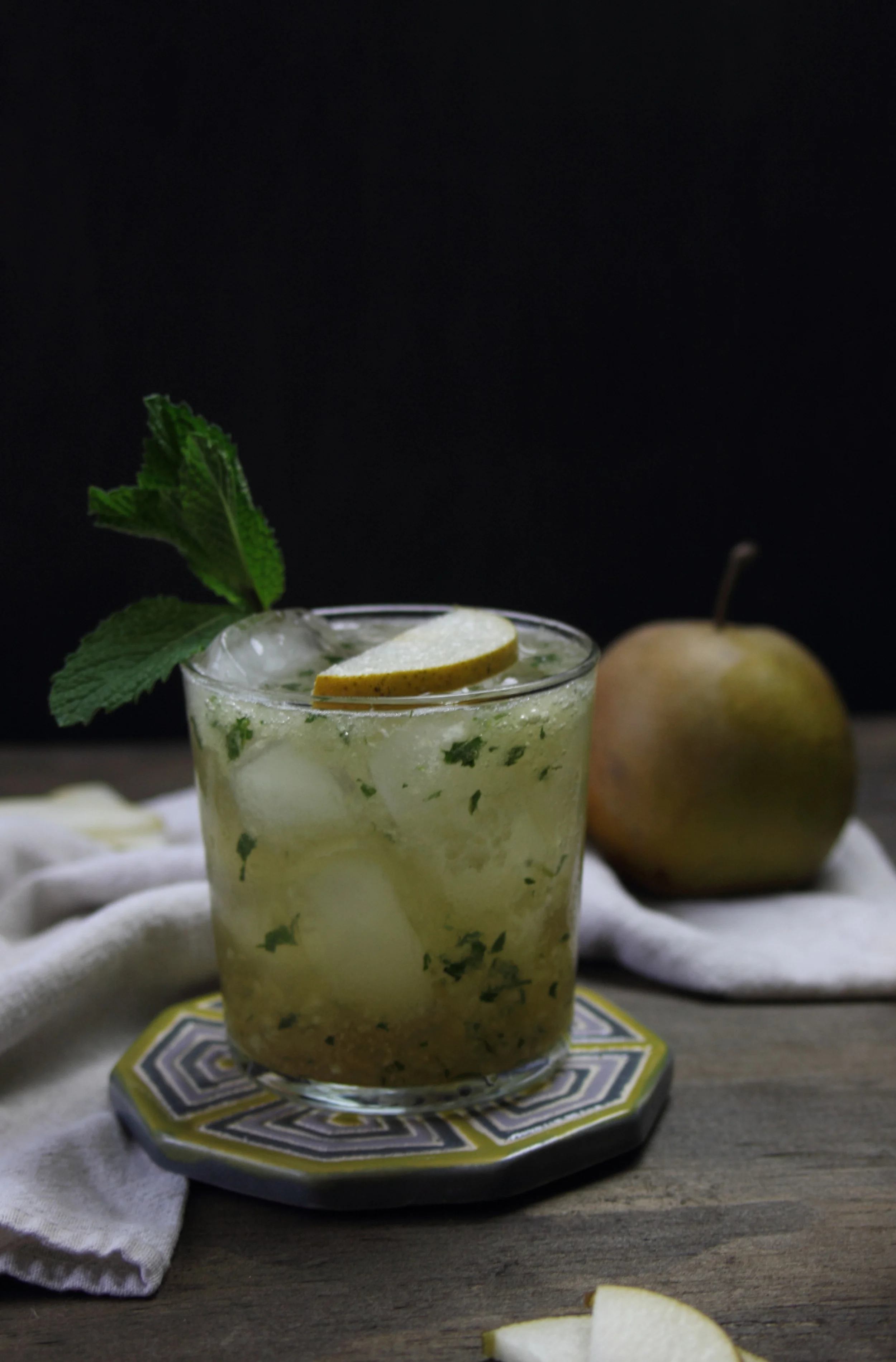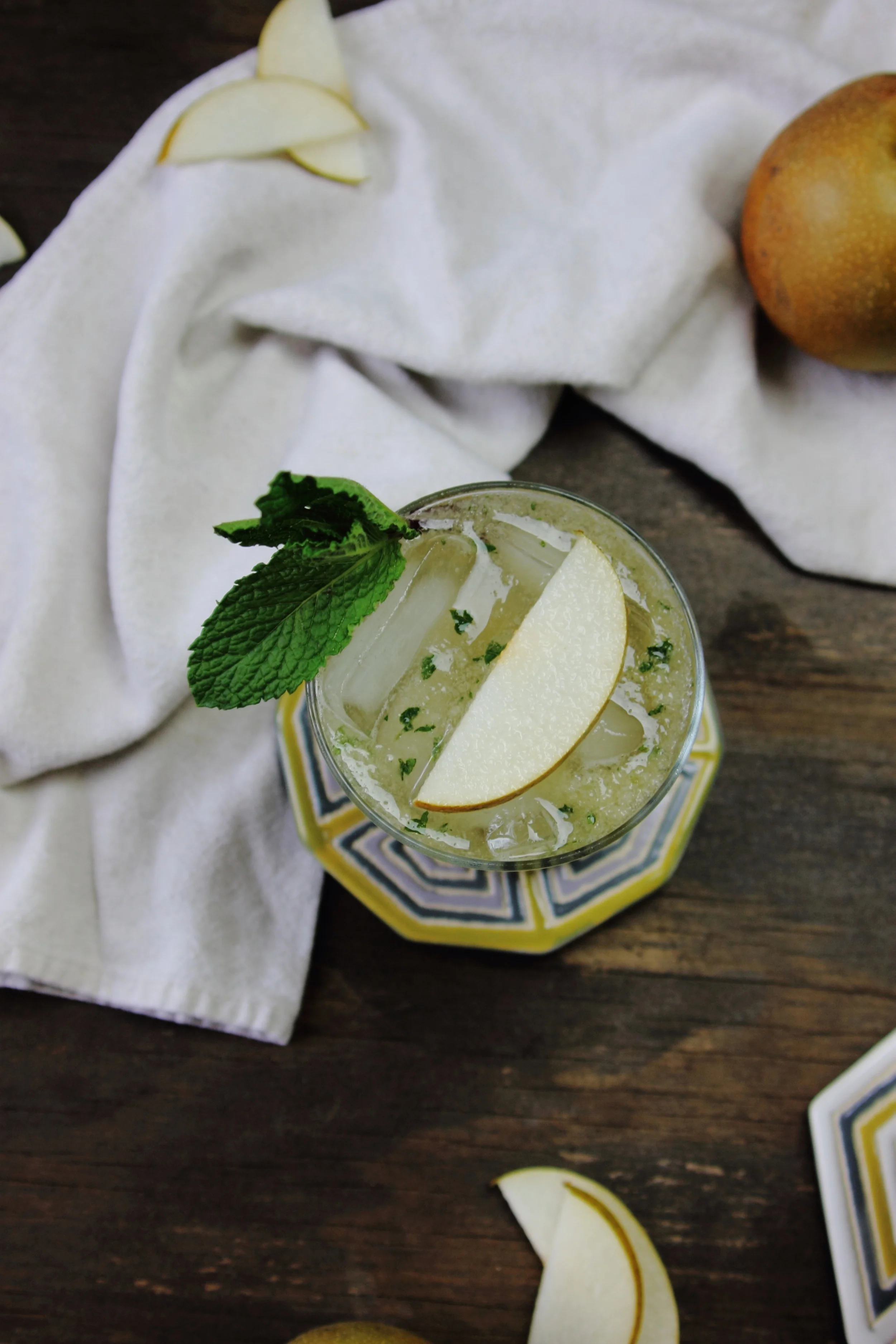 This is my only way to celebrate fall coming since the weather has still not cooperated in giving me a break from the heat. And why not celebrate with a delicious Asian pear and mint bourbon sparkler?