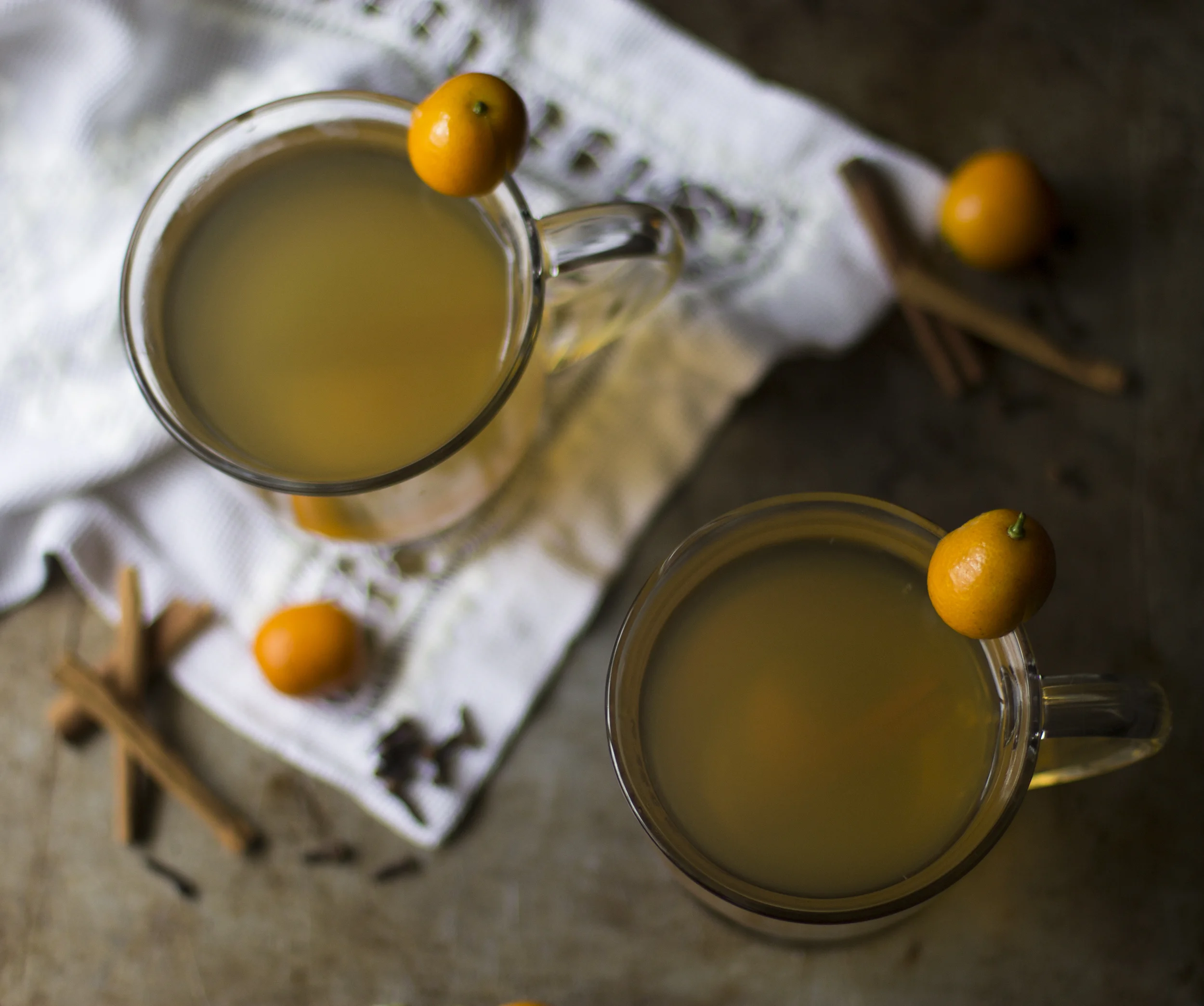 Don't worry if you have no idea what a kumquat is...it's a tiny little cute thing that resembles the taste of an orange but with a little more sour added in. You can eat the skins and all and it's the perfect twist on an original hot toddy recipe. They grow all over on trees here in Louisiana, but if you can't find them or don't like them just swap them for satsumas or regular oranges. Both would work beautifully. But how cute are the kumquats? And you get to say kumquat, which is pretty fun. Kind of sounds like a name you would call someone..."you are being such a kumquat." No? (I may or may not be laughing out loud...to myself right now.)