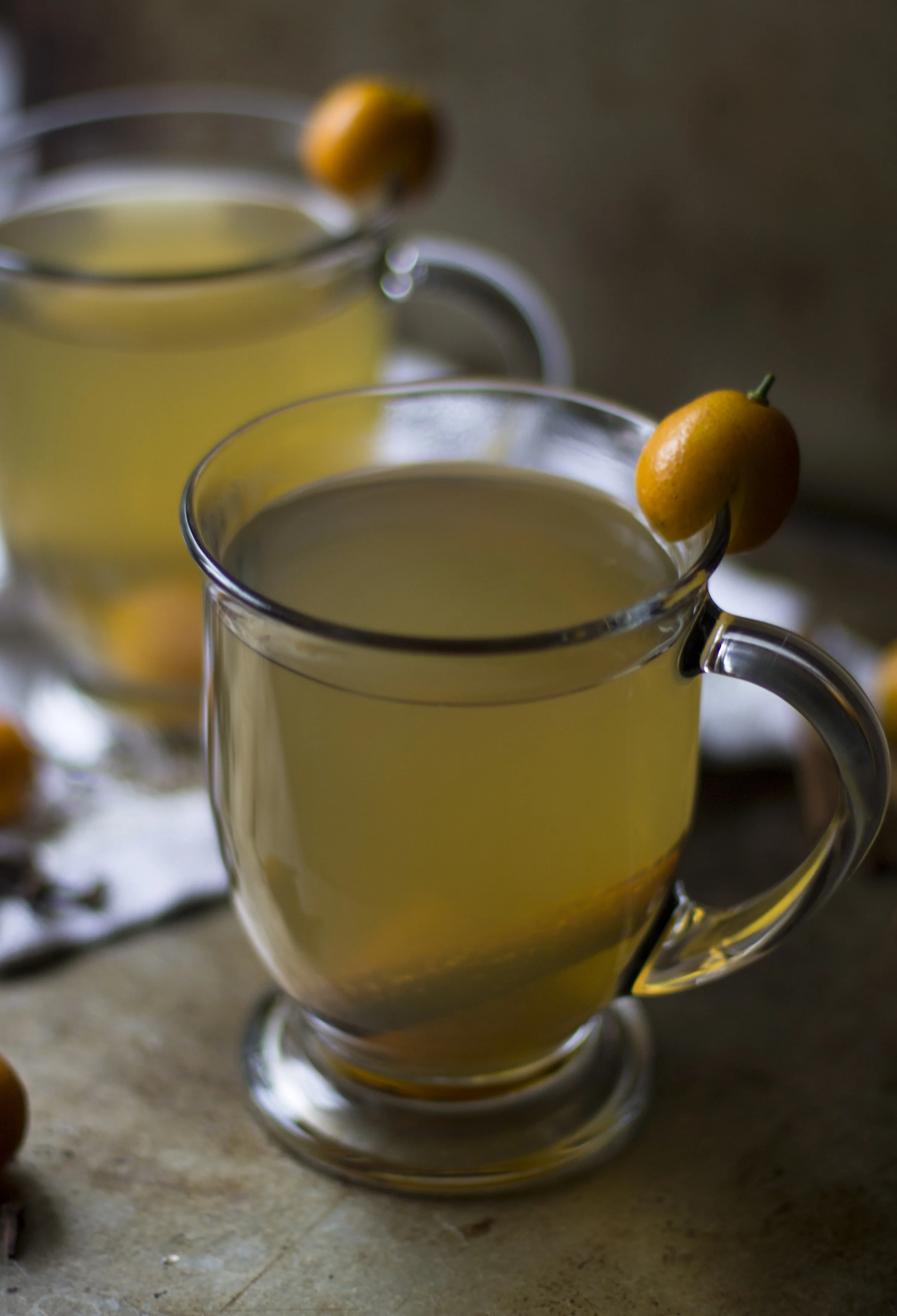 I am a big fat weenie when it comes to cold weather. I would never survive a winter in the north. I barely survive the two months out of the year here in Louisiana that get cold. And this week has been one of those dreary and cold weeks. The sky is grey, the air is damp, and I'm under a blanket with not so attractive house shoes on while I sit here and write. Our house is built off the ground and it doesn't keep heat well and sometimes I feel like I can't get warm, no matter how many layers I put on. There are only two things that help that situation...a hot bath or a hot toddy. I think we'll go with a hot toddy... My kumquat hot toddy will warm you up and will also help fight off any yucky winter colds that might be trying to attack.