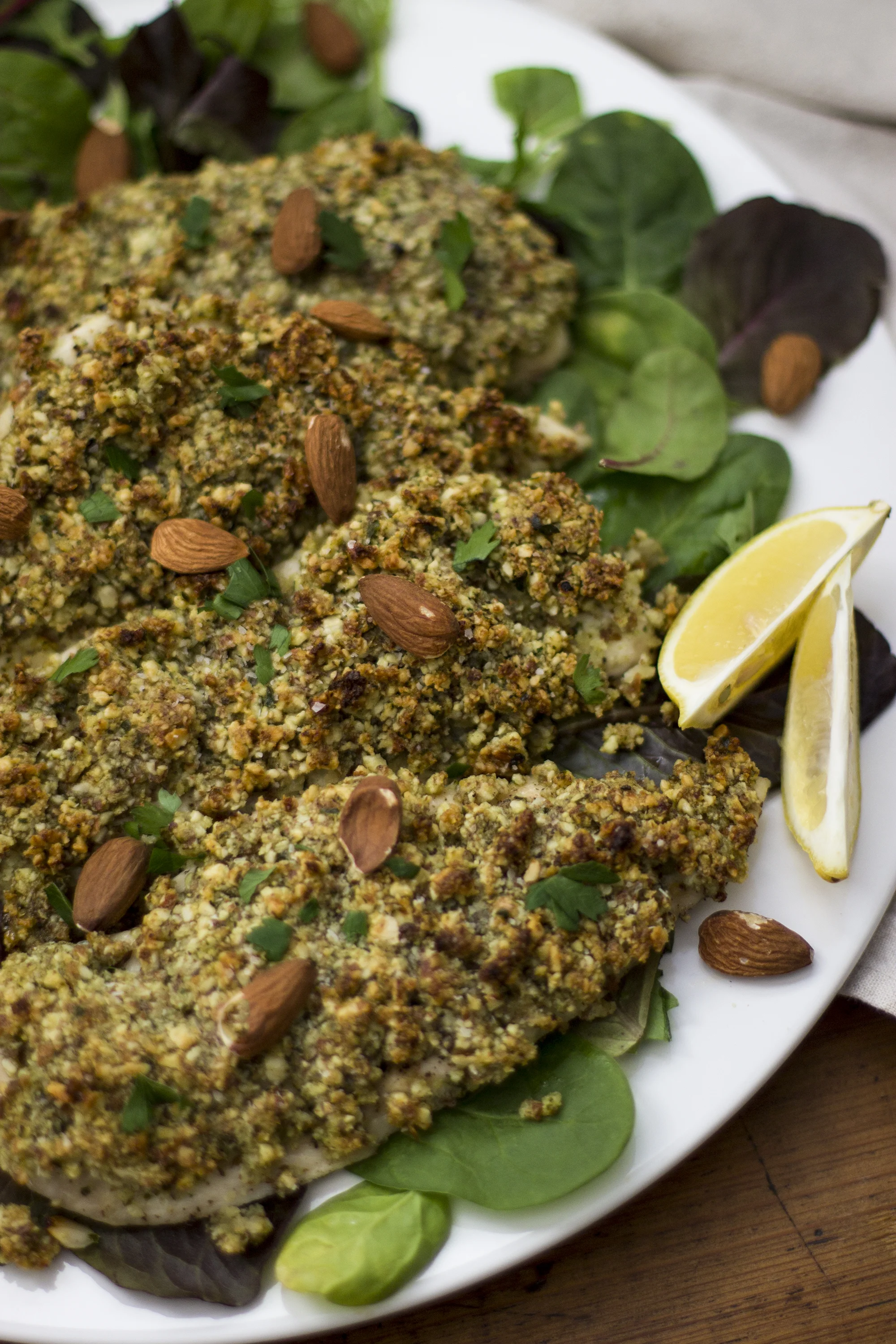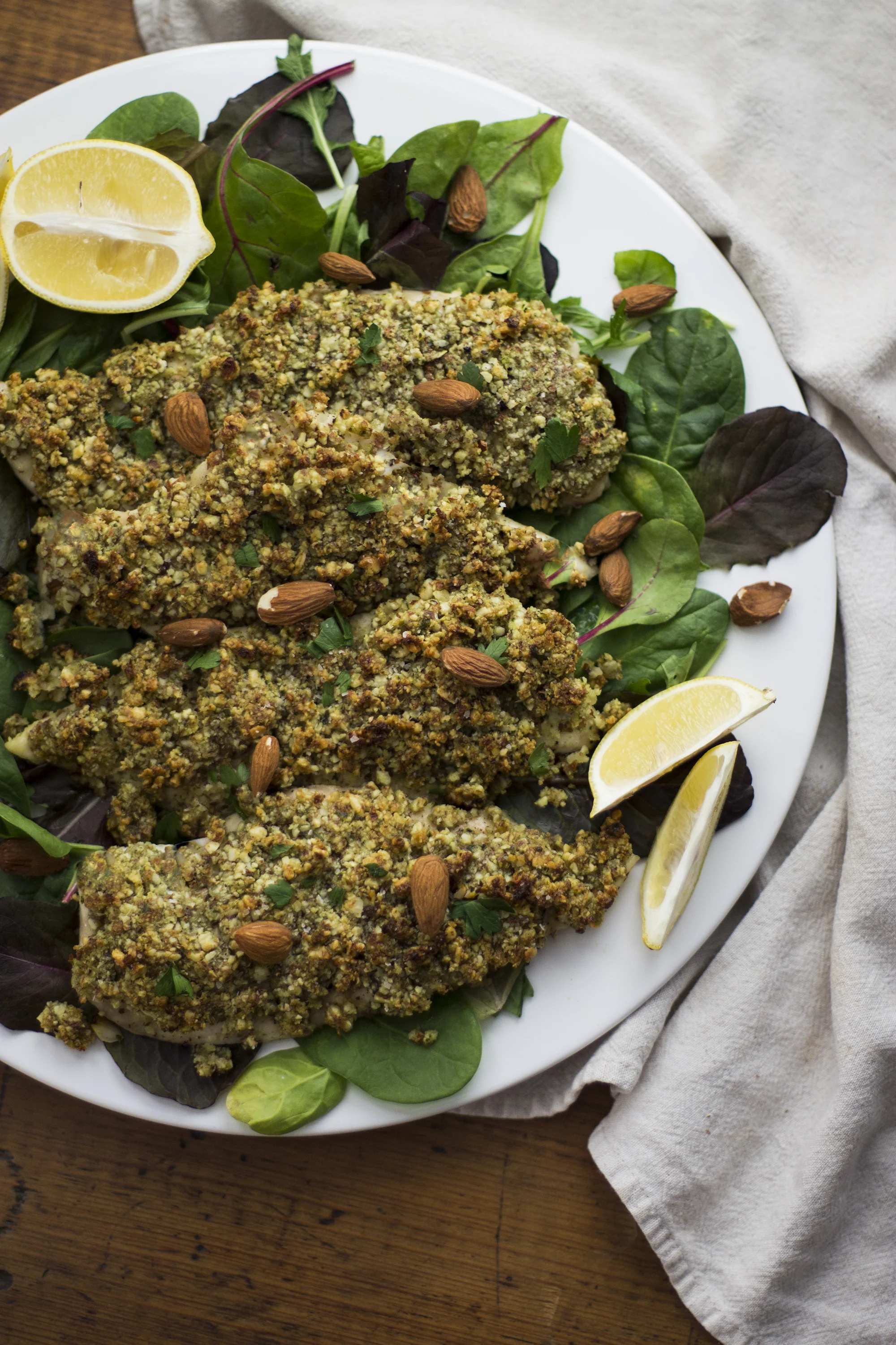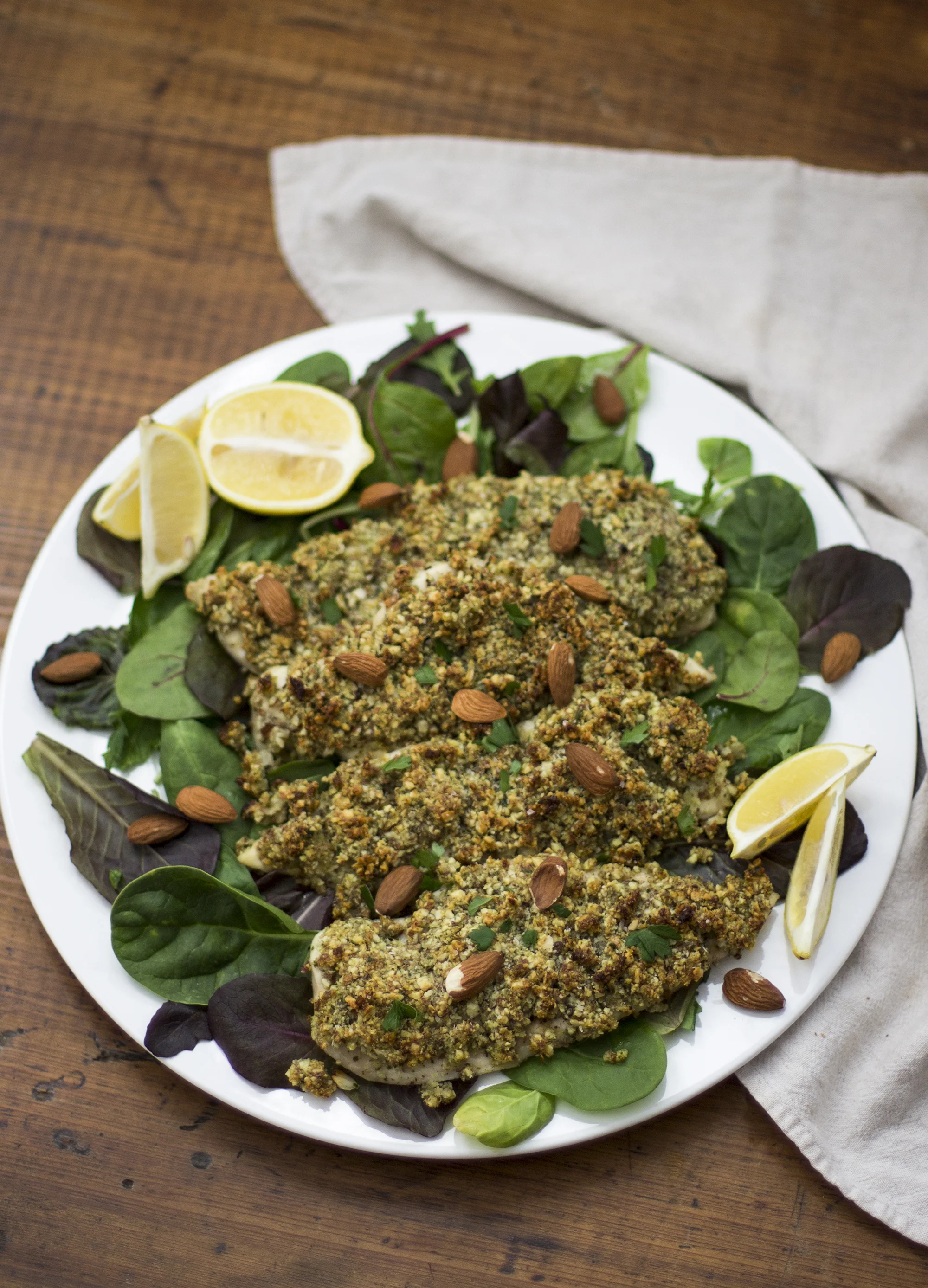 You guys, this whole trying to get things done thing with a newborn is way harder than I anticipated. I had big plans on being back fully into blogging mode and thought I would be back to whipping up recipes in the kitchen by now. I am back making simple dinners for us in the kitchen and am managing to get a little work done here and there, but am by no means back to my regular schedule just yet. Luckily I had another recipe ready to go that I photographed pre-baby! My almond crusted chicken is super healthy, easy, and just the kind of recipe that I have been making the past couple of weeks.