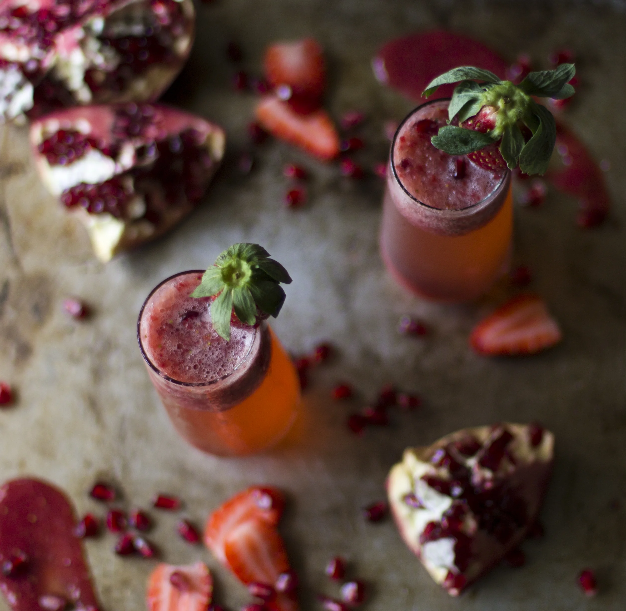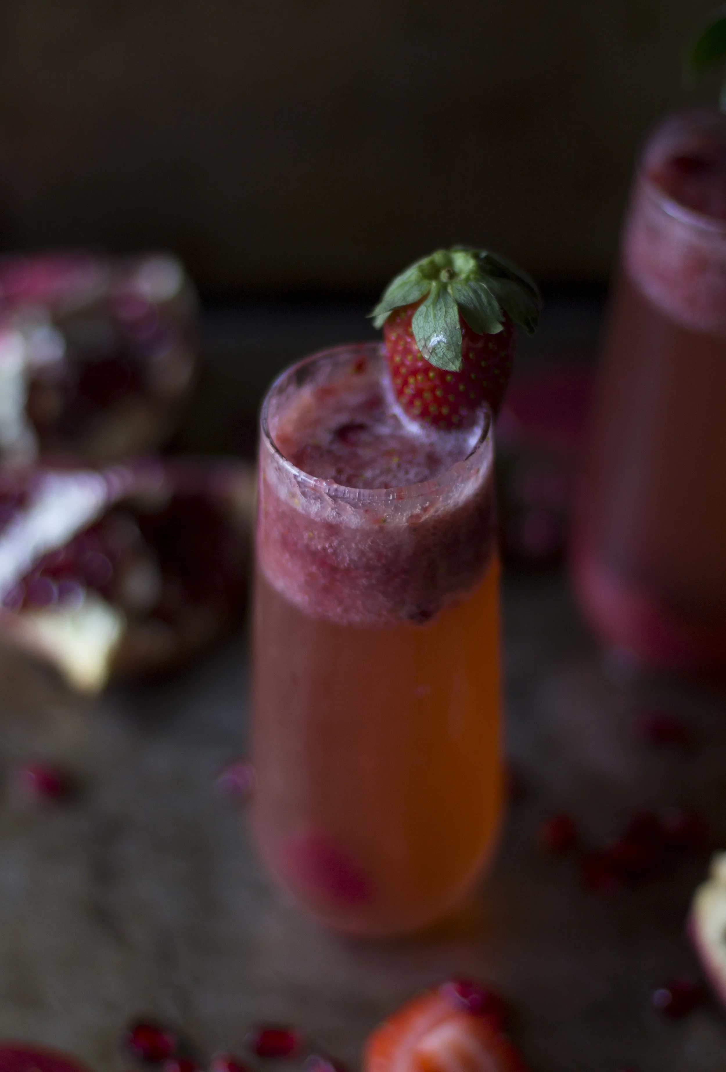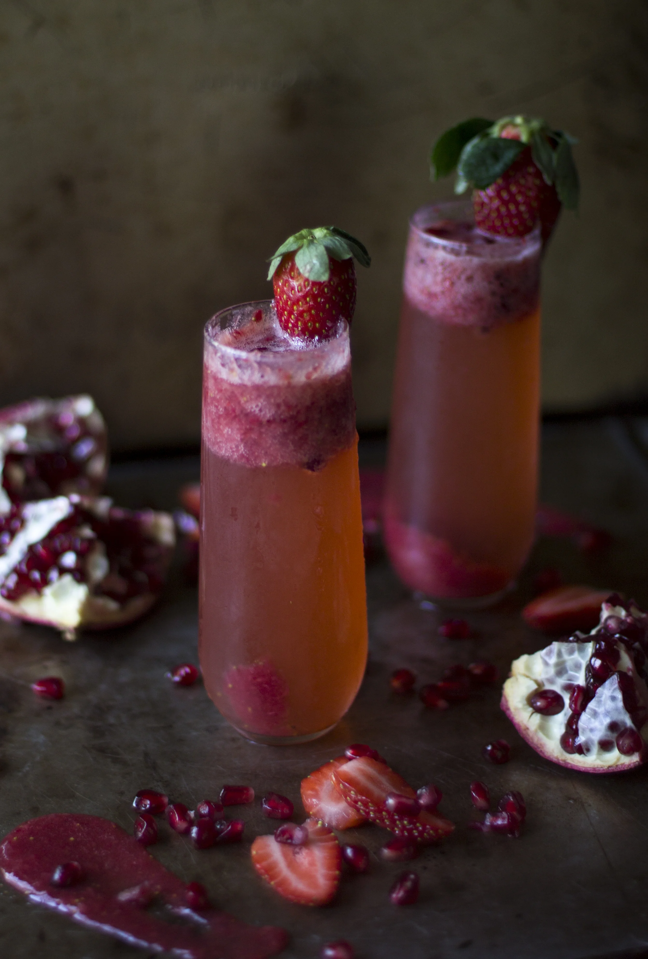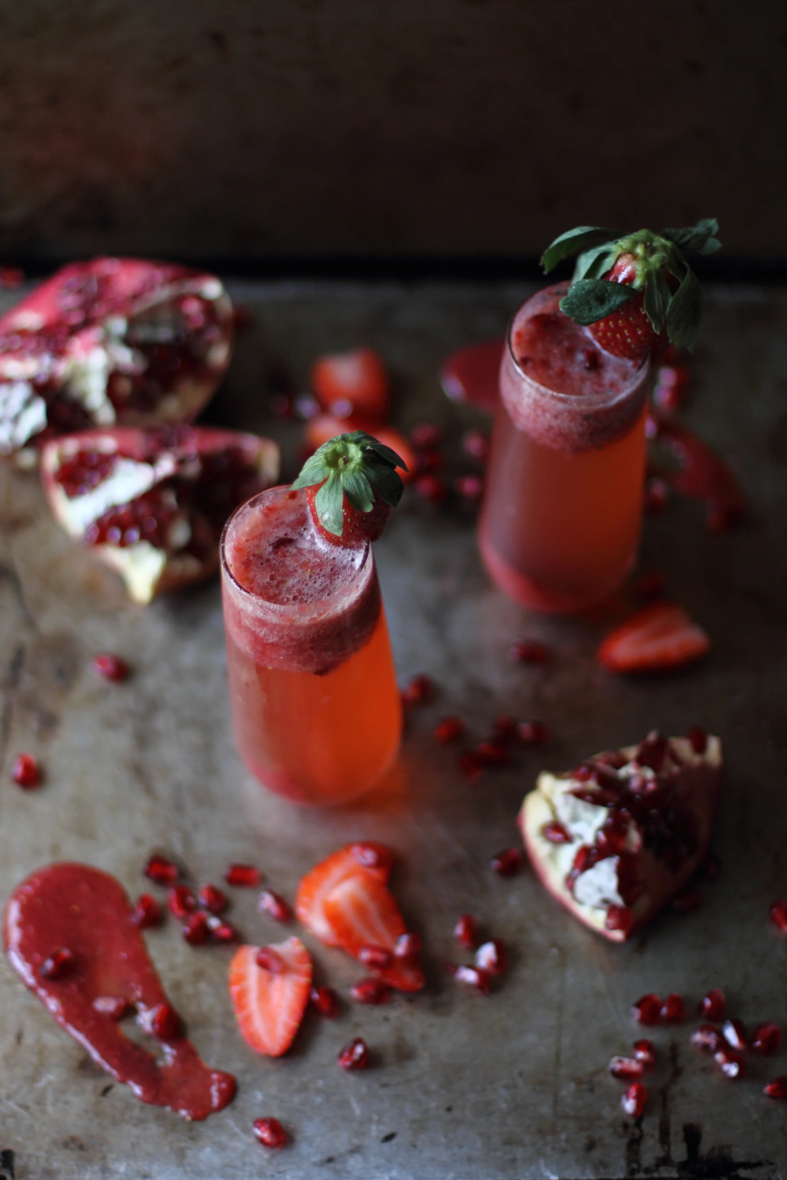 I couldn't resist creating a cocktail with them since they are the perfect Valentine's shade of red, and pairing them with champagne just seemed like the thing to do here! I decided to add pomegranate for an extra deep red color and gorgeousness! The flavor of the strawberries and pomegranate pair so nicely and together they create a tasty puree that transforms your champagne into something fancy, beautiful, and extra special for whomever you might be sharing the day with!