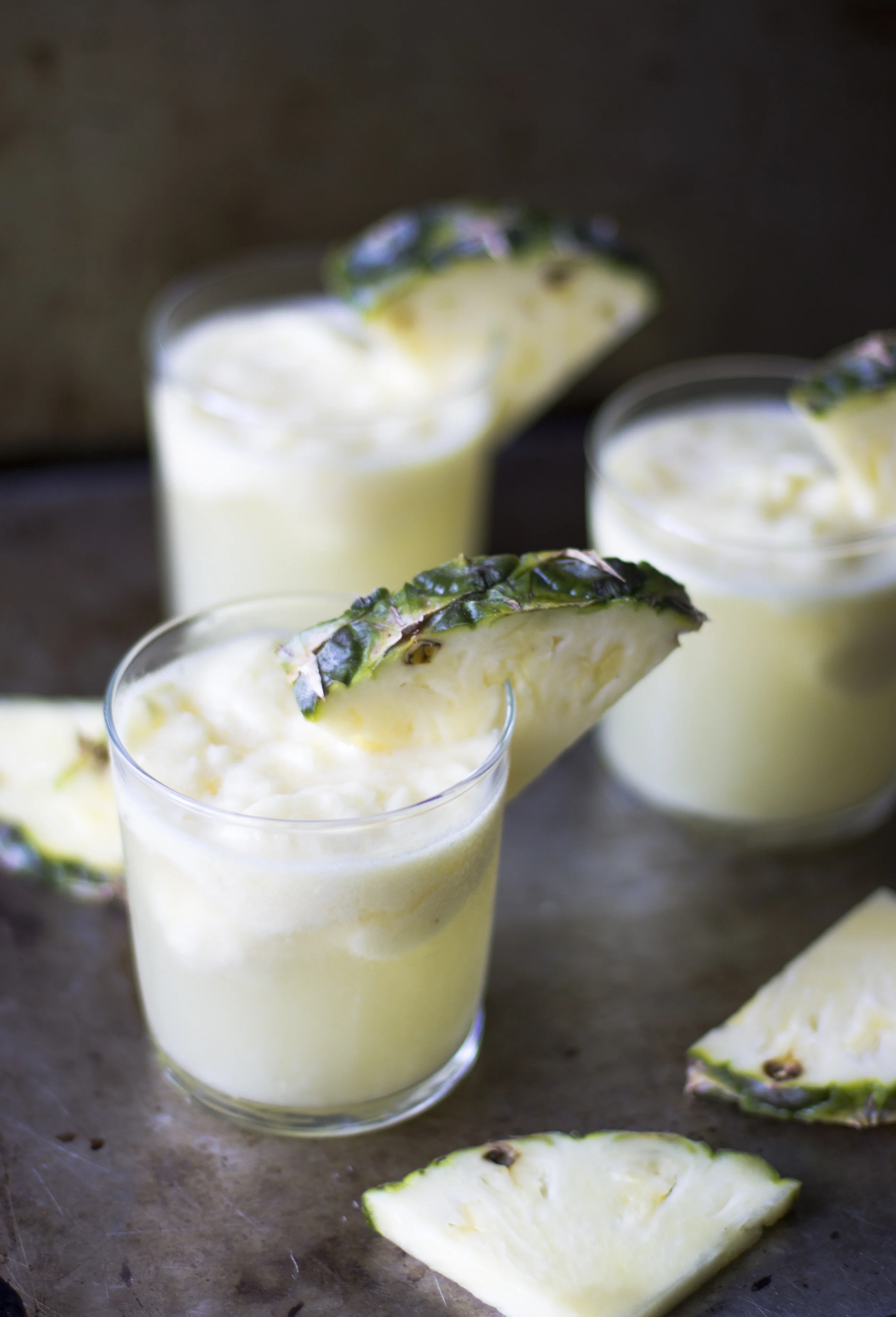 - In a food processor or a high powered blender combine your frozen pineapple, honey, and coconut milk and process on high until the mixture is creamy and smooth. At this point you can eat the sorbet immediately, but for the cocktail you will want to freeze it for at least 4 hours in advance.