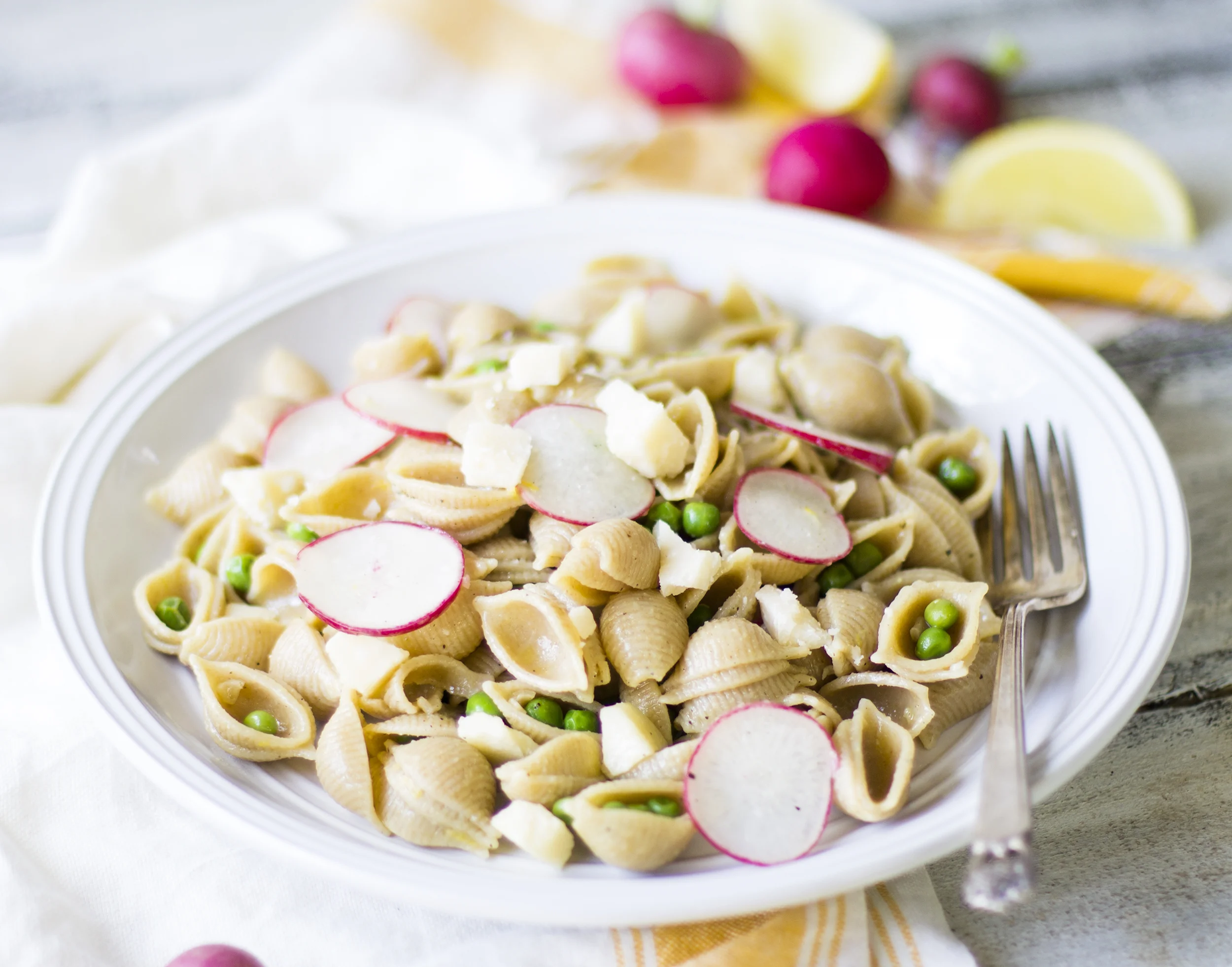 The bite of the radishes with the sweet peas and tangy lemon vinaigrette are taken to the next level with bits of salty Parmesan throughout the pasta salad. It's a crowd pleaser that you and your family will love!