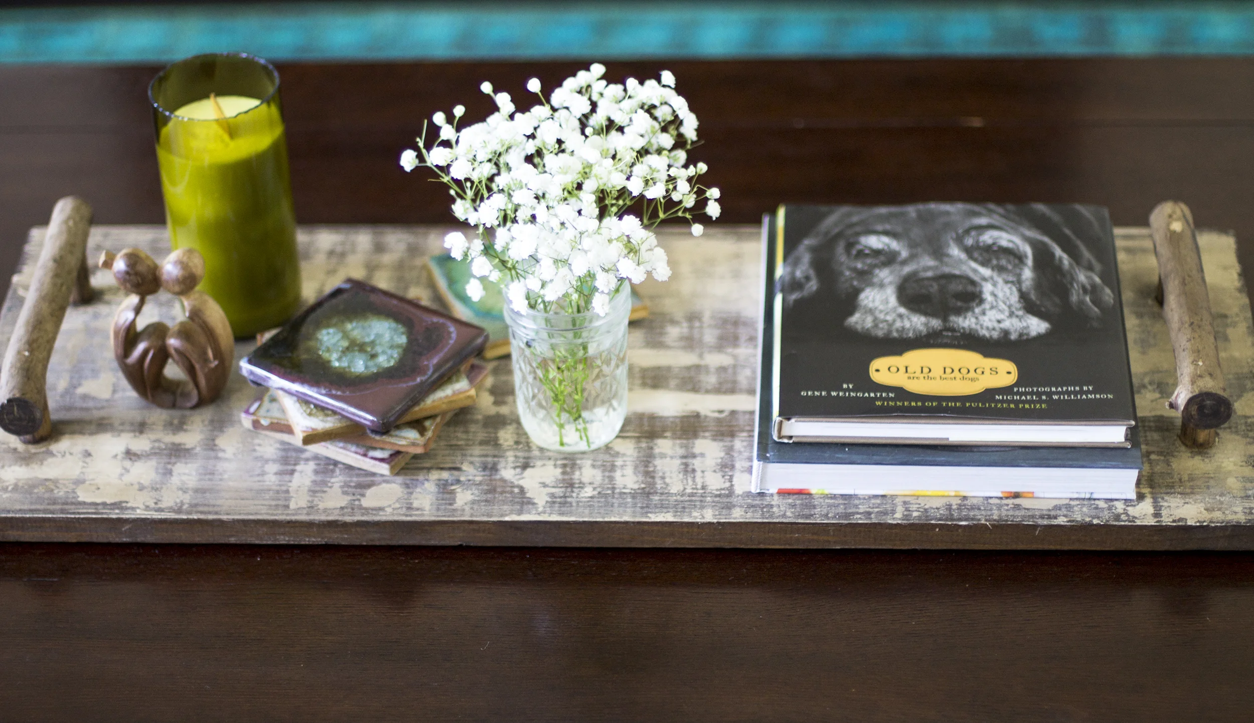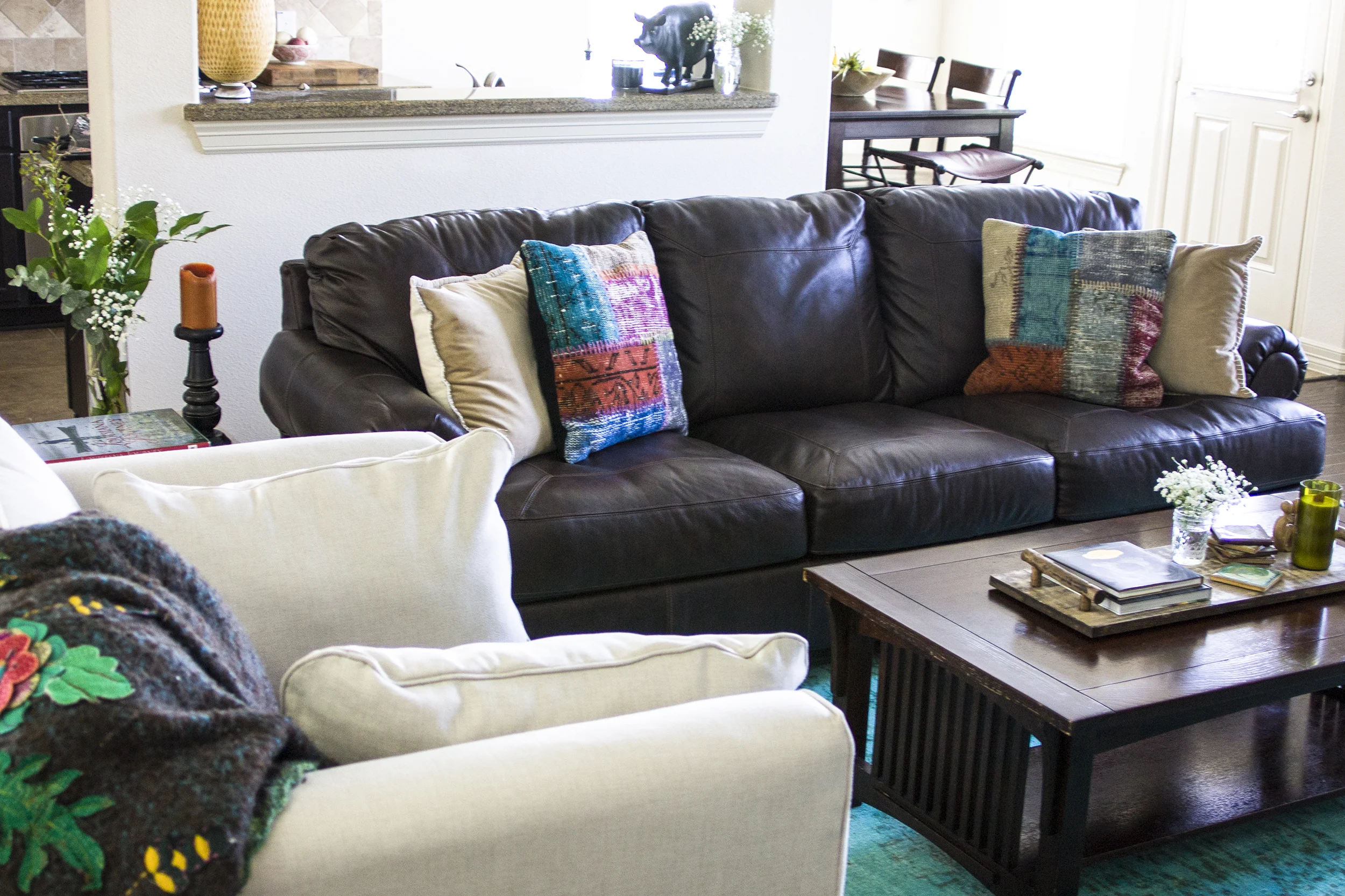 I chose a vibrant over-dyed rug for the living room knowing that I would have neutral furniture and wanted to let the turquoise color be the focus of the room. I wanted simple, but with purposeful statement pieces, like my Turkish pillows on the leather couch to provide texture and the detailed throw over the cream tweed chair. I am slightly obsessed with this rug and it's probably one of my favorite pieces in the whole house! Bonus is that it also doesn't show dog hair, which if you know me that's a huge deal!