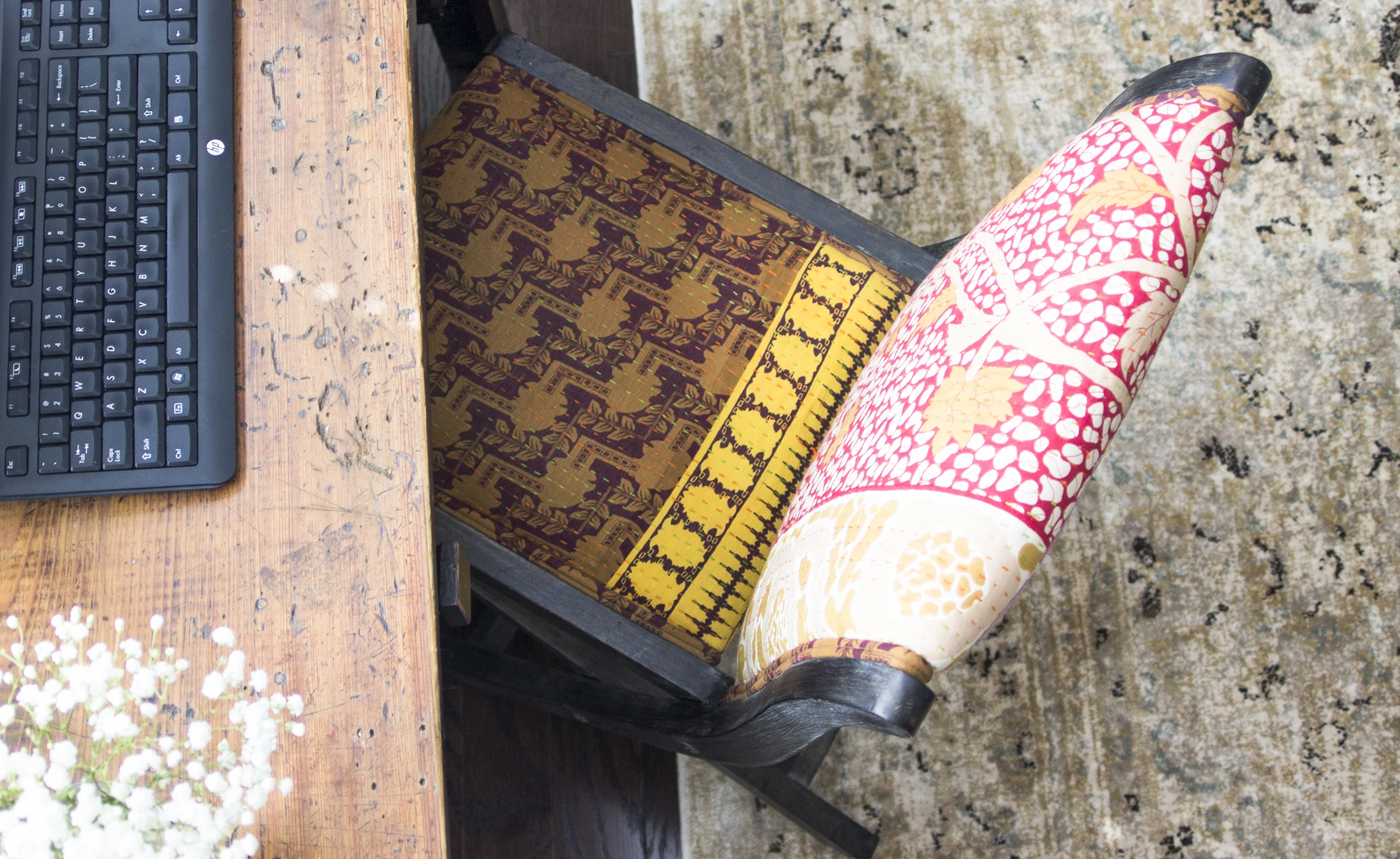 For the office, I went the opposite route and chose a neutral rug that felt really elegant, but had a slightly boho pattern. I wanted a calm office and space to be creative in! Even the boys love hanging out with me in the office, as you can see. I couldn't get them to move for the pictures...story of my life. We made the decision to convert our dining room into an office because we just don't use a dining room often enough and I wanted to make use of the space for something I would use on a daily basis. I loved the way it turned out and I'll admit the angles in this room are hard to capture the whole feel in a picture, but it opens nicely into the living room and kitchen keeping me from feeling isolated from the rest of the house!