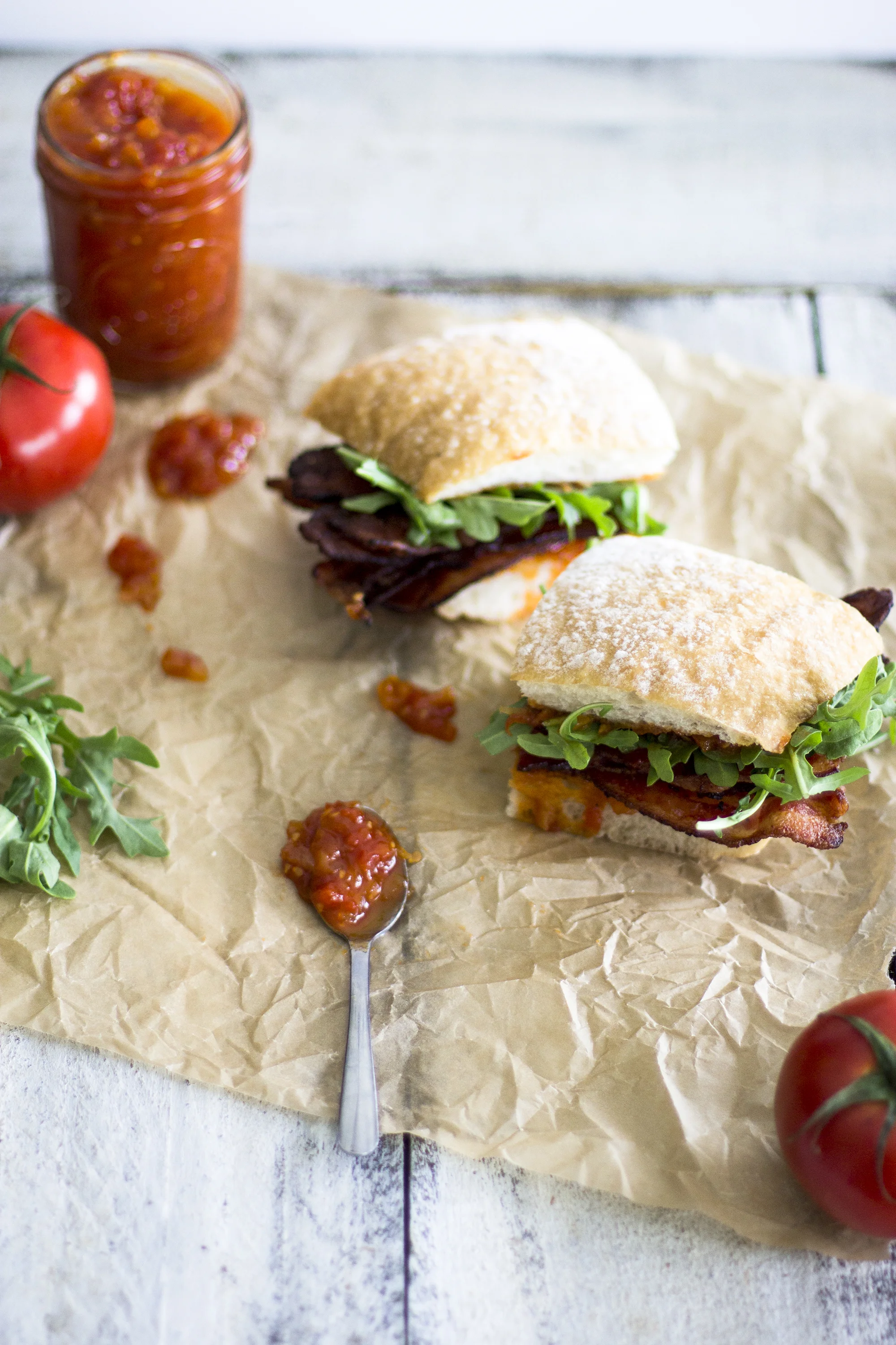 Layer tomato jam, bacon, and arugula between the two slices of ciabatta.