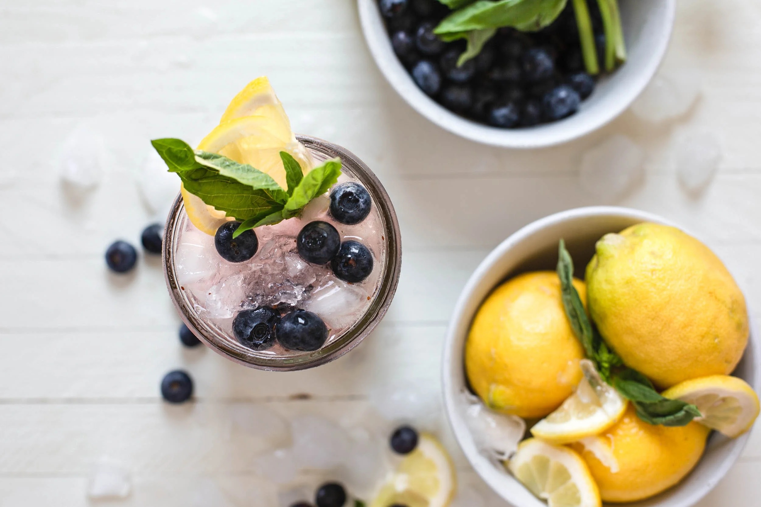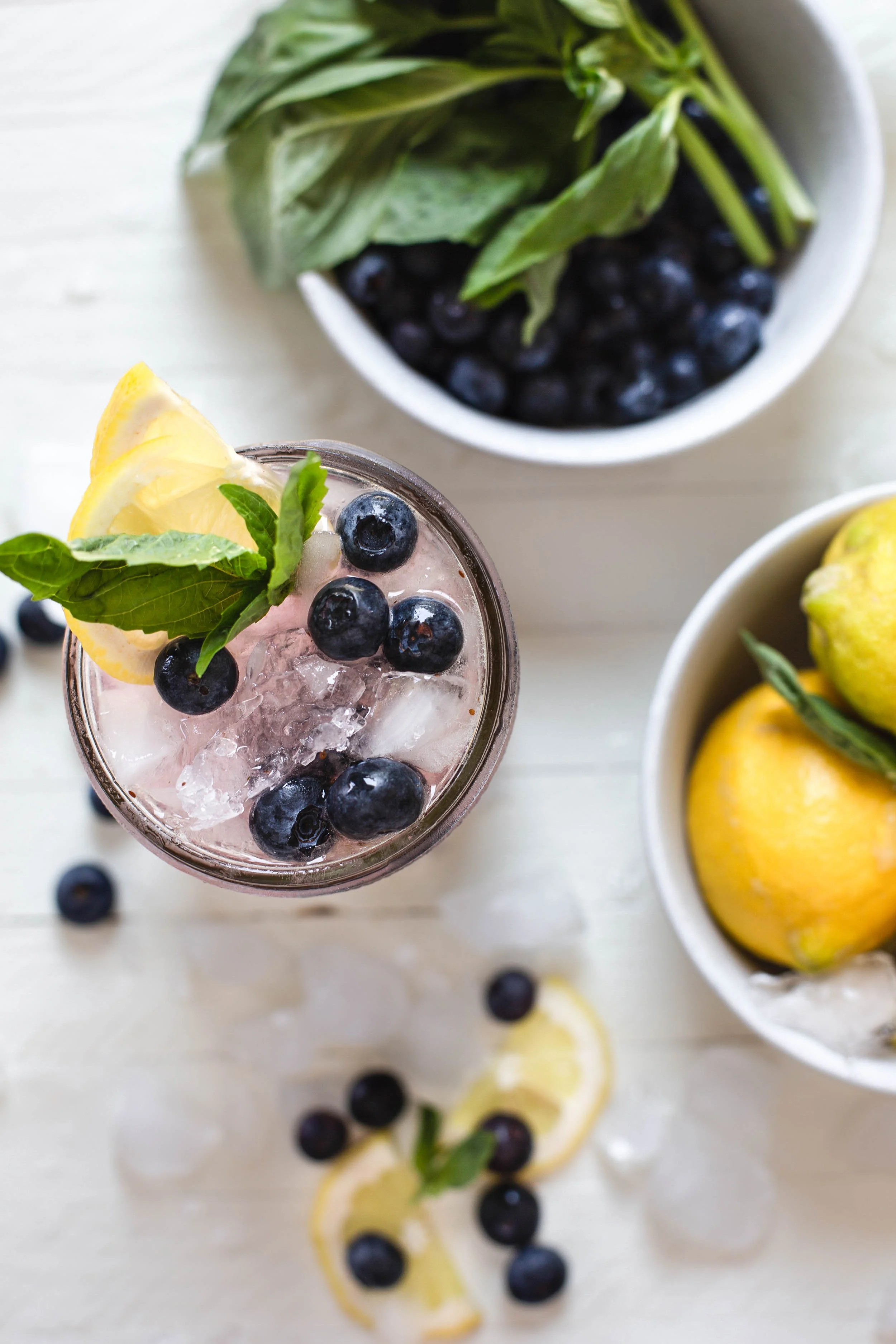 Garnish with blueberries, lemon wedges, and a fresh basil leaf.