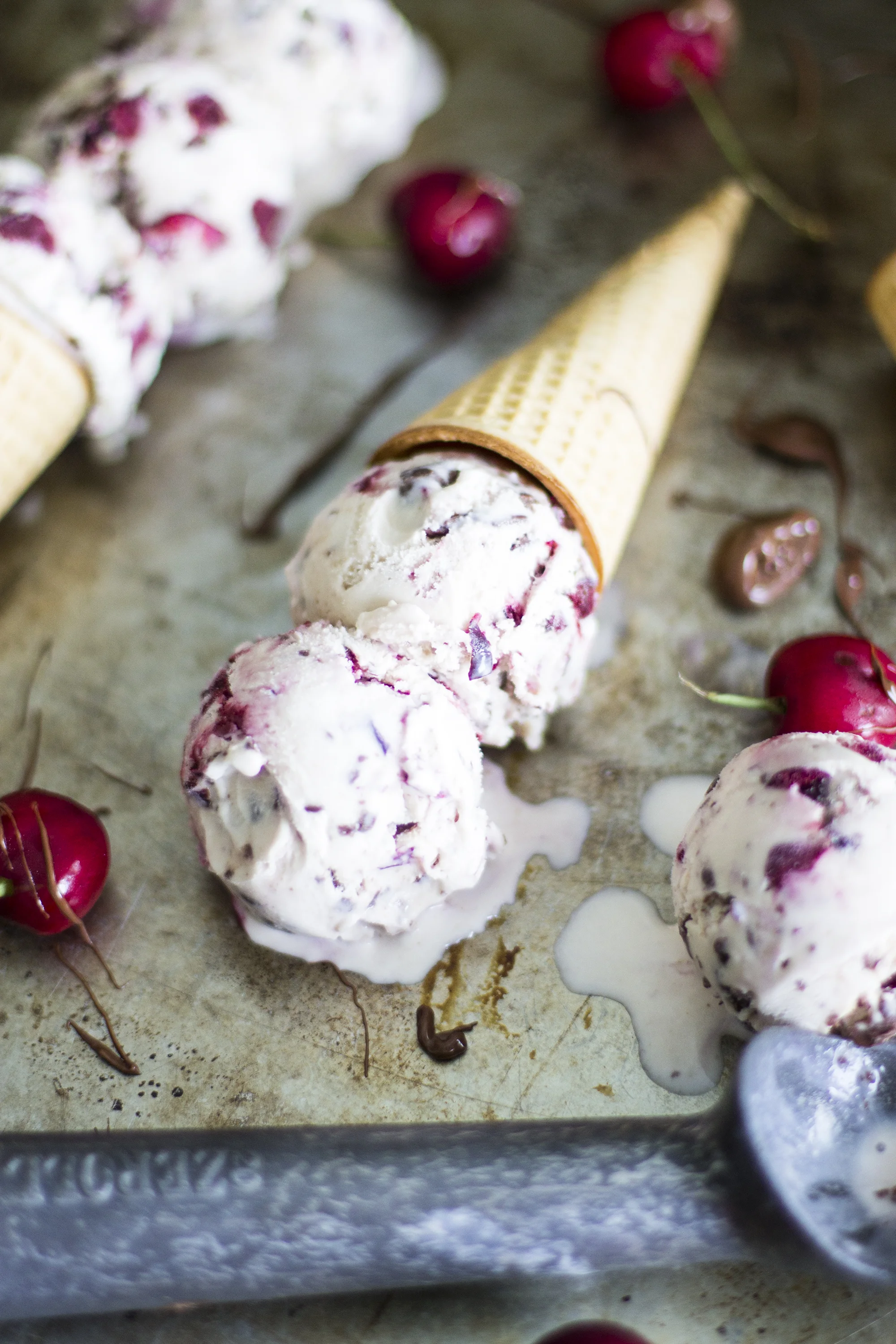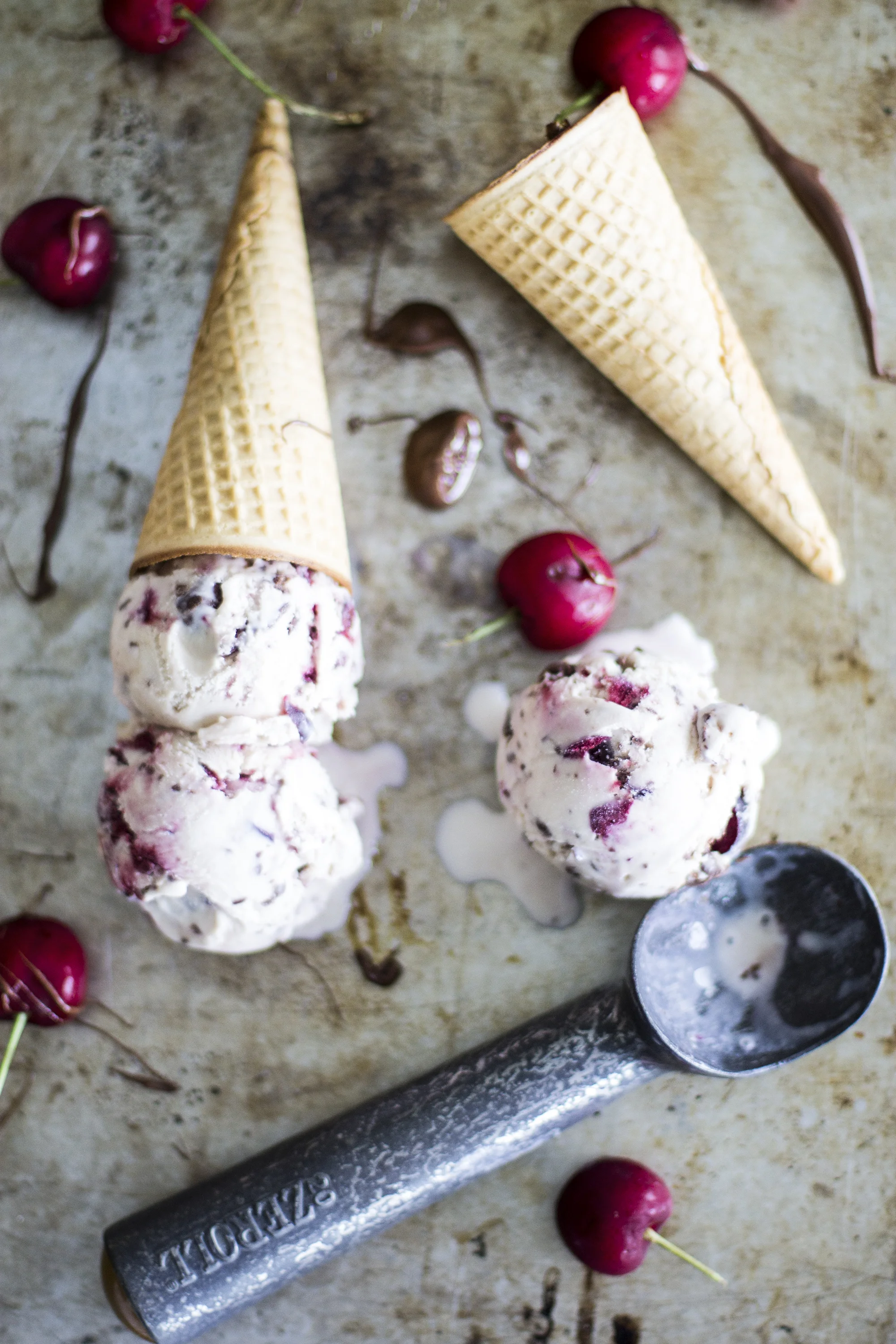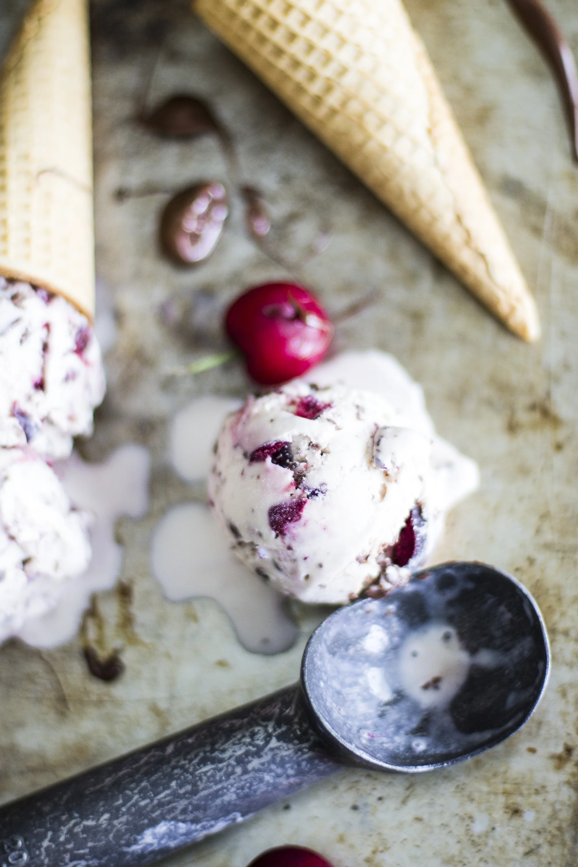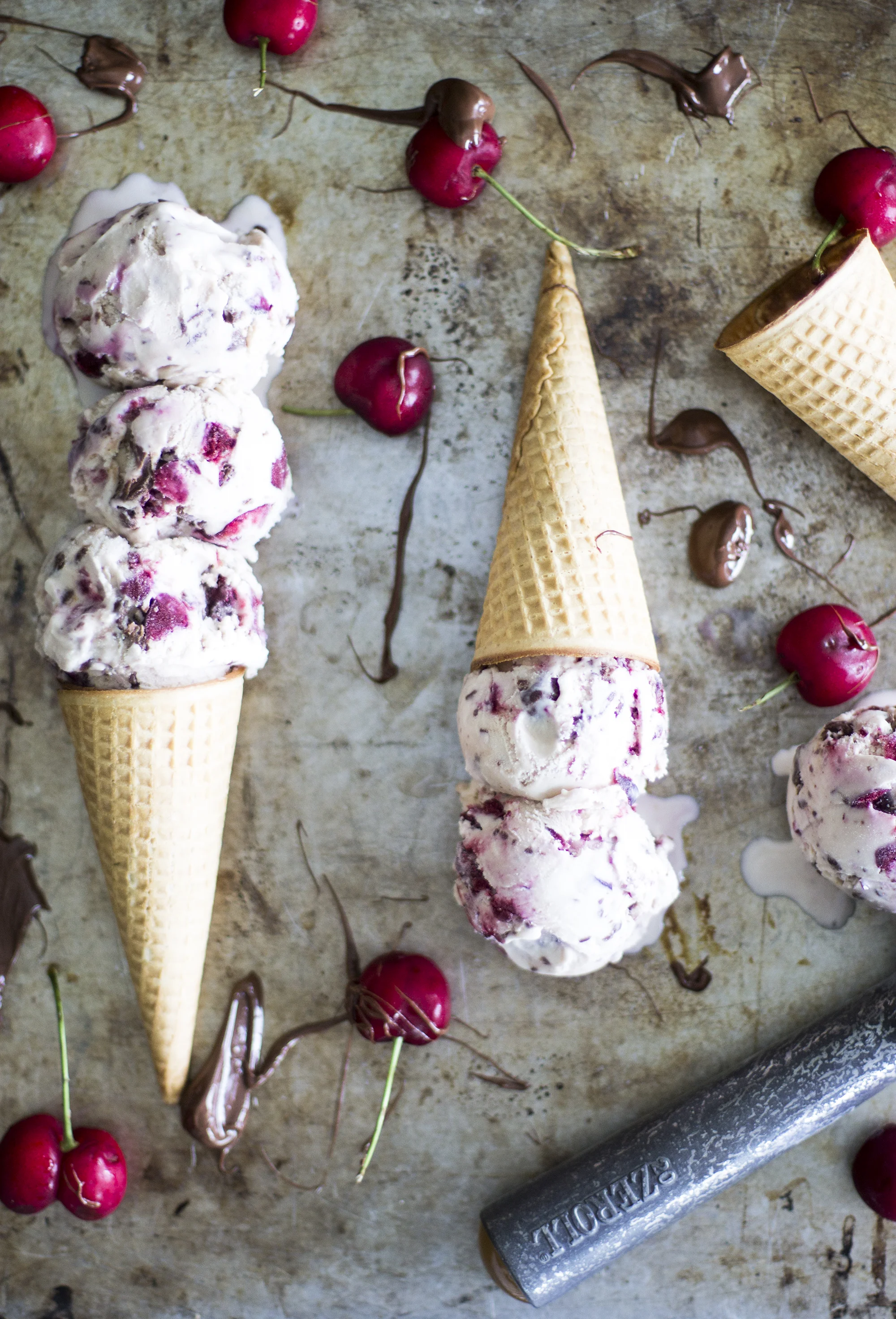 I mean hello, it has Nutella in it, which I am pretty sure you could put on a rock and I would try to eat it. I actually started making a Nutella ice cream about two summers ago and it's still mine and Canean's favorite easy flavor to whip up. And since fresh fruit like cherries and strawberries are transformed into a dessert with the dip of Nutella on them, I figured that cherries would be the perfect fruit to add to my original recipe!