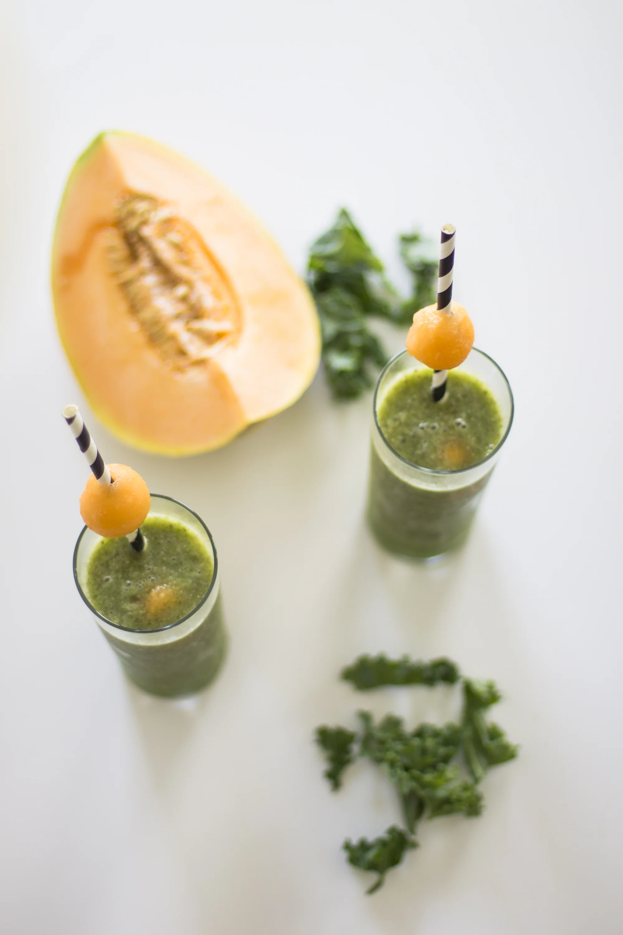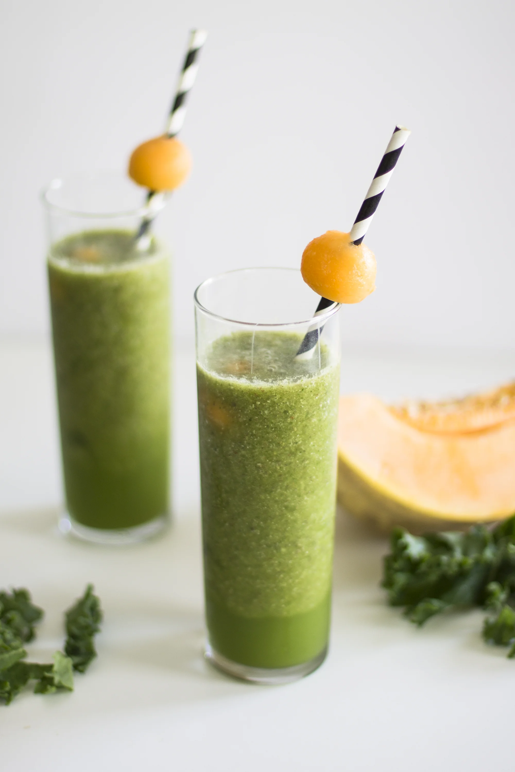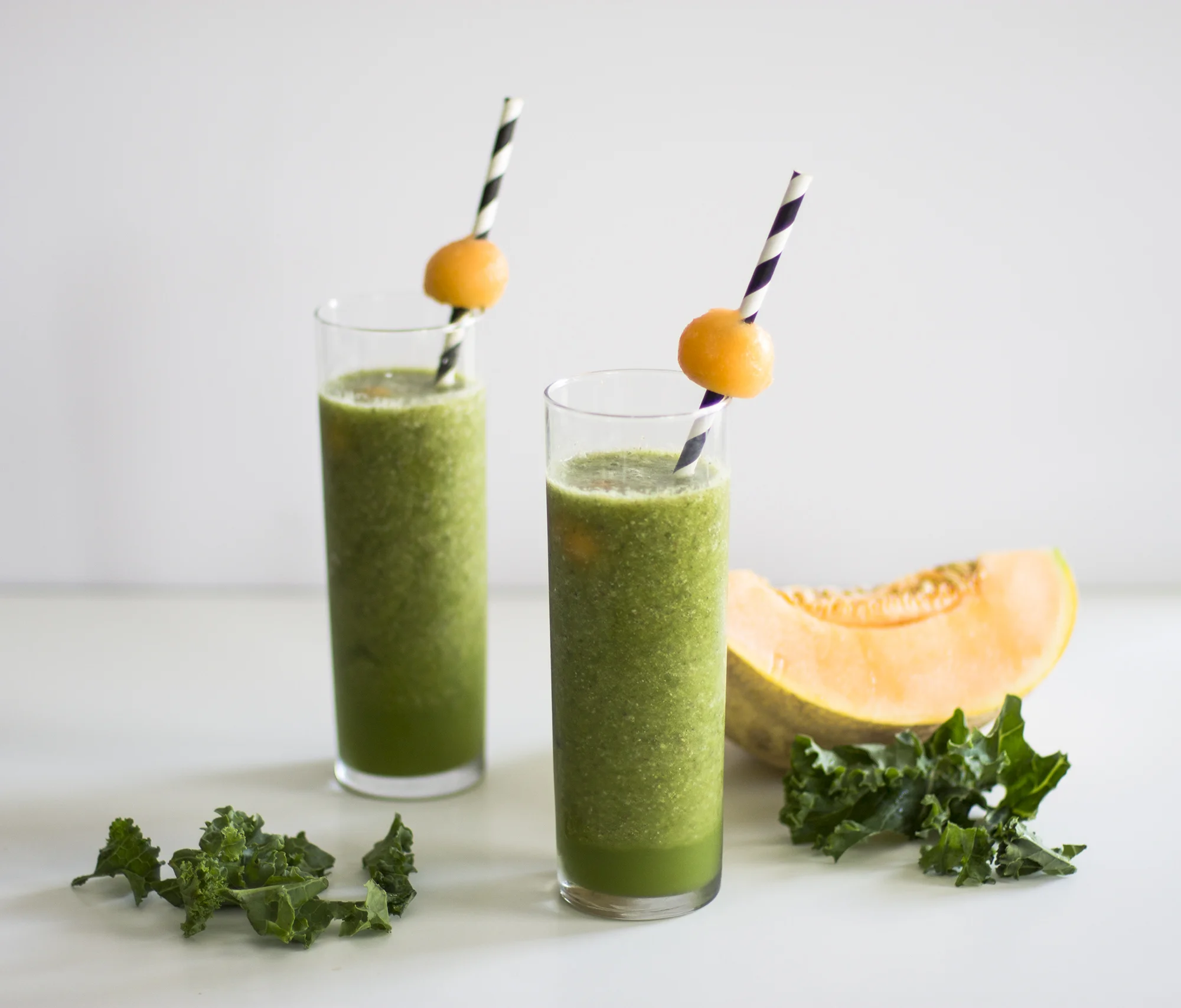 Kale is a super food that should be a part of our regular diets. It can be hard to get enough of it without cooking it for dinner every night, and let's be honest we would all get tired of that! However if you throw some in a smoothie from time to time, you can get your daily allotment of vitamins contained in dark leafy greens. Cantaloupe is also great for you also with it's ability to hydrate, increase your energy, and lower the risk for diabetes and heart disease. Mix the two together and you have one vitamin packed drink!