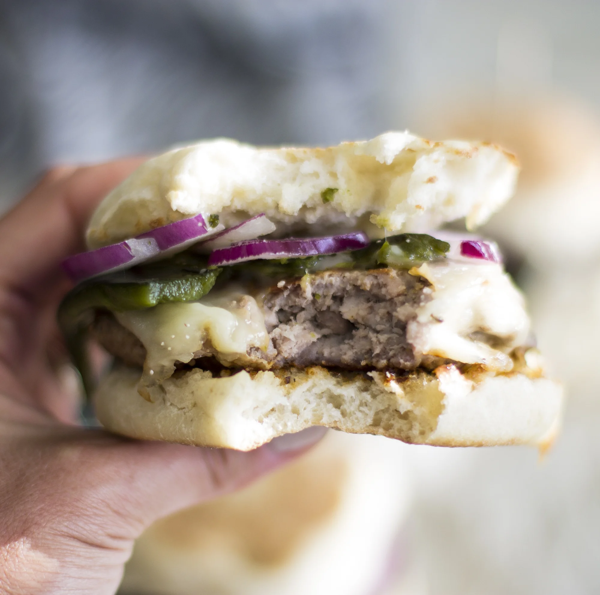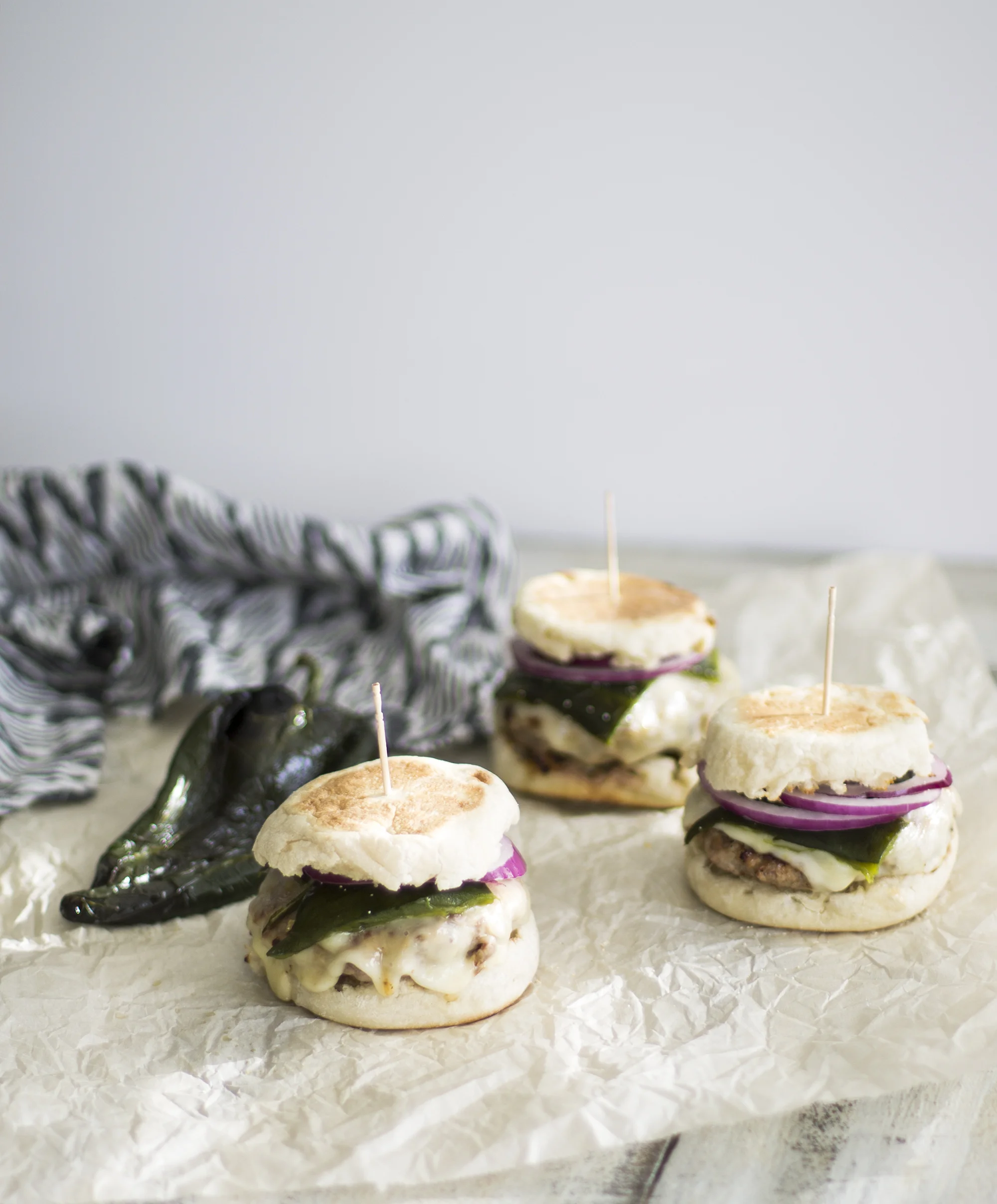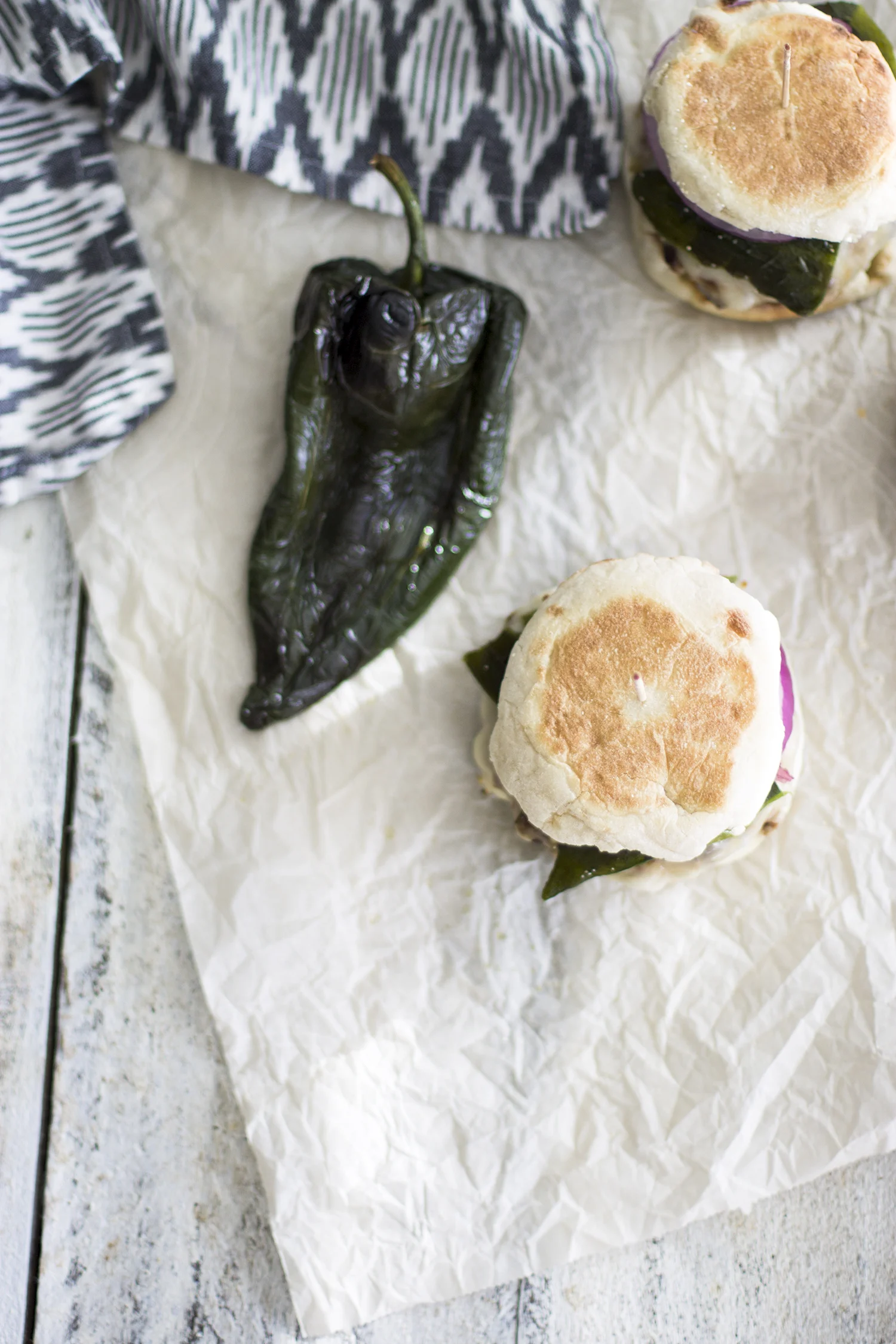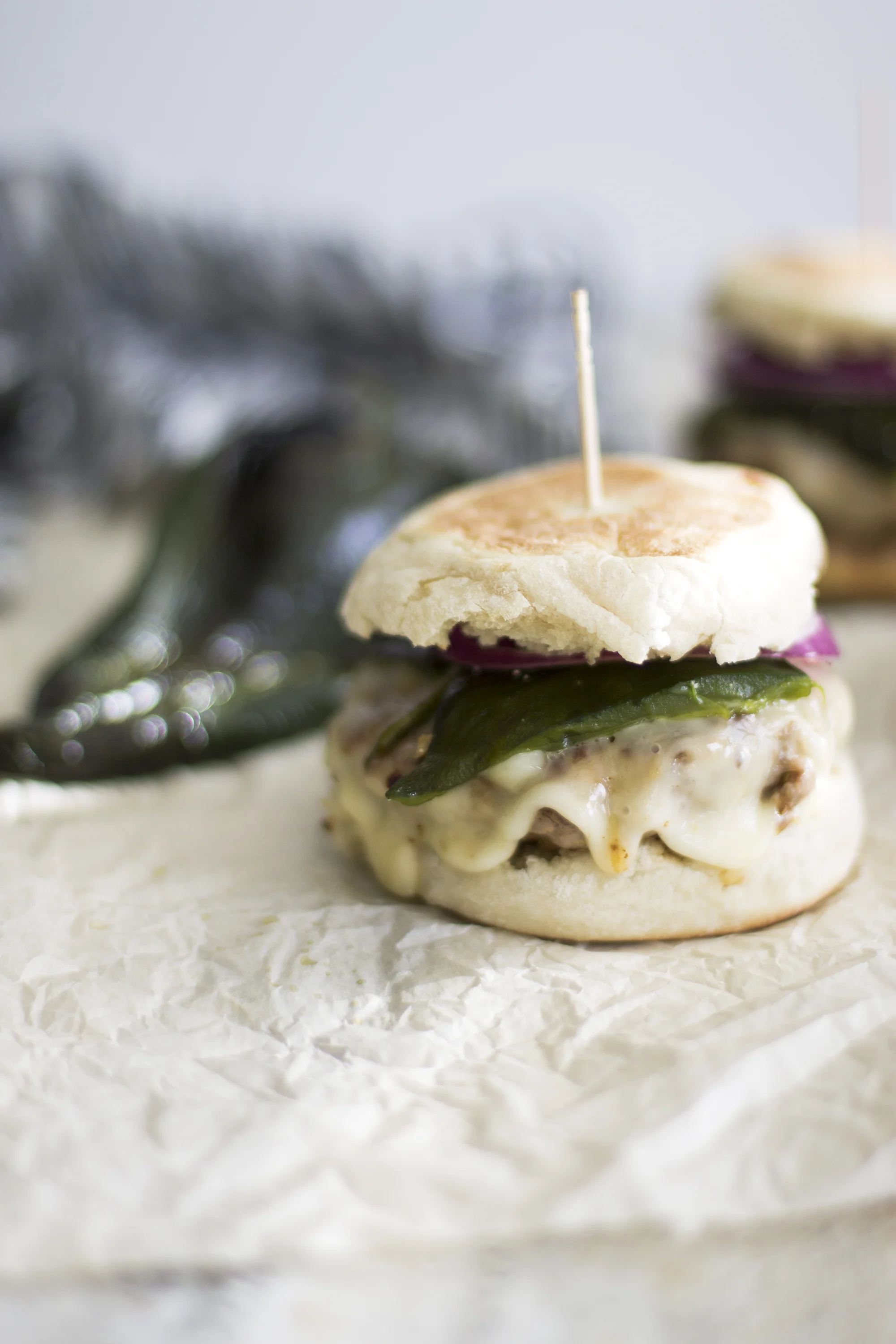 - To assemble, place pork burger on the bottom of the english muffin, sliced red onion, and then half of the poblano pepper on top.