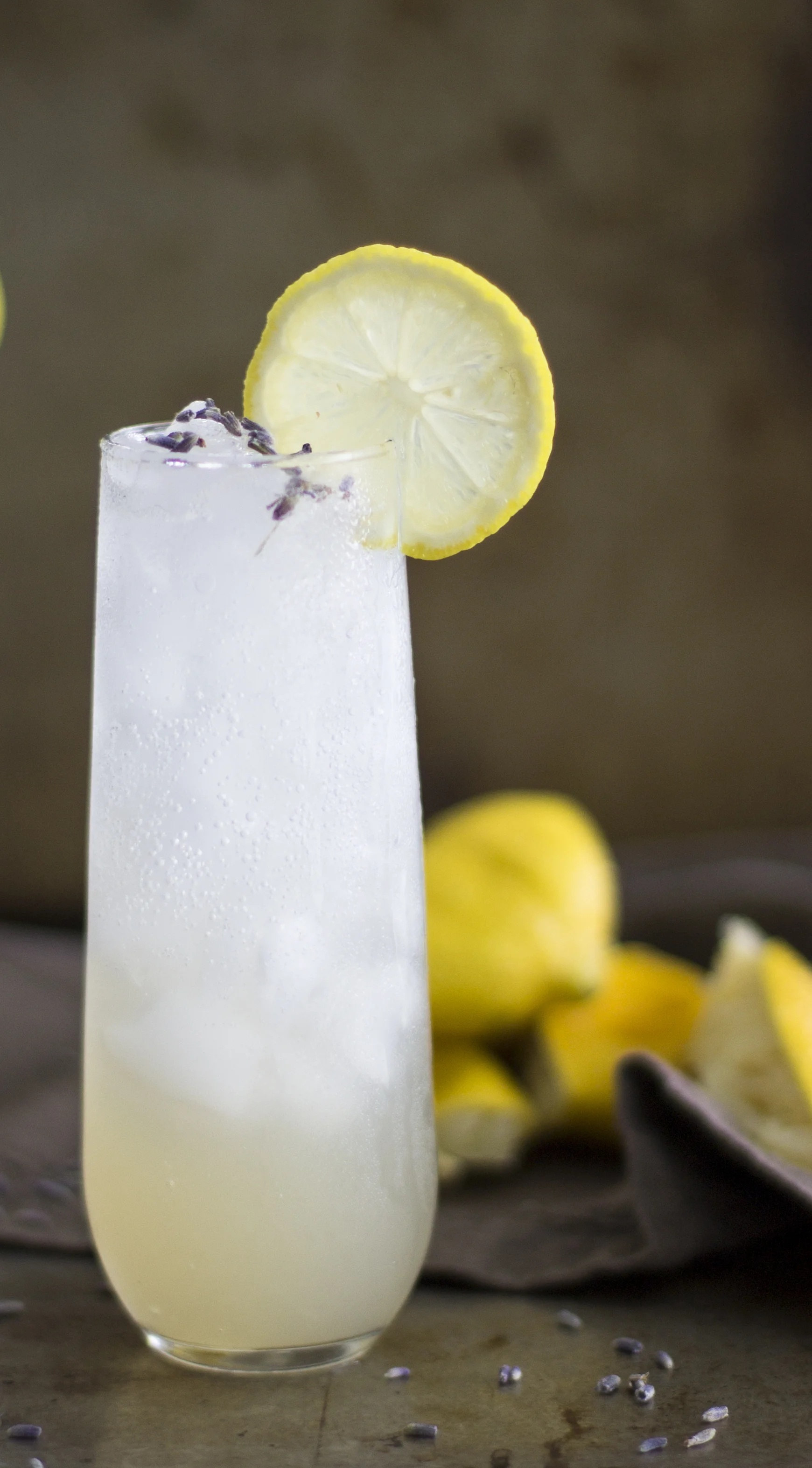- Top off with champagne and garnish with lemon slices and a few lavender sprigs.