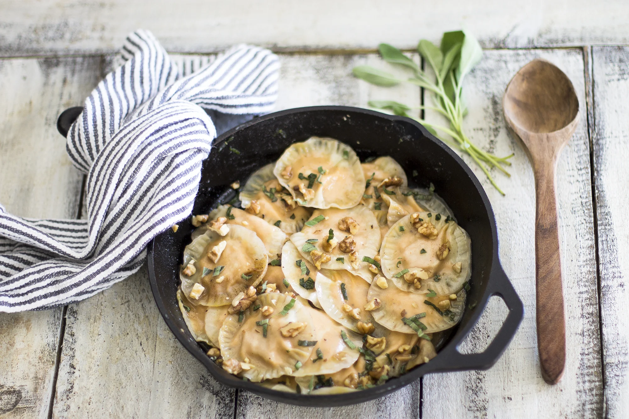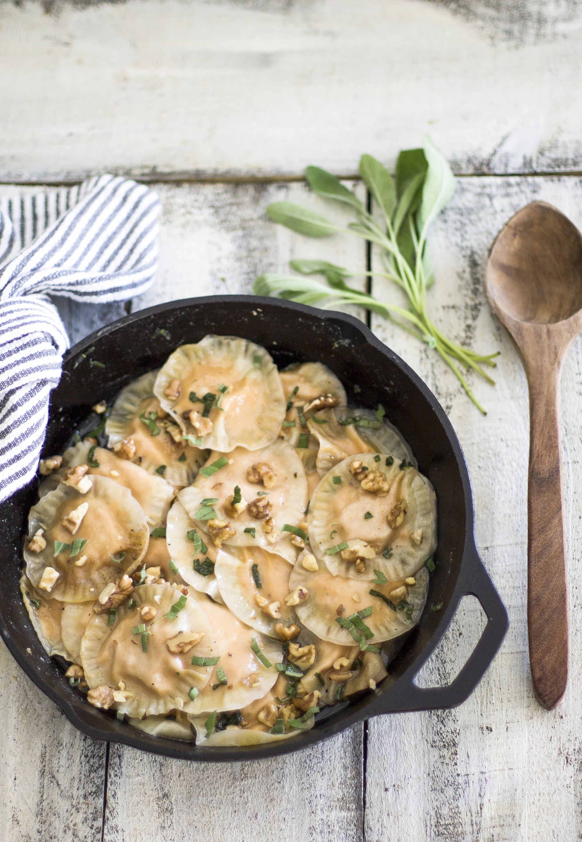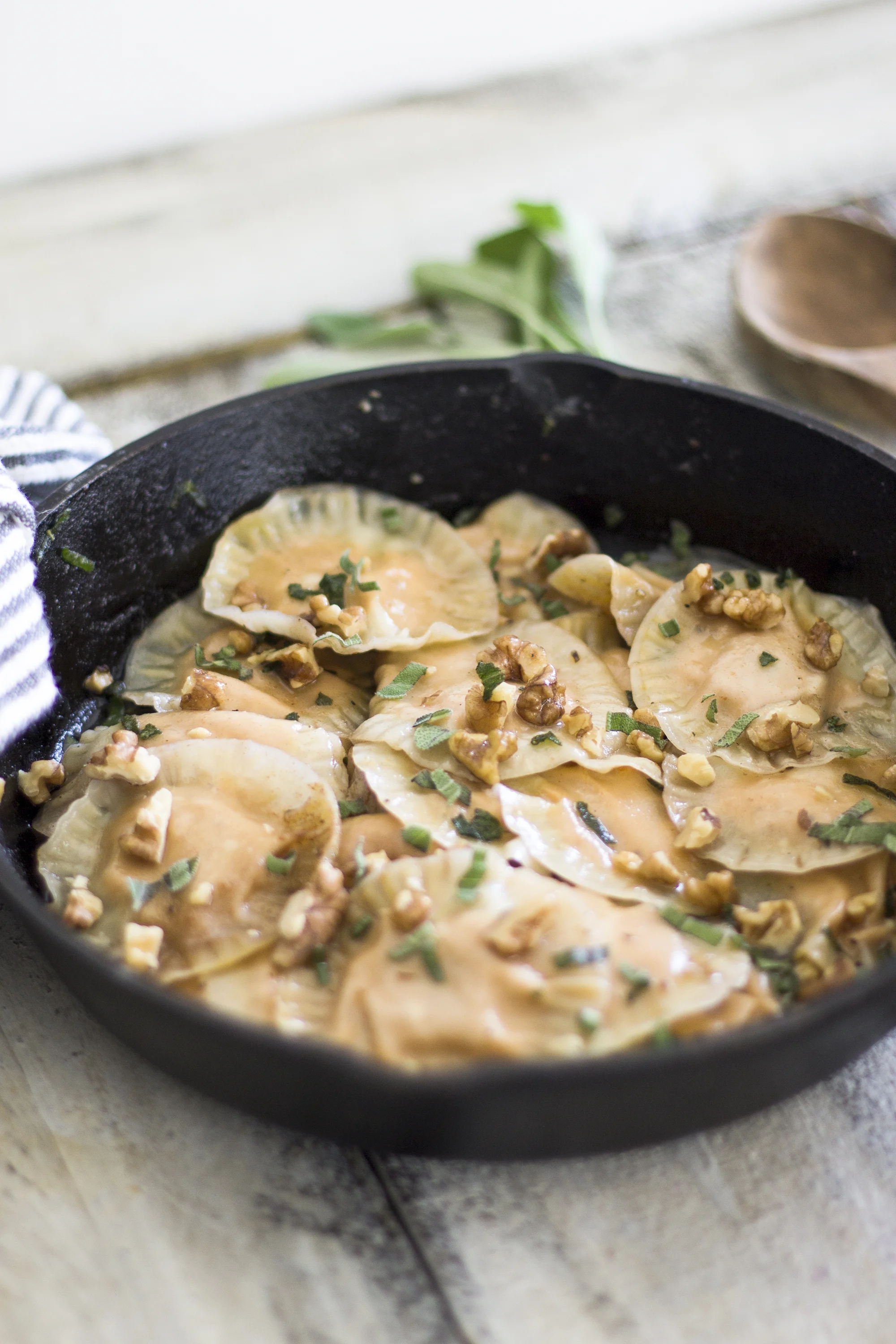 It's as good of an excuse as any to whip up all of your favorite pumpkin recipes! Tis the season after all. This ravioli dish is going to be your new favorite and is made super easy with wonton wrappers instead of having to roll out your own pasta by hand! The brown butter and sage flavor combinations pair perfectly with the pumpkin. I sprinkled walnuts in during the last minutes to add some great texture with the creamy ravioli! Yummy guys!