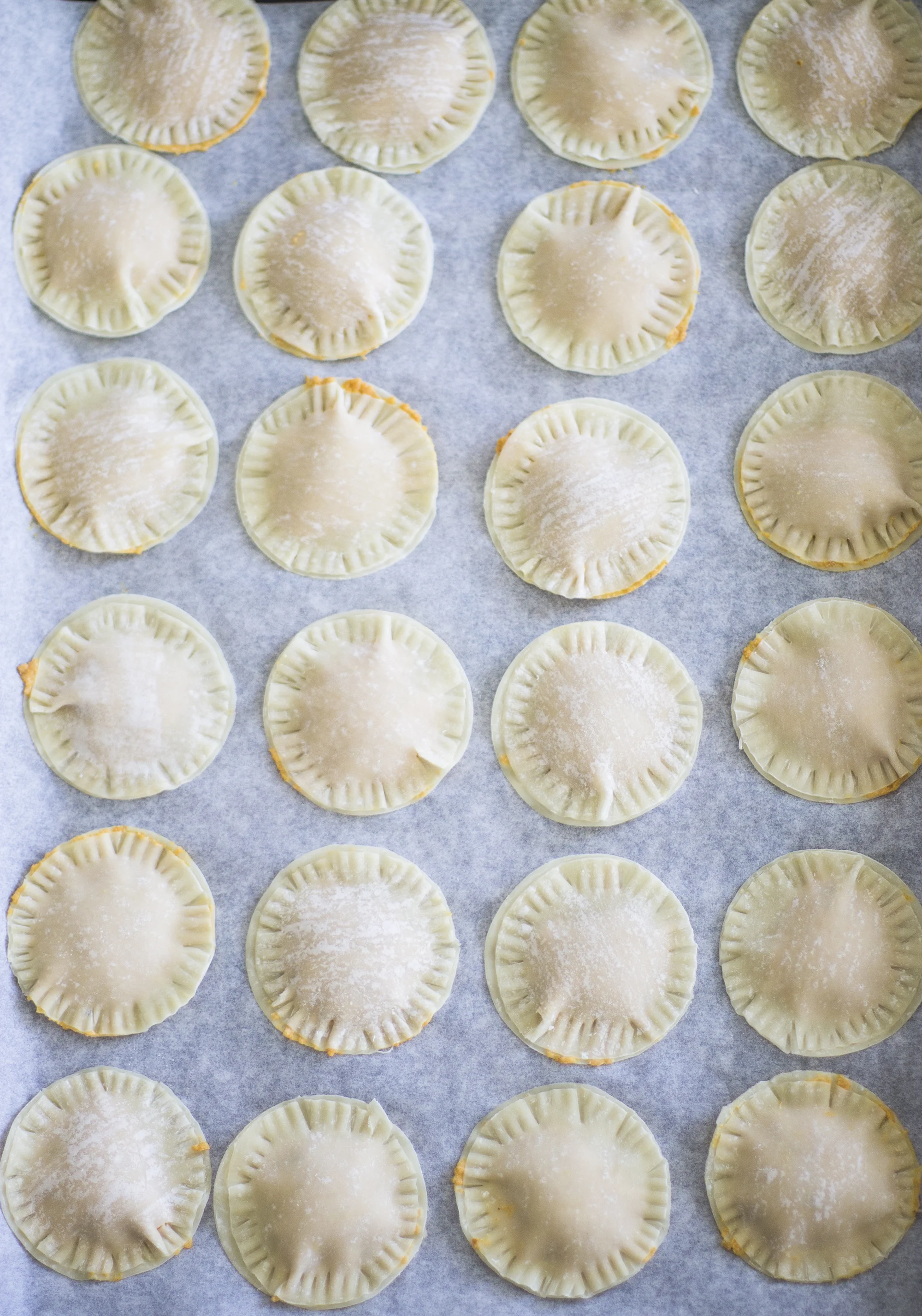 - Place ravioli on a parchment lined baking sheet.