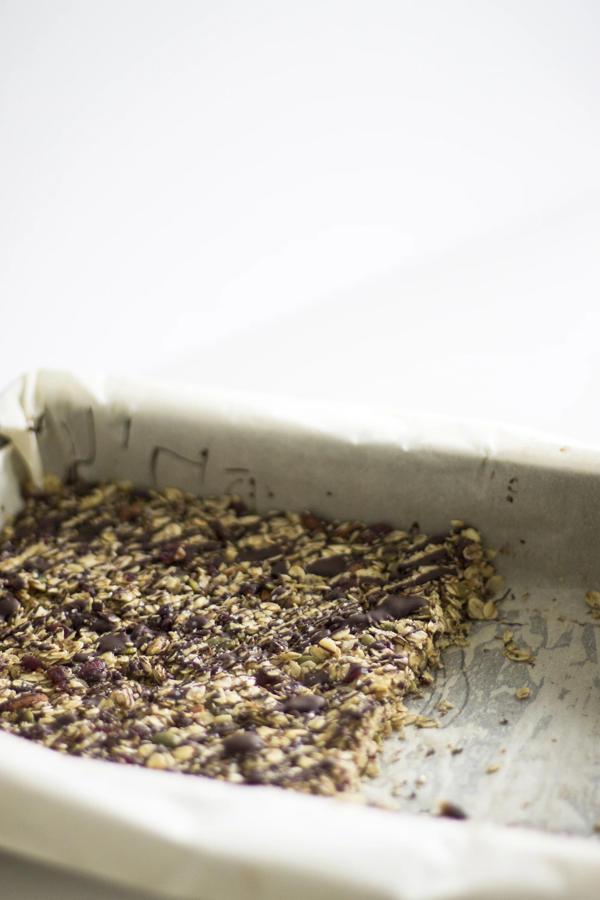 Press granola mixture into one flat layer and pack very tightly together. This is key to the bars staying together, so make sure it's packed tight!