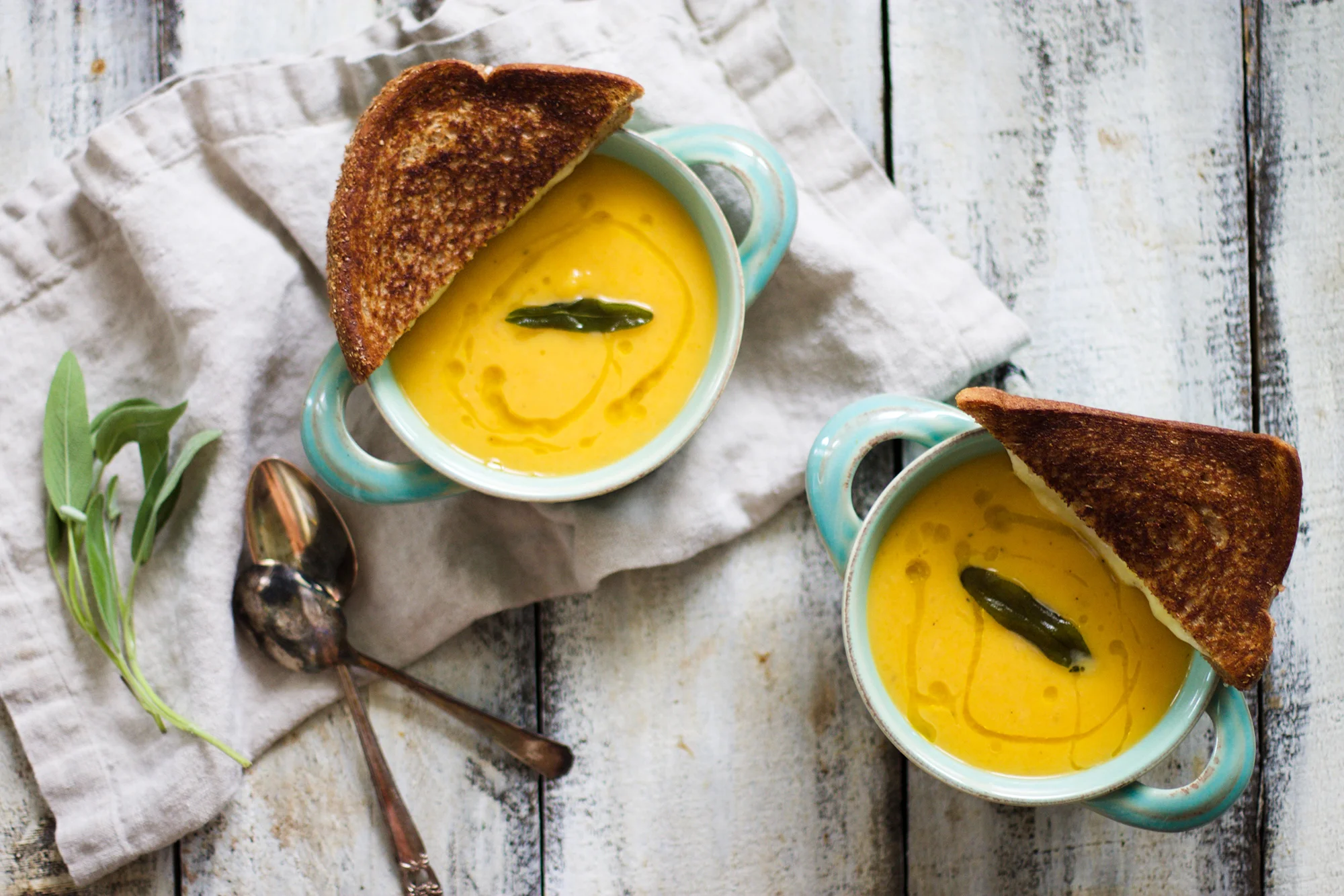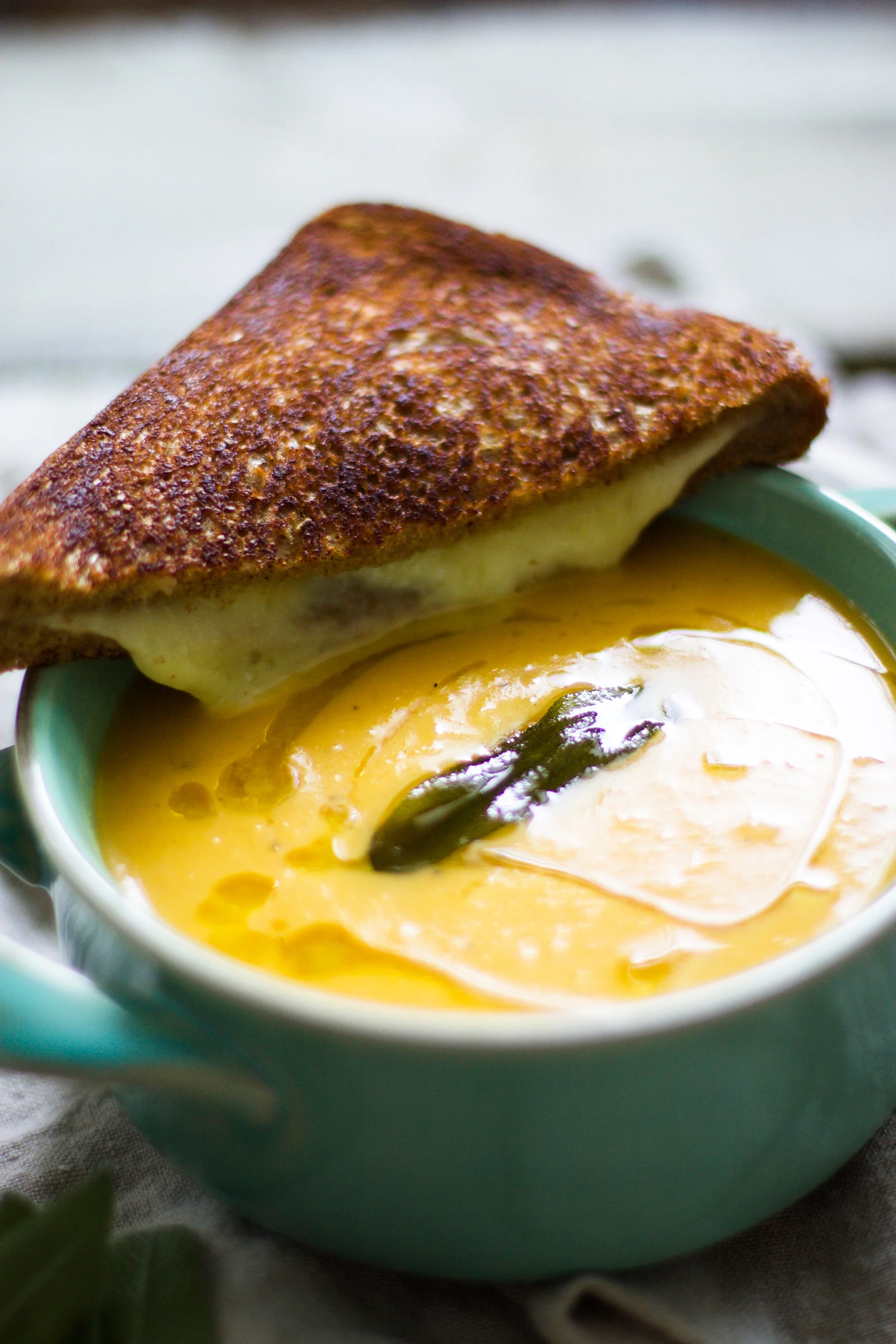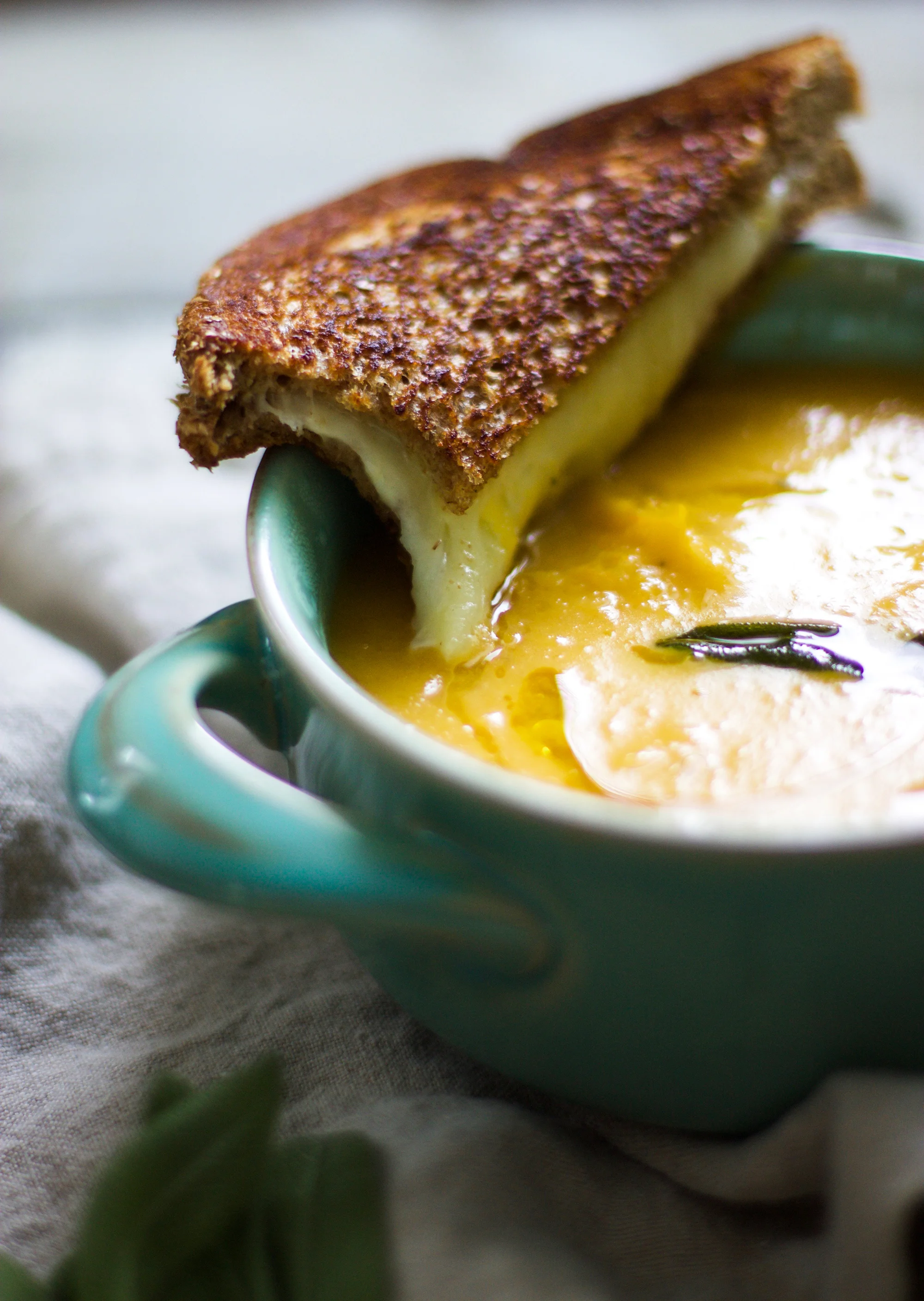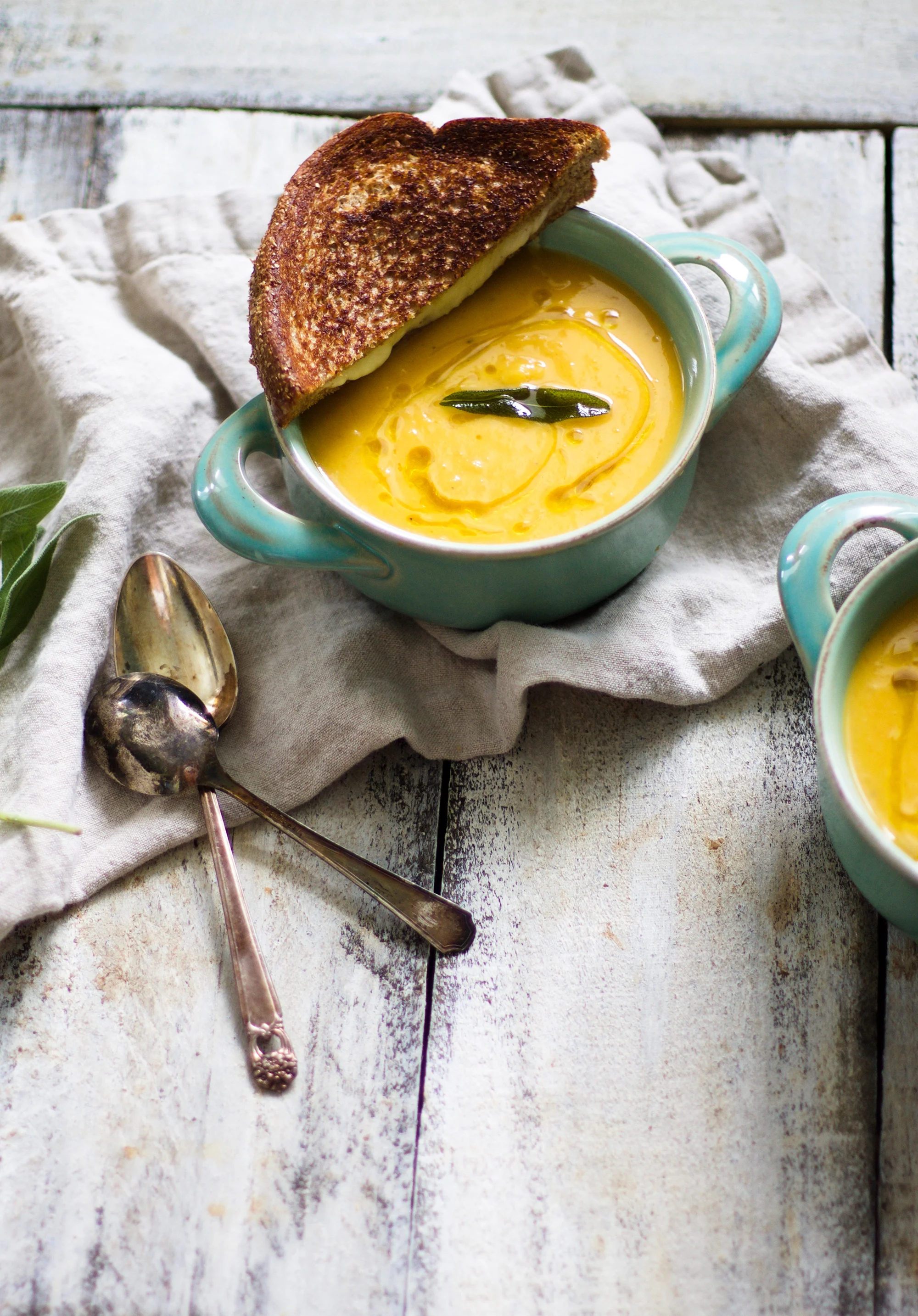 Butternut squash is one of my favorite fall vegetables. I love it in salads, served by itself as a delicious side, or in a soup! In this case, it's the star of my new favorite fall soup! This recipe is super creamy, luscious, and so satisfying in every way possible. Of course I made grilled cheeses to dunk inside our bowls, but if you aren't into that kind of thing, then you can totally omit that part. And by that kind of thing, I mean ooey gooey cheesy deliciousness. I mean go big or go home right?