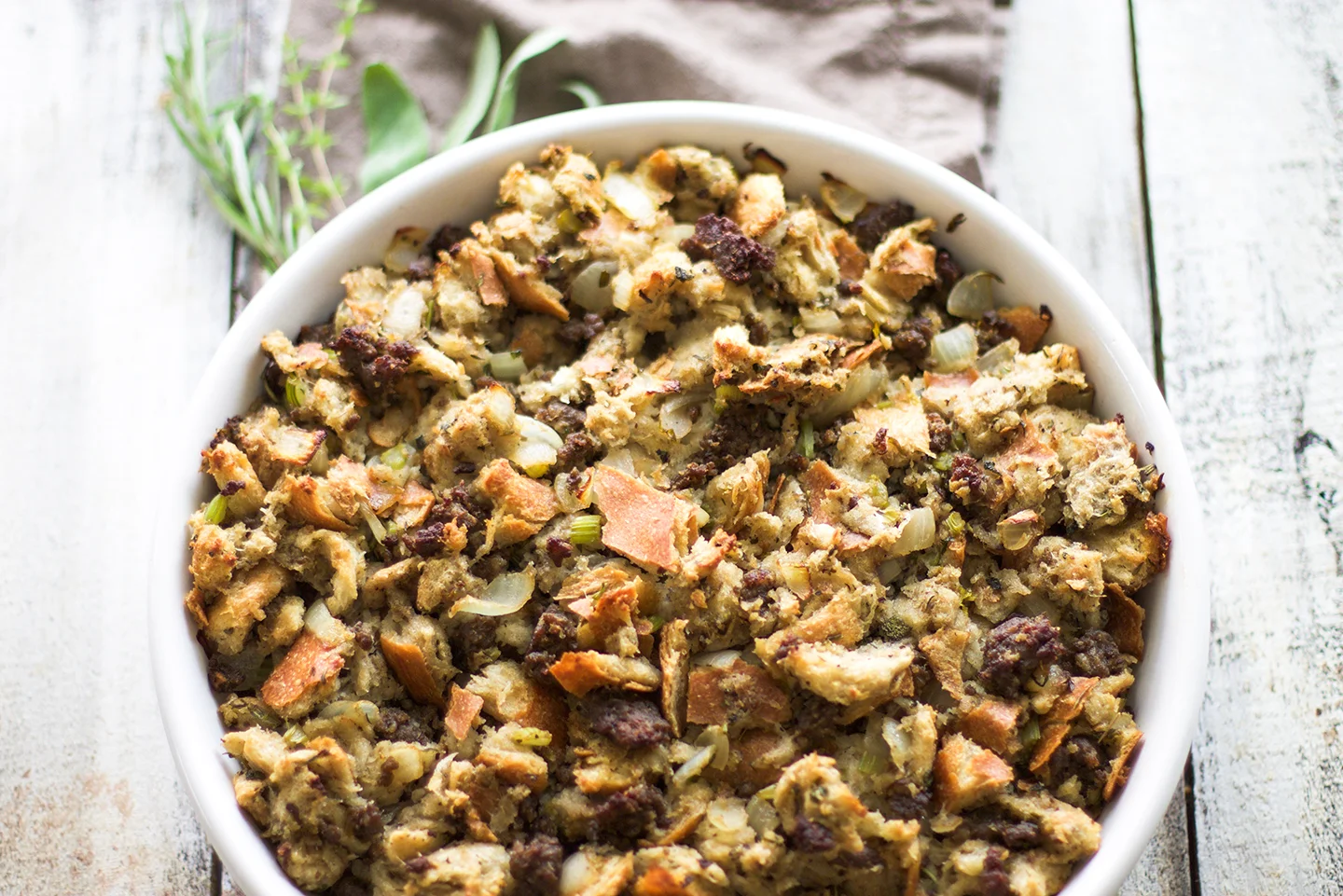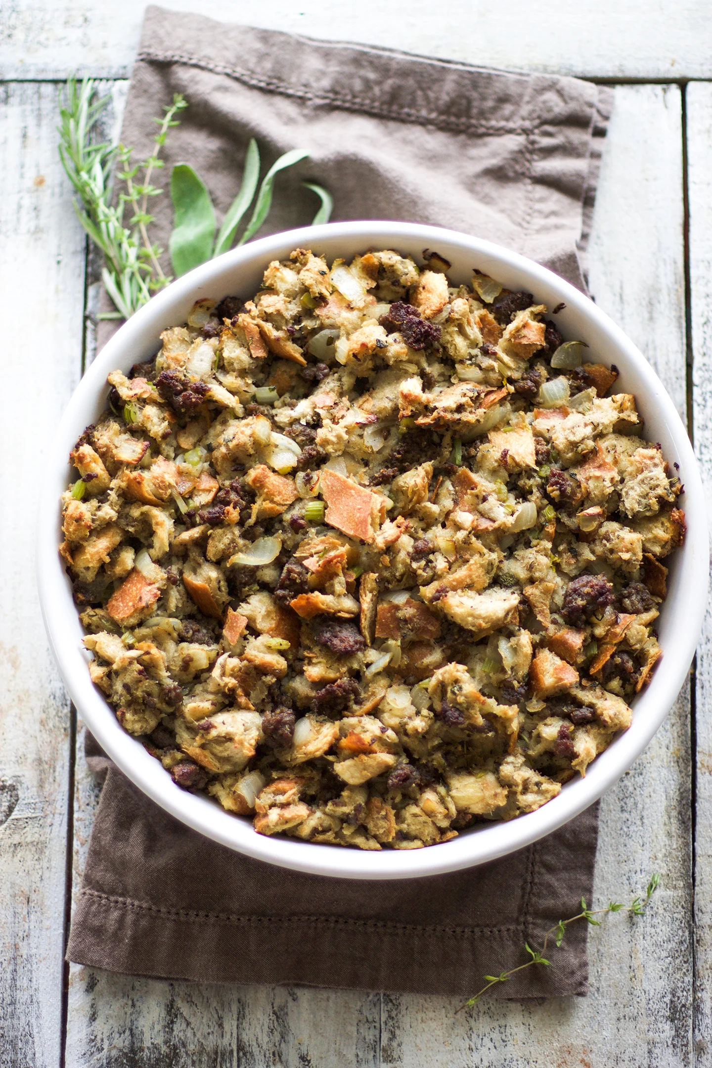 Bread combined with herbs, onions, celery, broth, and savory sausage creates something magical if you ask me, and I have decided I need to make stuffings year round because they are just too delicious to only eat around the holidays! You can tweak this recipe by omitting the sausage if you prefer a meatless stuffing or you can add apples etc. to make it your own! However you do it, I can assure you that it will be delicious and you can make it ahead and simply bake the day of to relieve a little Thanksgiving day stress in the kitchen!
