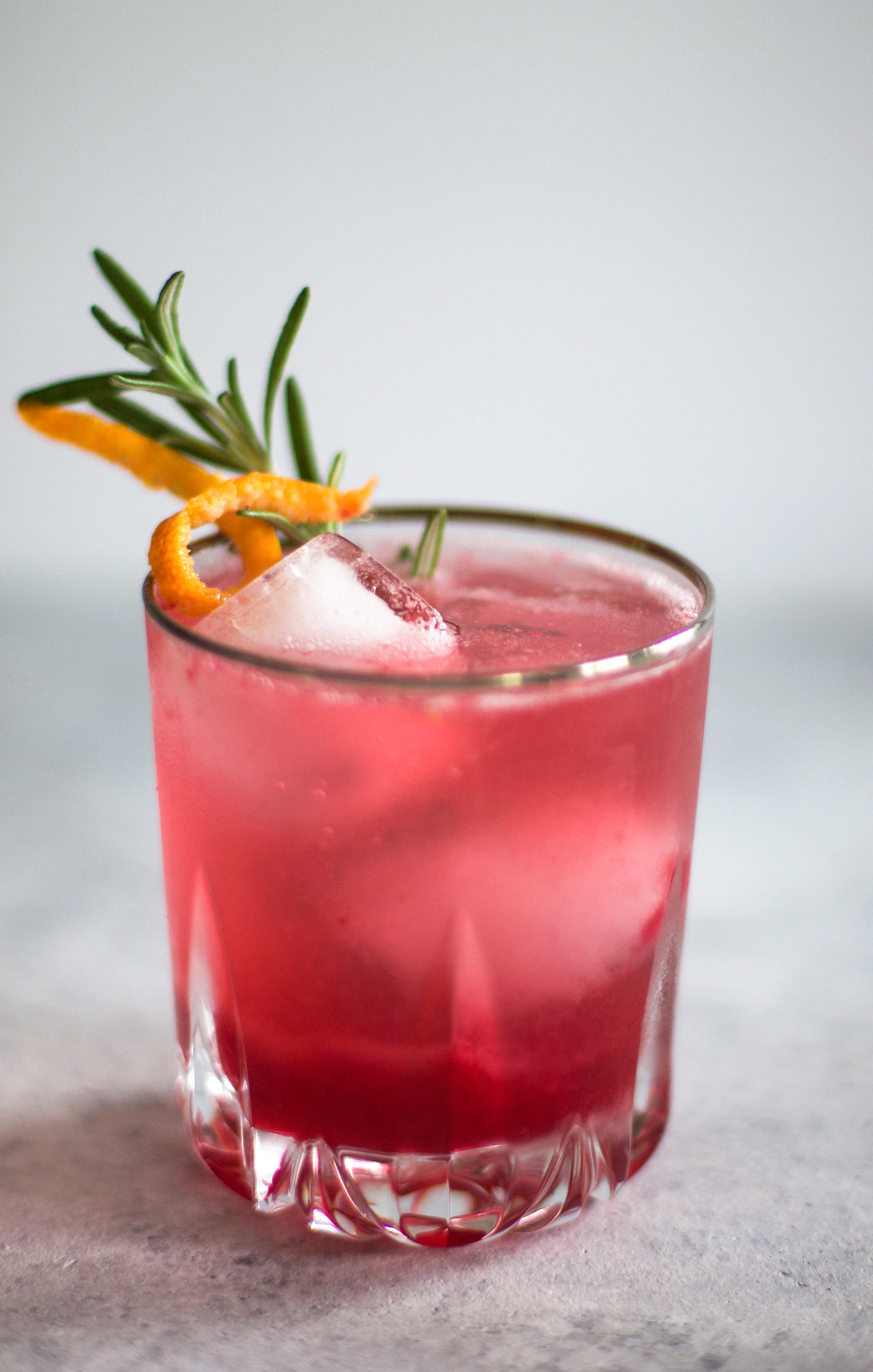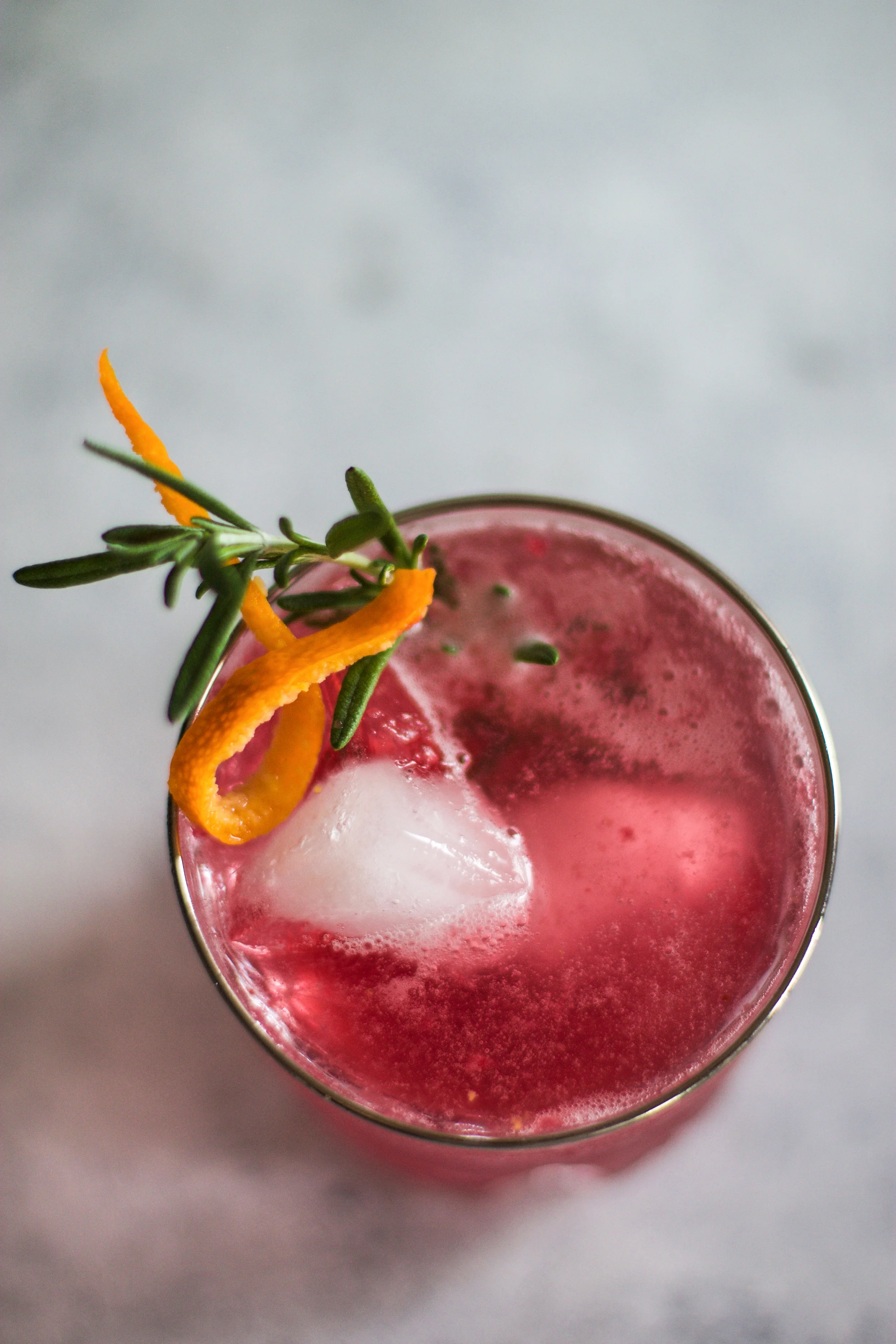 Garnish with orange peel and rosemary.