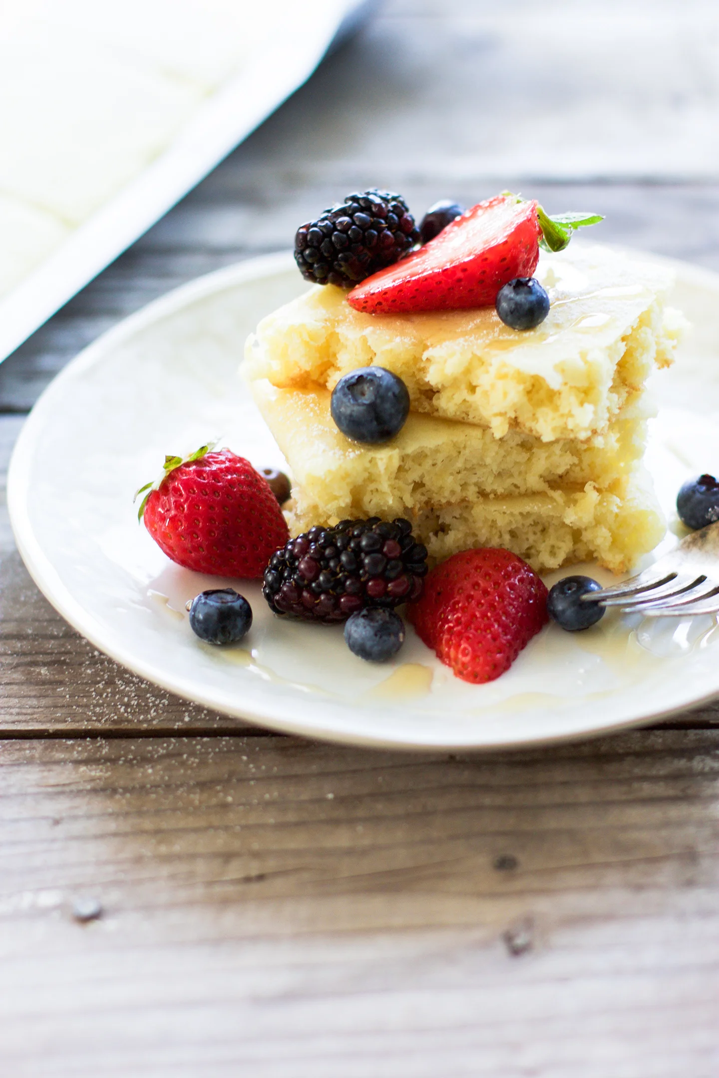 I can't wait for you to give this method a try and this weekend would be the perfect time to test it out! This recipe is a basic pancake recipe, but would be great turned into blueberry sheet pan pancakes or even more seasonally appropriate, pumpkin pancakes!
