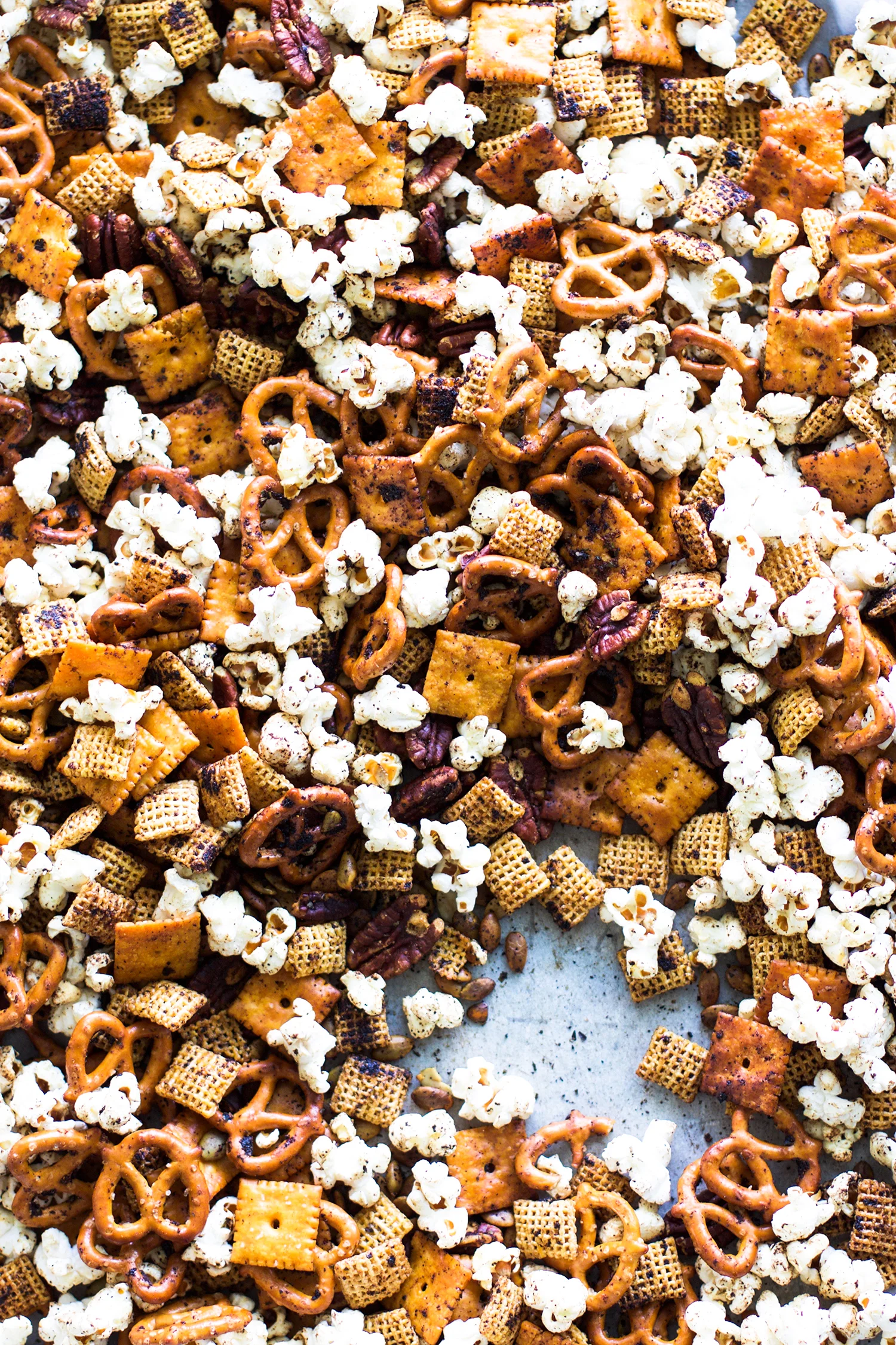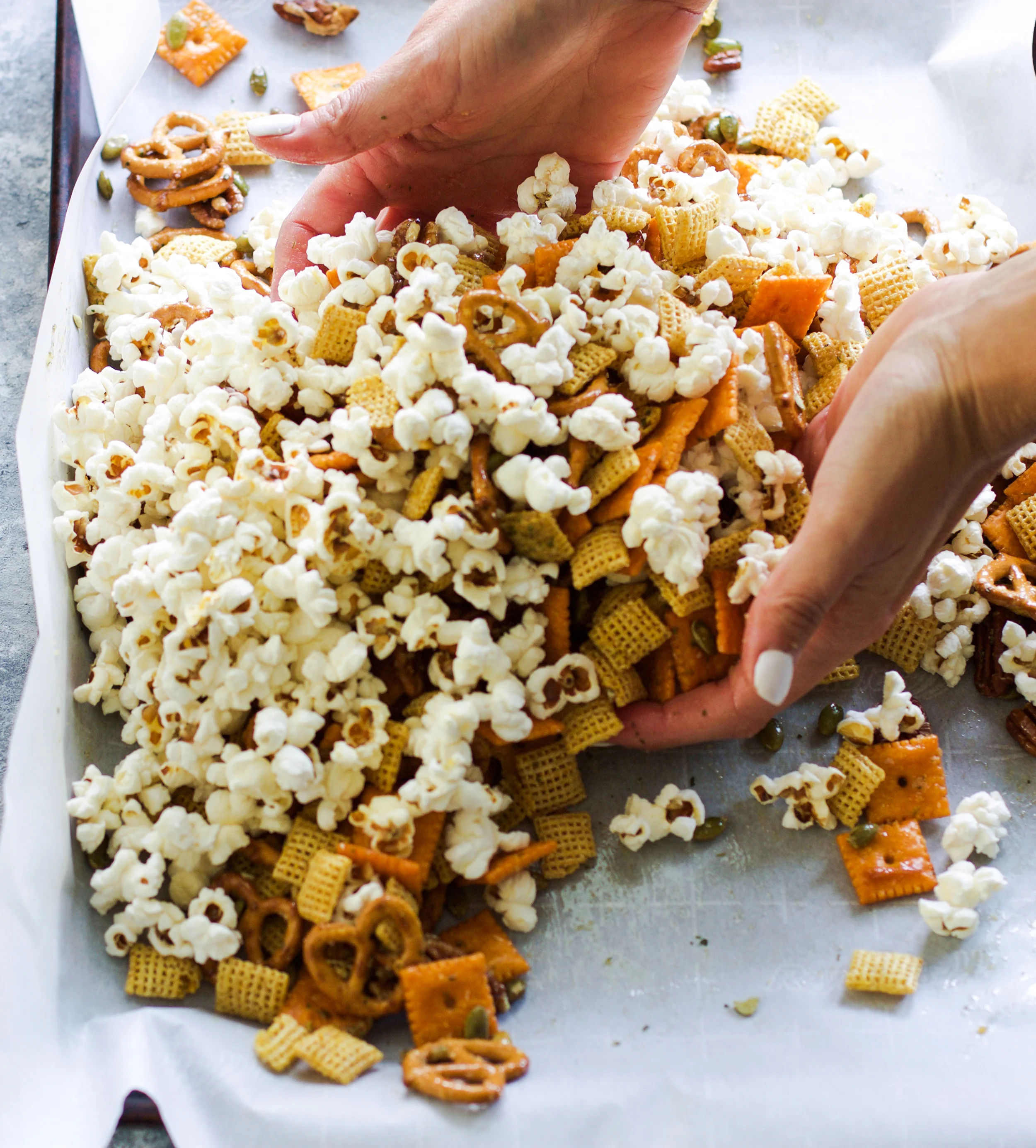 - Place pretzels, cheese crackers, corn chex, pumpkin seeds, and pecans onto a baking sheet leaving the popcorn separate.