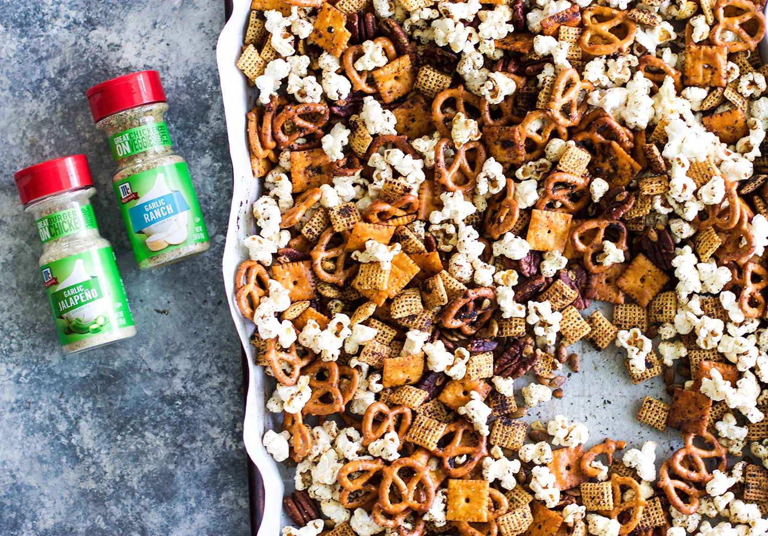 I love a good snack mix, and actually can't be trusted around it whenever I make it! I love finding new ways to kick up the flavor a notch and with McCormick's new Garlic Blends, it was pretty easy to achieve a seriously addicting mix! What I love about these spice blends, is that they can be used anywhere you would normally use garlic powder! Simply add the Garlic Blend before, during, or after cooking to add an extra flavor boost! It's just that easy! These blends are now available at Walmart and come in Garlic Ranch or Garlic Jalapeño (for those of you feeling spicy)! These new blends are the perfect way to bring garlic flavor to the next level in your cooking! McCormick Garlic Seasoning Blends take the guesswork out of recipe free cooking and who doesn't want that?