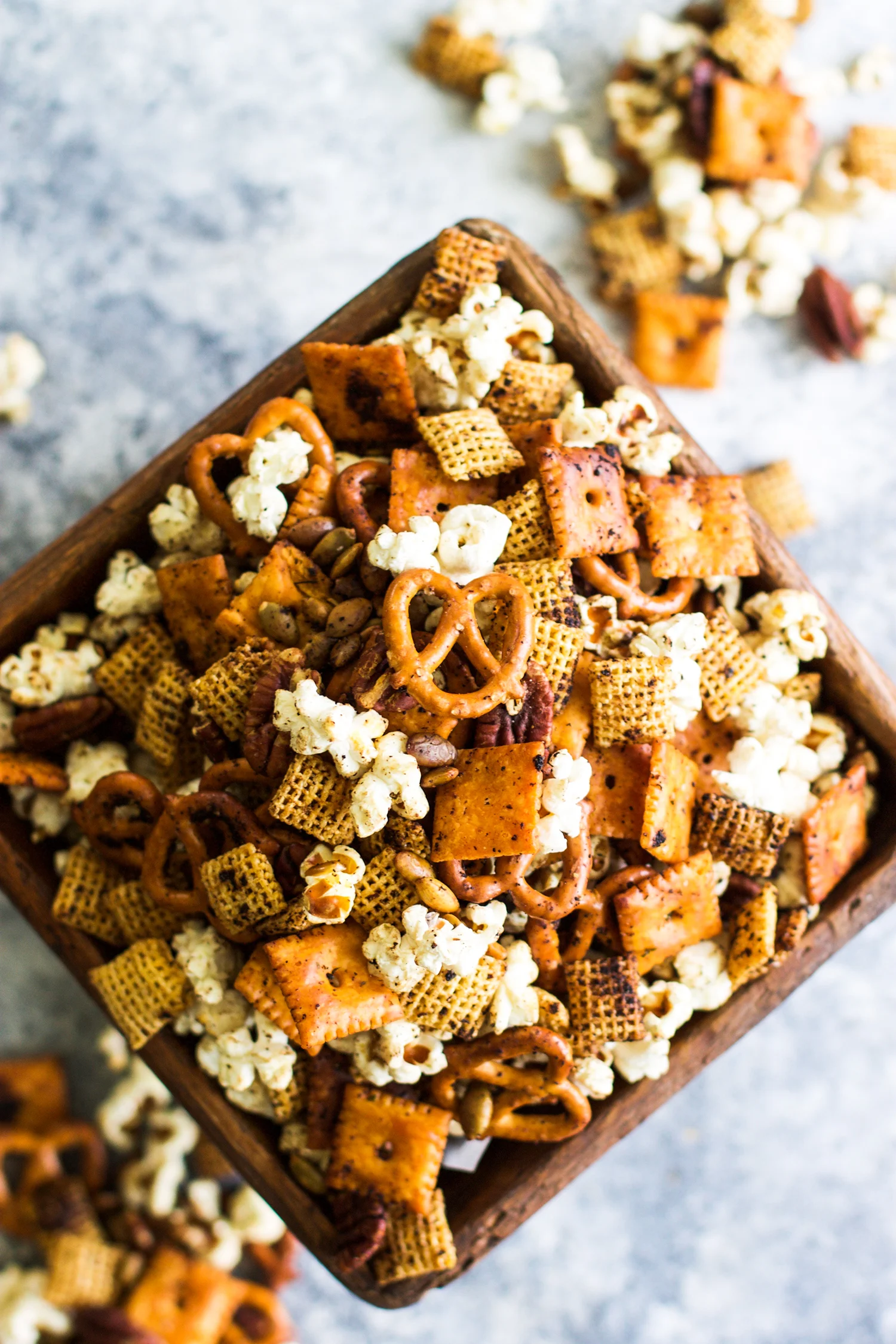 - Sprinkle the popcorn over top of the snack mix and toss slightly (so the popcorn is just coated slightly.)