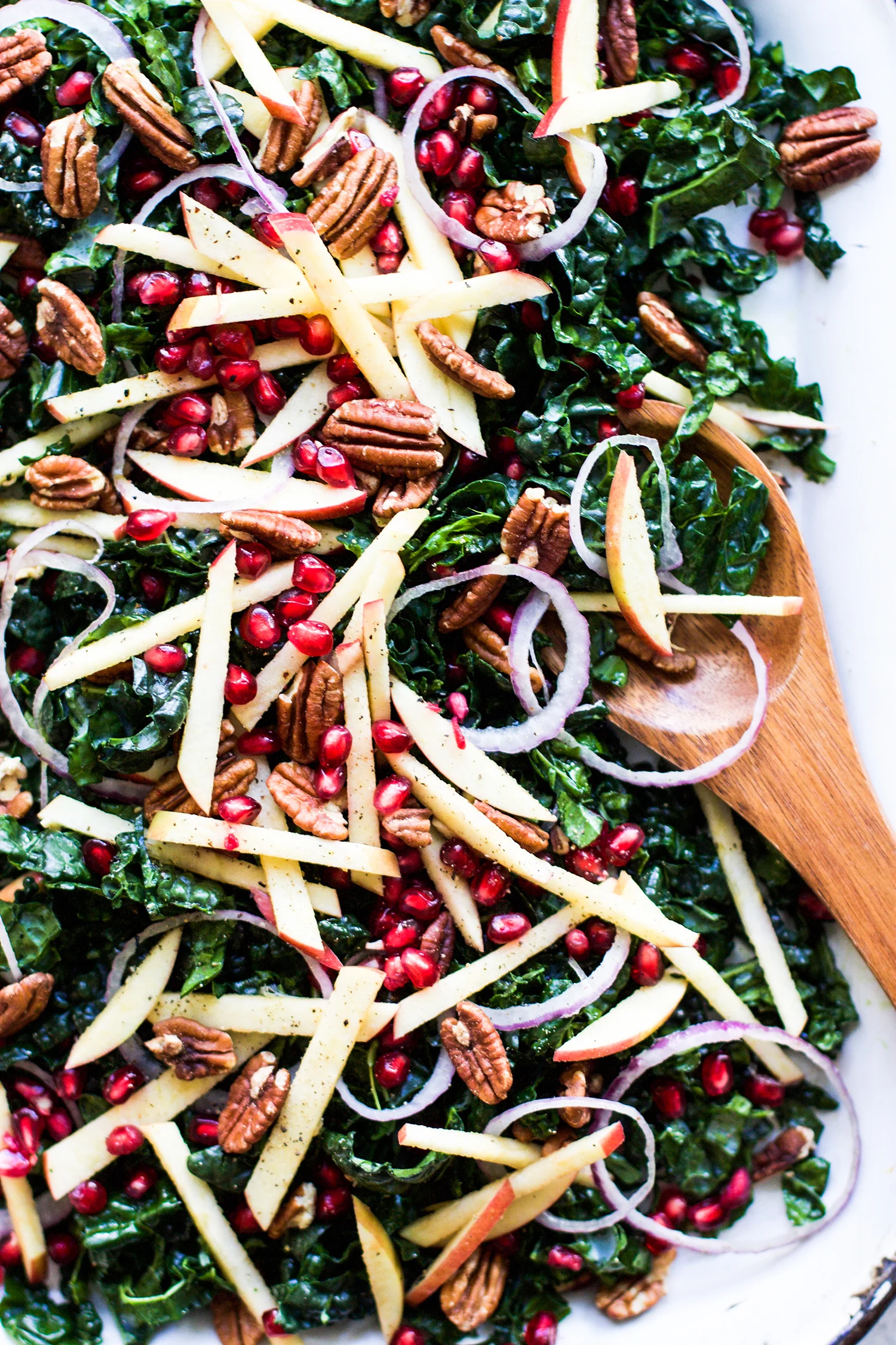 It's official we are in countdown mode until Thanksgiving and I am planning the last of my menu as we speak! Of course there will be turkey, sweet potatoes, and other indulgent foods so I always like to balance those dishes out with a few lighter sides as well! I'm all about a little balance at the table so I can feel good about indulging on a few of my favorites! My apple, kale, and pomegranate salad with apple cider vinaigrette is the perfect salad to add to your Thanksgiving menu this year and everyone will love it!