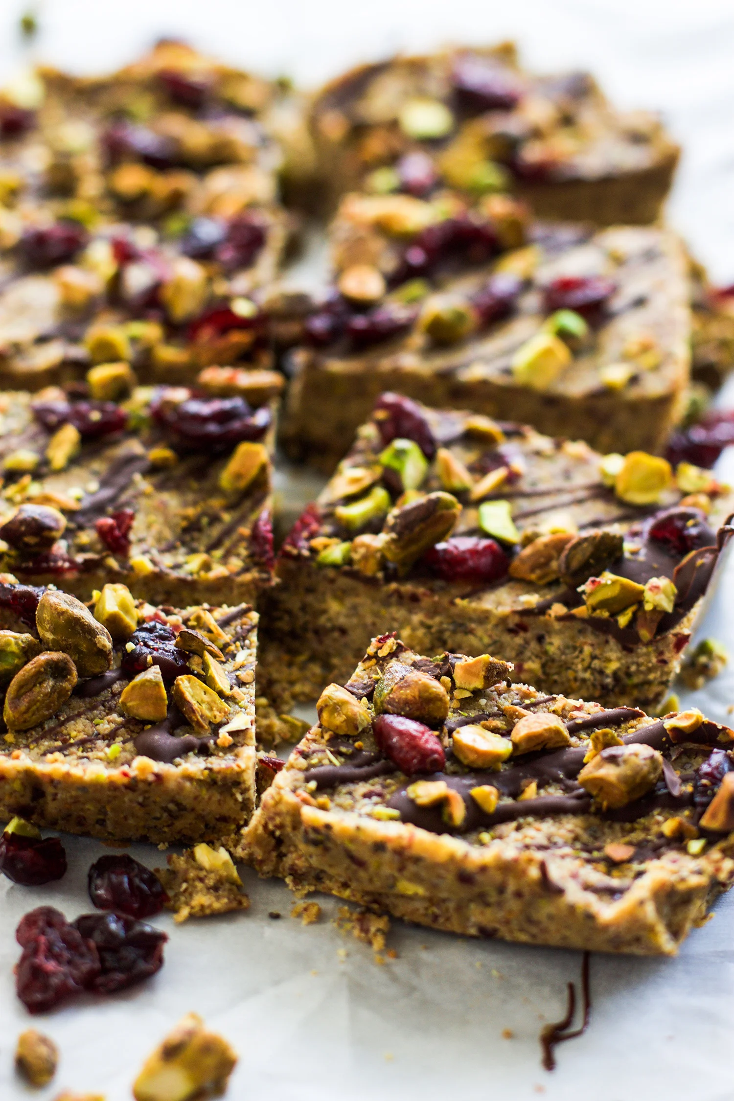 - Drizzle the bars with the melted chocolate and sprinkle with a few chopped pistachios and cranberries.