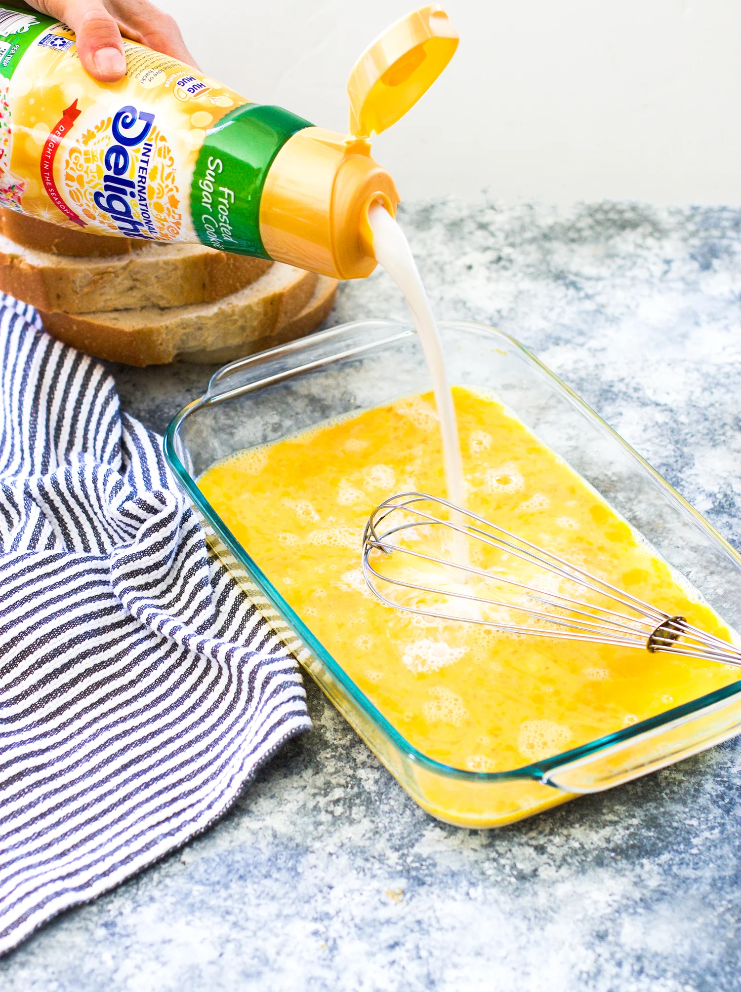 Whisk together eggs, International Delight® Frosted Sugar Cookie Coffee Creamer, and vanilla in a baking dish until well combined.