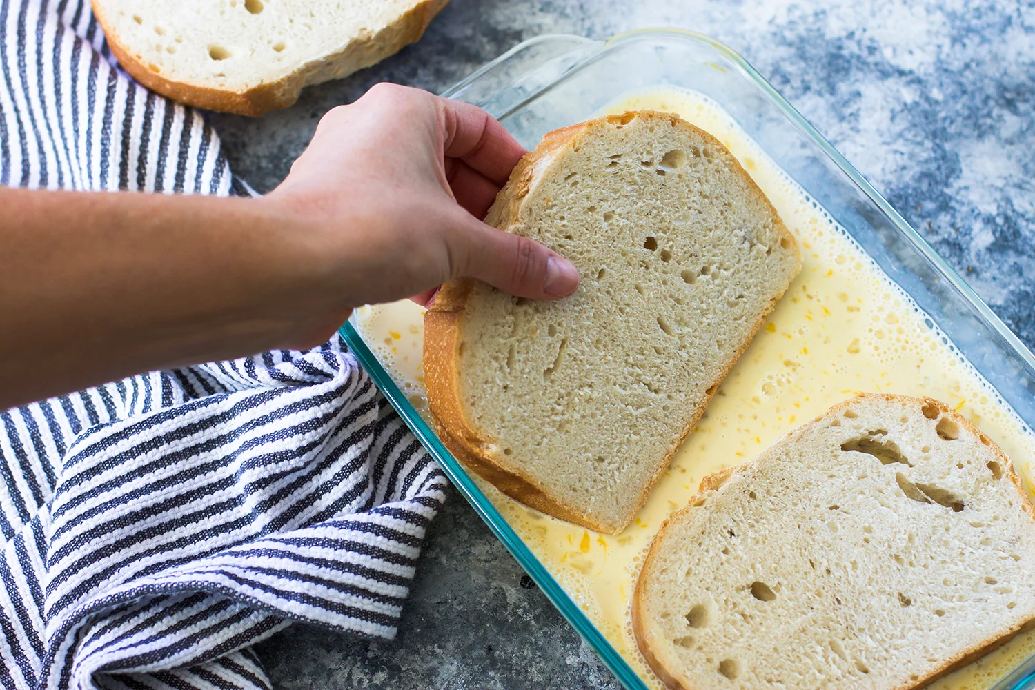 Place two pieces of the bread into the liquid for 2-3 minutes per side until bread has been soaked through but isn't soggy.