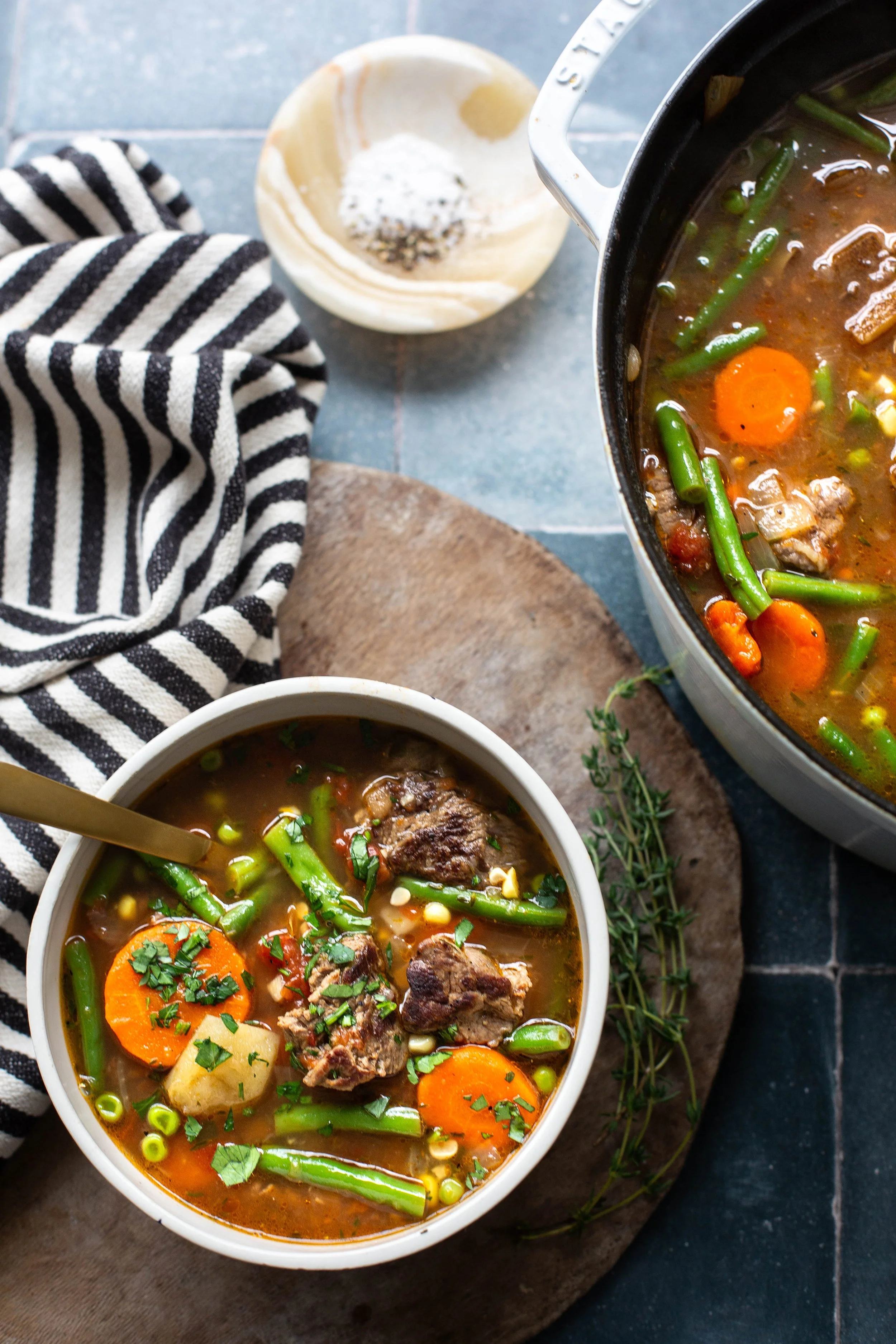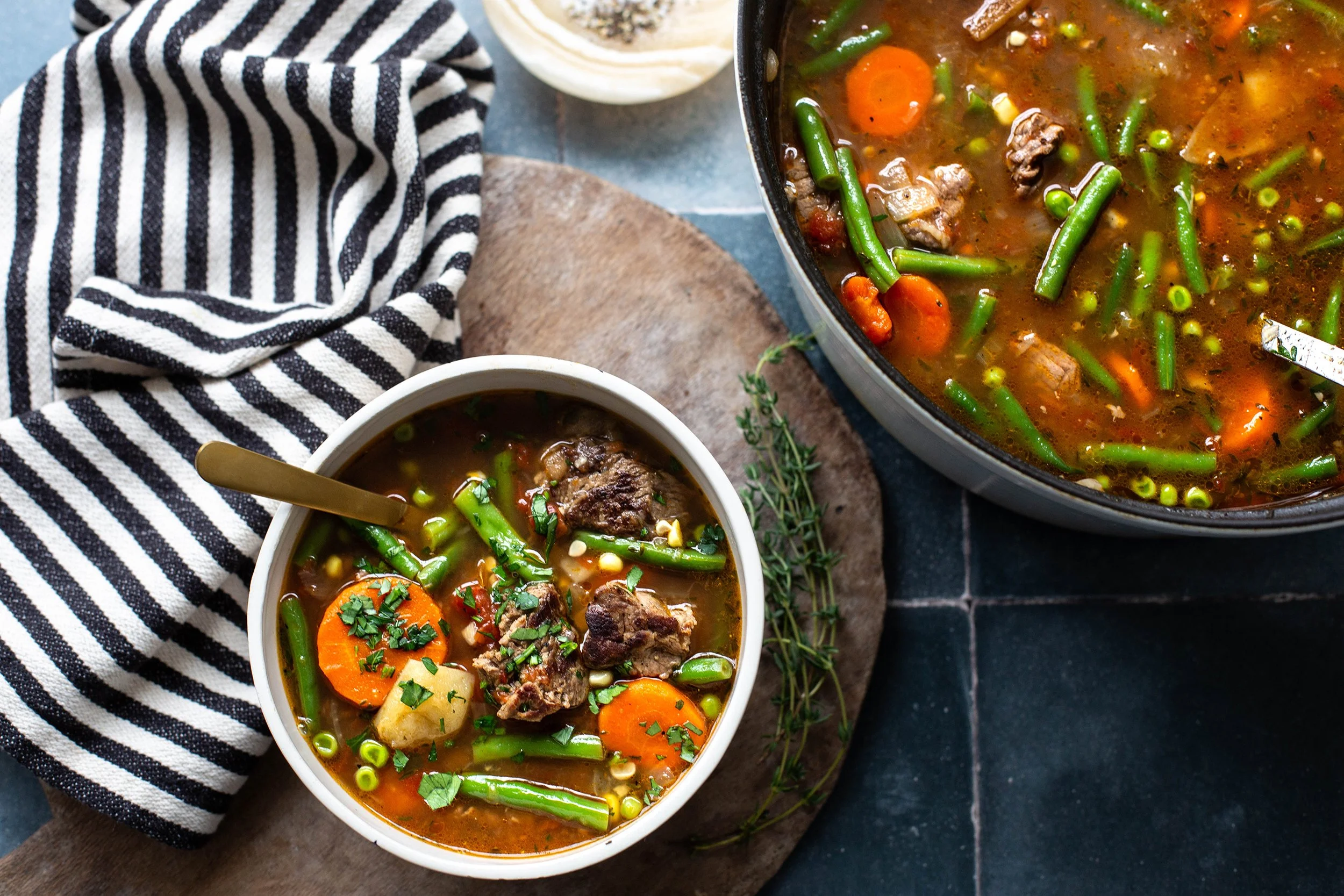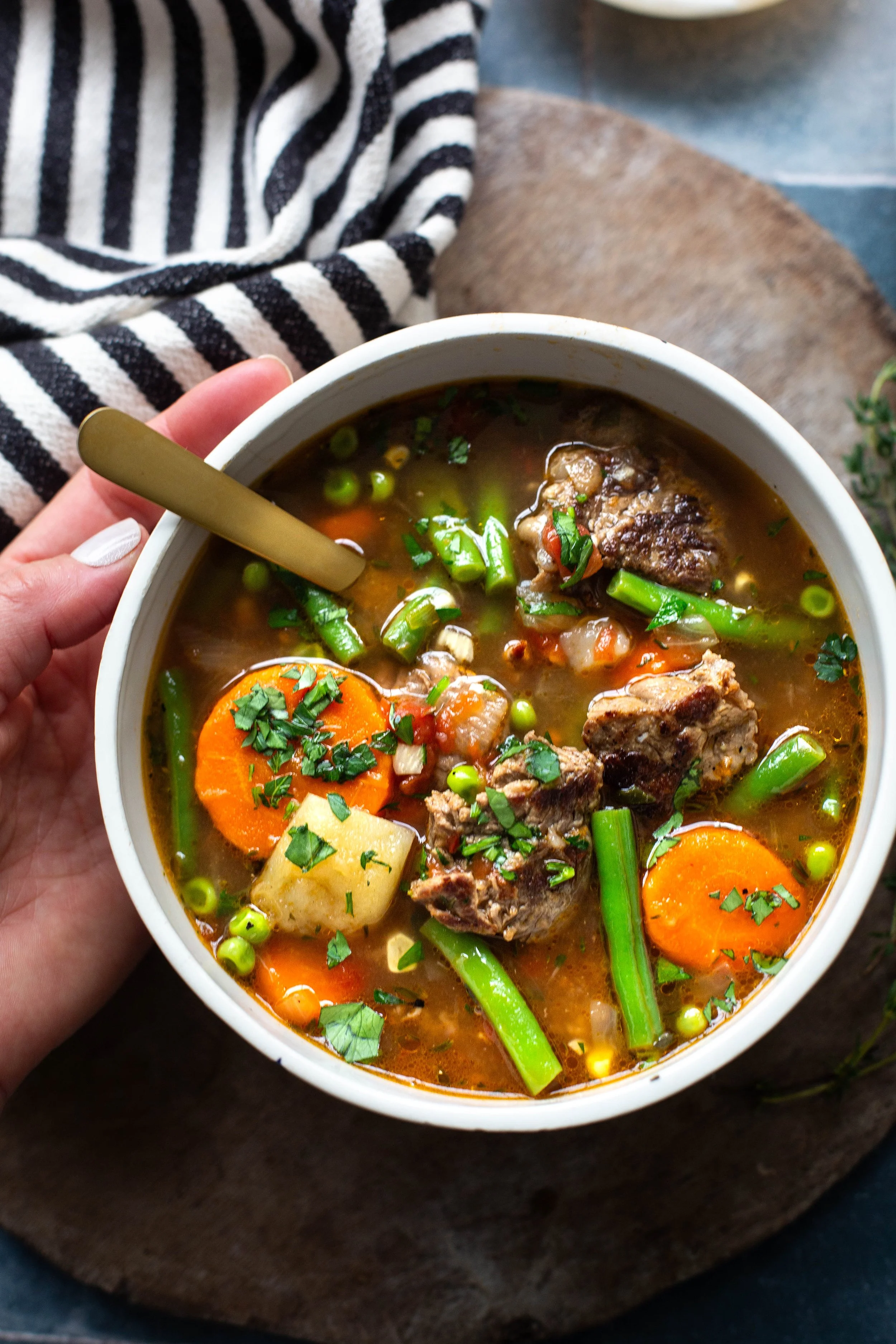 Happy New Year Friends! We have literally been out of town for almost a full two weeks and I am slowly getting back into the swing of things. Not to mention that it is COLD here in Texas, which basically never happens, and I know what you northerners are thinking...it can't be that cold, but guys...the temp went down to 23 degrees last night! I don't care where you live, that is cold, especially to those of us who are used to mild winters! So while I am definitely hopping back on the healthy food wagon this week, I need some stick to your bones kinda food...because hello cold weather! My homemade beef and vegetable soup is exactly the kind of meal that we all need in our lives right about now and you need to make it ASAP!