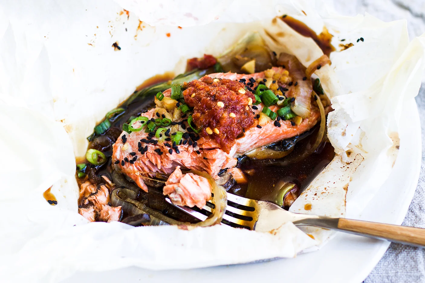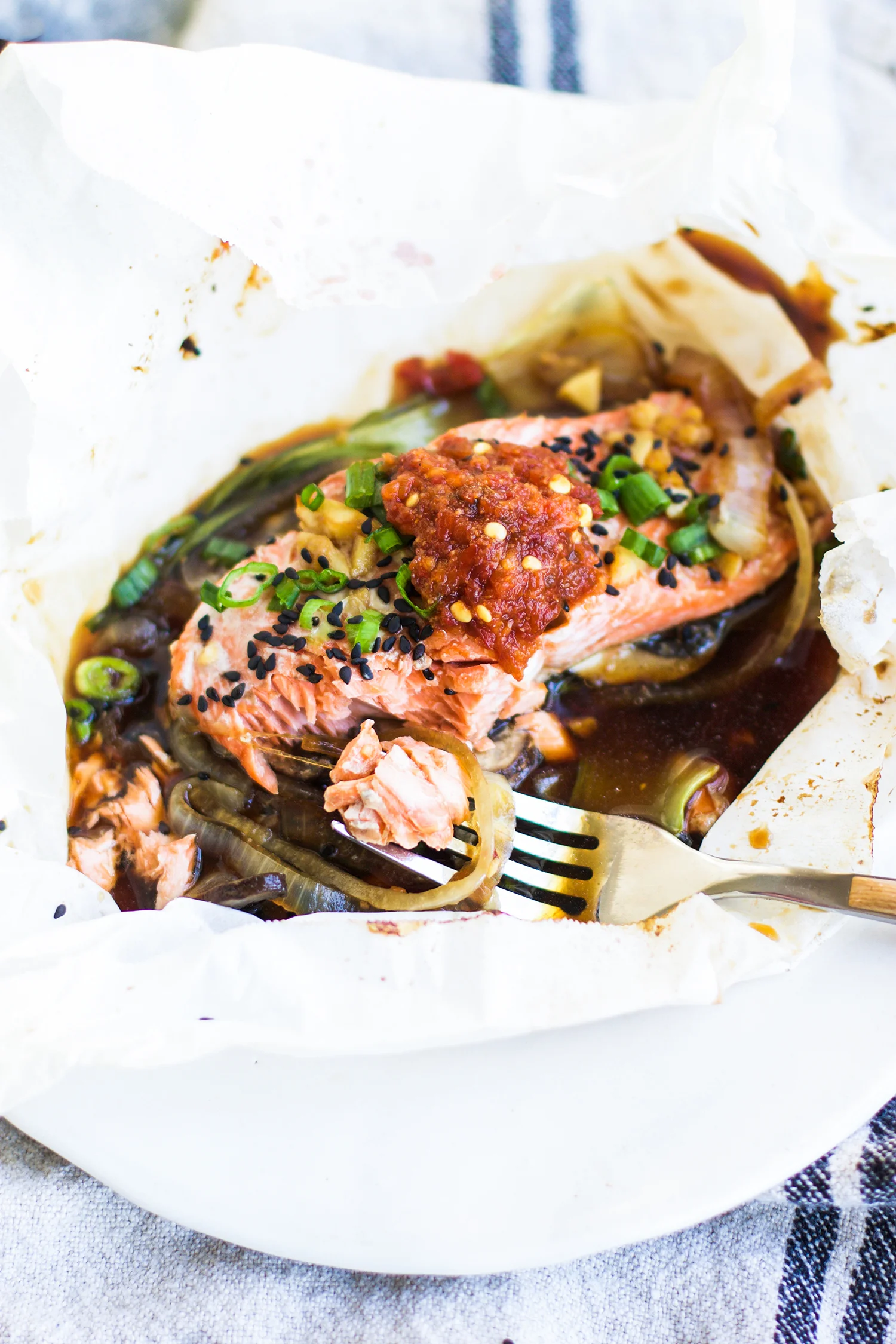 - Take out of the oven and undo parchment paper and sprinkle with green onions, sesame seeds, and a dollop of chili sauce.