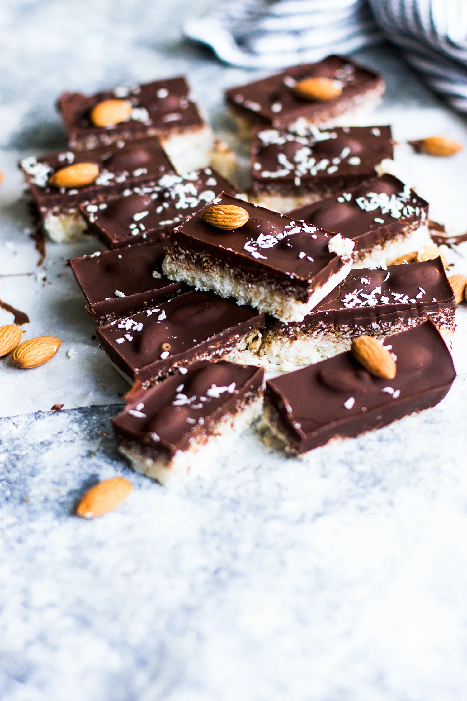Layer two almonds in a row, an inch a part vertically and horizontally over the coconut mixture so that two almonds will be in each bar.