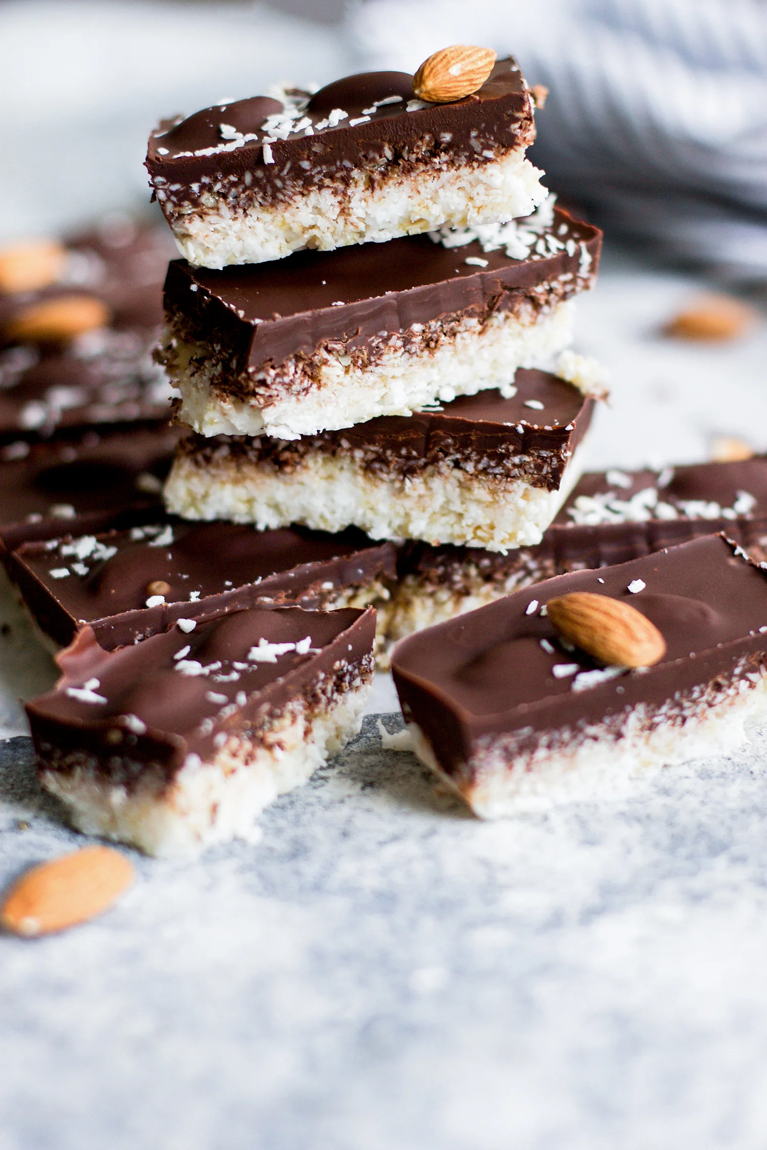 As we were driving back from Louisiana over the weekend, we stopped at a gas station and my hubby came back to the car with a pack of Almond Joys. They are 100% his favorite candy bar and so after I rolled my eyes at him (because my sweet tooth can't be stopped when candy is present) we all split that Almond Joy and I have to admit, it tasted amazing. But as I was eating it I was thinking about how simple it would be to make that same candy bar right in my own kitchen with minimal ingredients that aren't terrible for us to enjoy and then I wouldn't have to feel any guilt about satisfying my chocolate craving! My recipe for 5 ingredient healthier almond joys are so delicious that you will never miss the real thing!