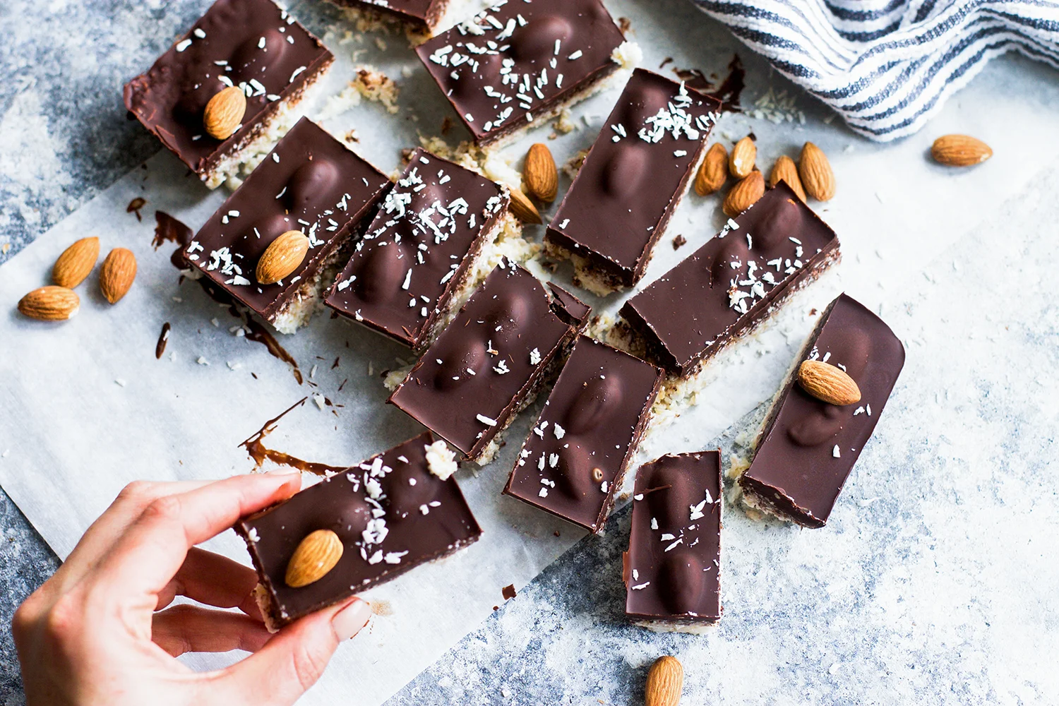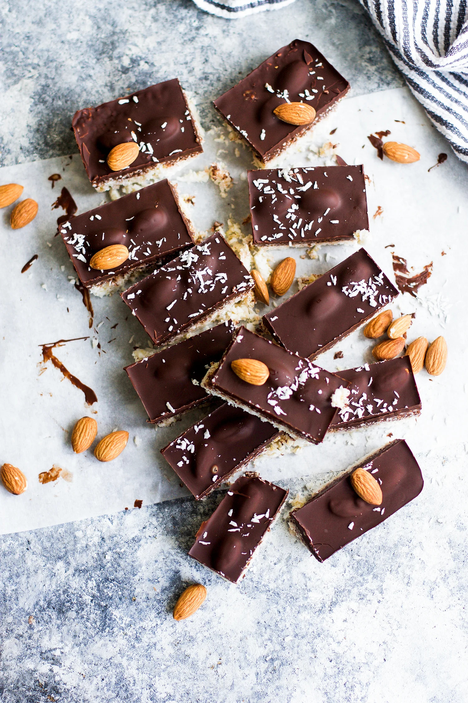 Pour the melted chocolate over the almonds and coconut mixture and use a spoon or spatula to make sure the chocolate fully coats the top in a solid layer.