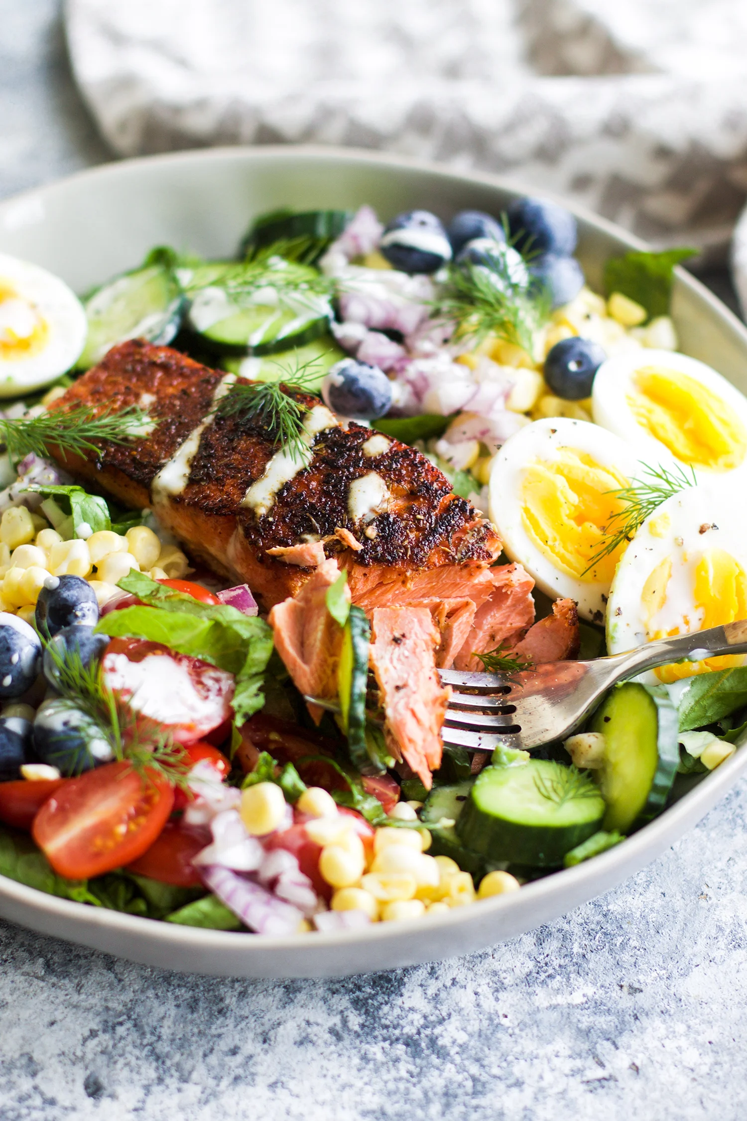 Spicy salmon, cool cucumbers, crunchy lettuce, a little sweet from a few blueberries, and a homemade ranch dressing to top it all off makes for one killer bowl of goodness! Salads are all about texture for me, and this one has all of the bases covered in that department! The weather has been crisp this week and has me craving all of the fresh and healthy foods just like this recipe!